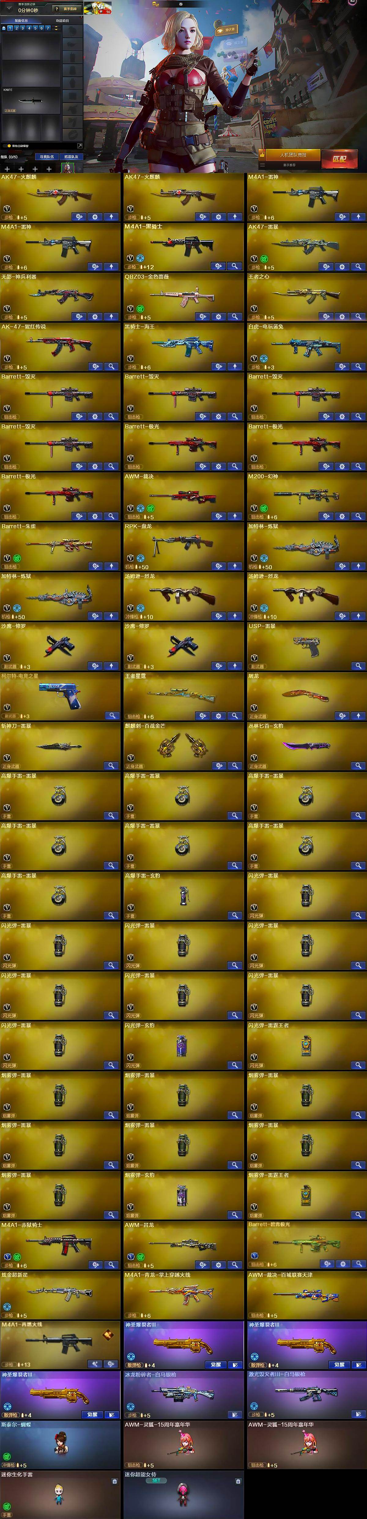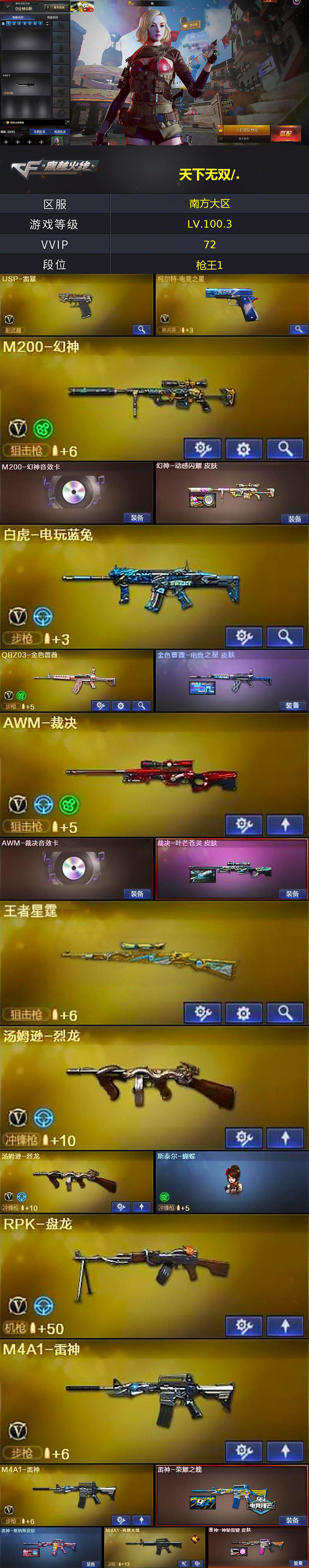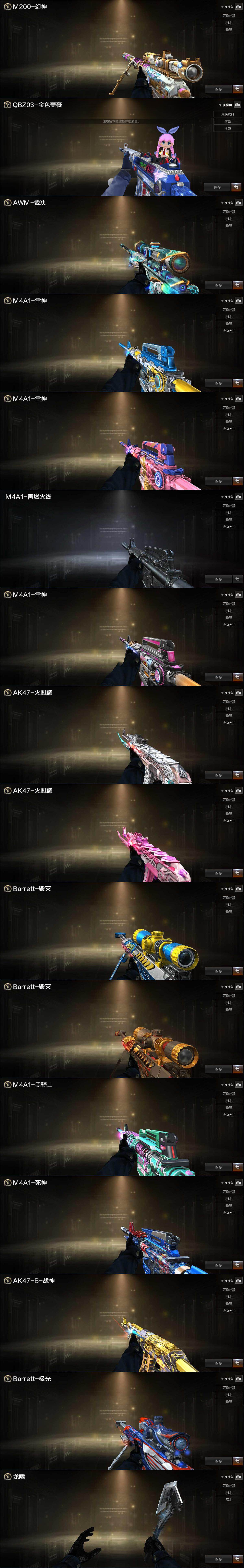 【热门武器】:QBZ03-金色蔷薇,M200-幻神,白虎-电玩蓝兔,M4A1-黑骑士,汤姆逊-烈龙*2,RPK-盘龙,加特林-炼狱*2,斯泰尔-蝴蝶,USP-雷暴,沙鹰-修罗*2