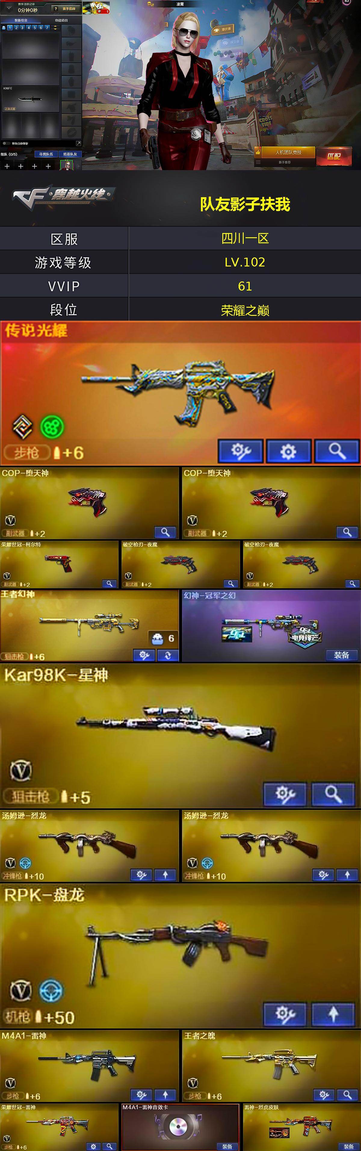 【热门武器】:传说光耀,王者幻神,死亡之眼,荣耀世冠-雷神,荣耀世冠-柯尔特,Kar98K-星神,M4A1-黑骑士,汤姆逊-烈龙*2,RPK-盘龙,加特林-炼狱,COP-堕天神*2,沙鹰-修罗*2