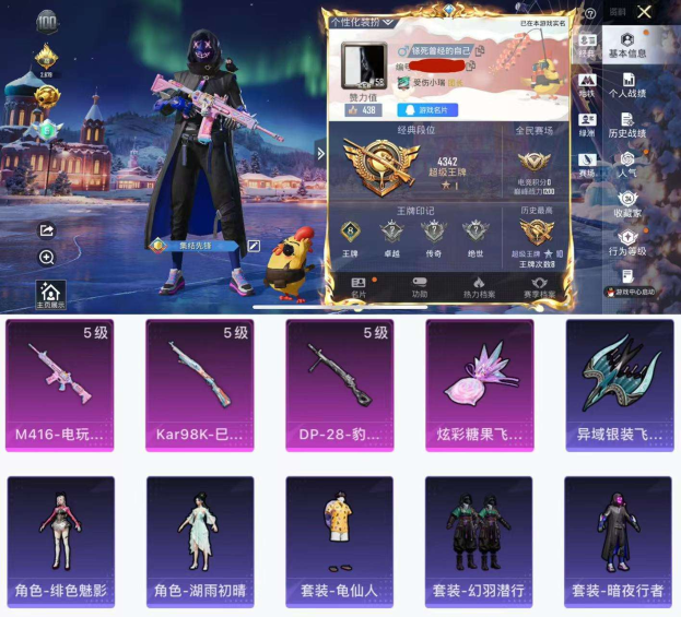 枪8王牌印记-暗夜行者 角色-绯色魅影 角色-湖雨初晴 暗夜行者 身法素材号】Q等级35(2太阳)可二次-苹果Q-3特效枪4热门69套装89枪皮 26102热力值 8印记 历史超级王牌10星 【3特效枪】 M416-电玩时刻 (5级) Kar98K-巳巳如意 (5级) DP-28-豹影疾电 (5级) 【4热门】角色-绯色魅影 角色-湖雨初晴 龟仙人 暗夜行者 粉红小猪 破蛋小