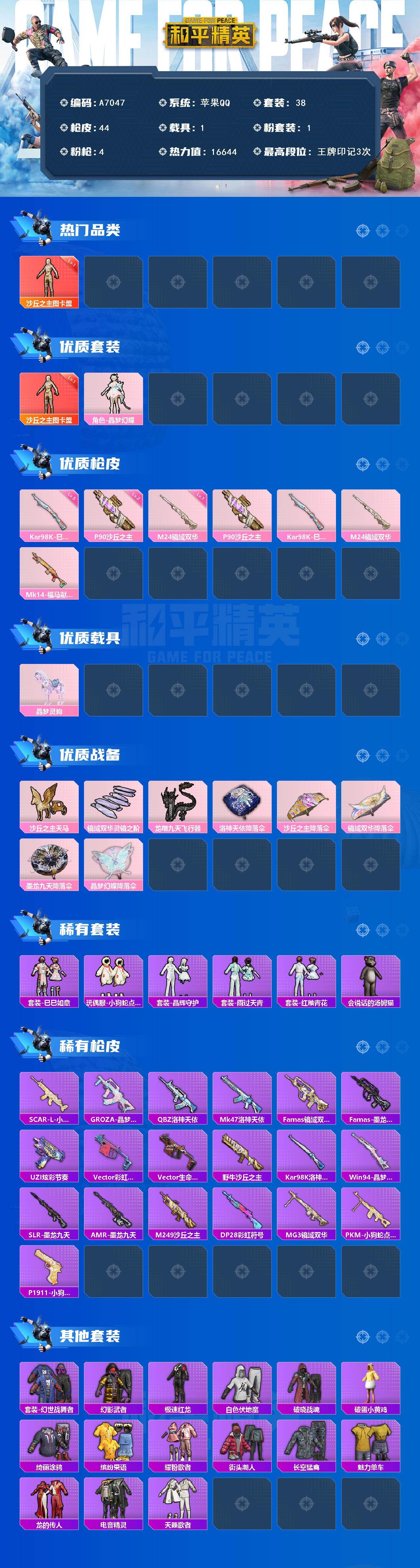 【A7047】苹果 【沙丘之主-图卡盟(一级)/晶梦灵驹】手Q-1神装-1粉装-4特效枪-1载具-3粉色飞行器-16644热力值-3王牌印记-38套装-44枪皮