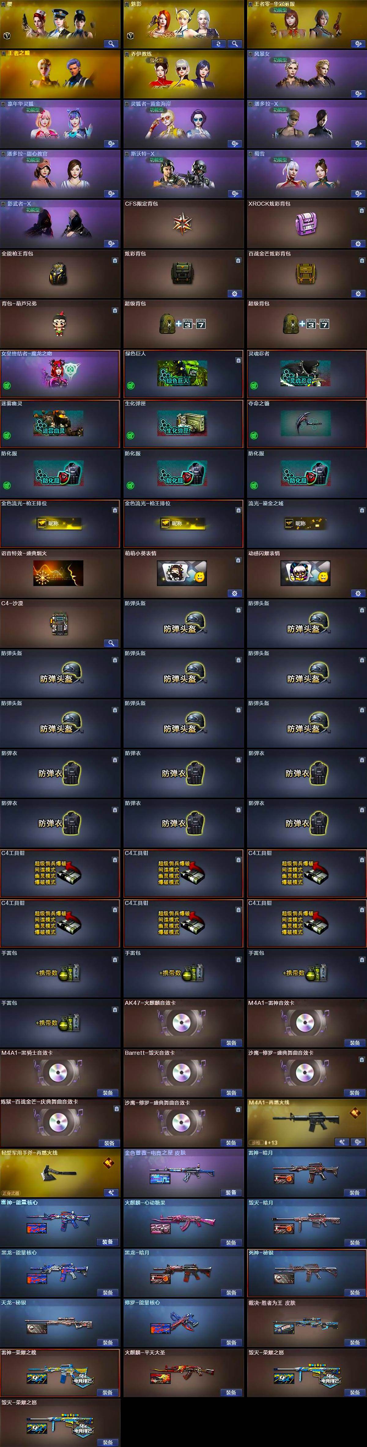 【音效卡】:AK47-火麒麟音效卡,M4A1-雷神音效卡,M4A1-黑骑士音效卡,Barrett-毁灭音效卡,沙鹰-修罗-盛典舞曲音效卡*2,炼狱-百战金芒-庆典舞曲