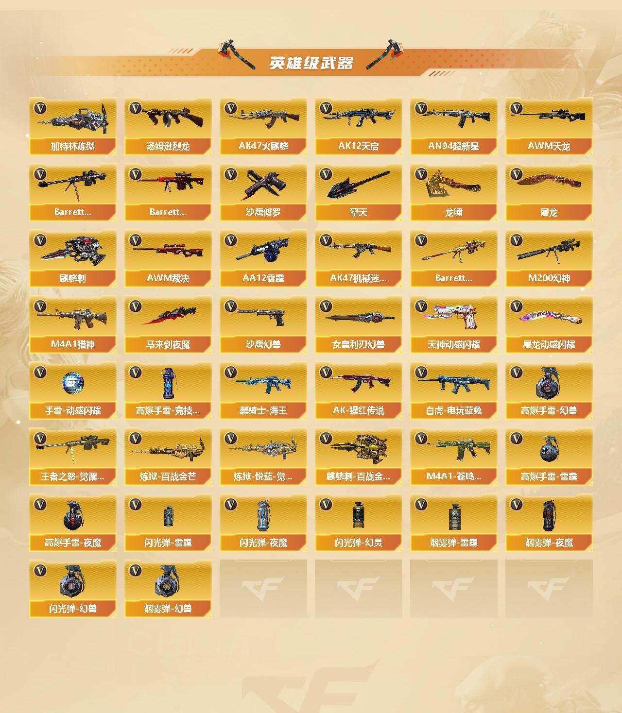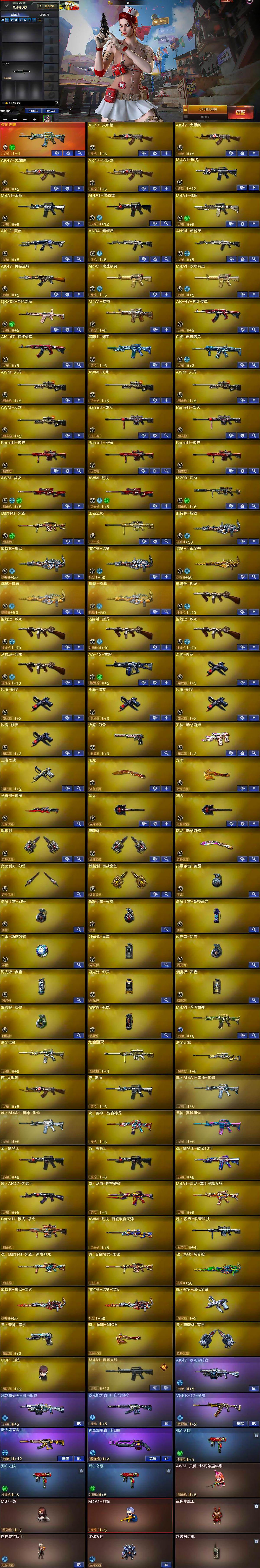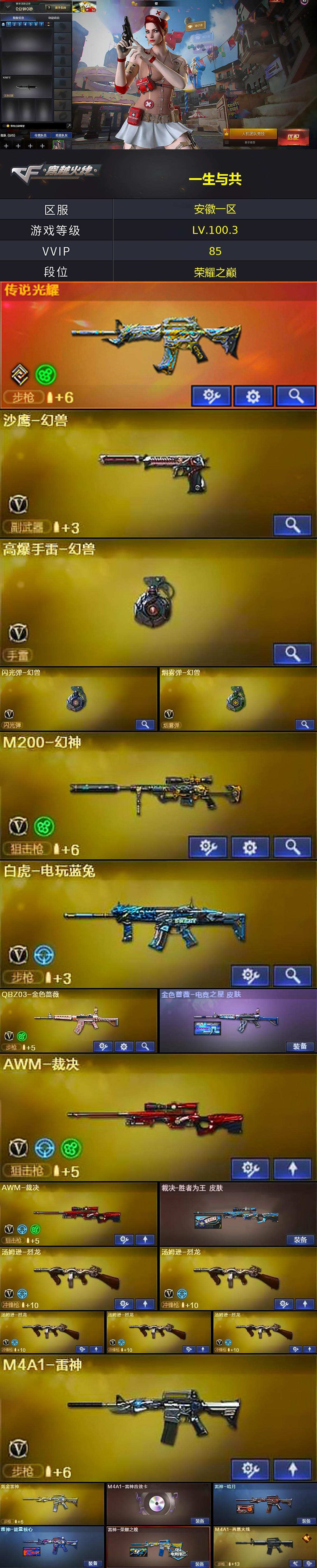 【热门武器】:传说光耀,QBZ03-金色蔷薇,M200-幻神,死亡之眼*3,白虎-电玩蓝兔,M4A1-黑骑士,汤姆逊-烈龙*5,加特林-炼狱*3,COP-白鲨,沙鹰-修罗*5,高爆手雷-幻兽