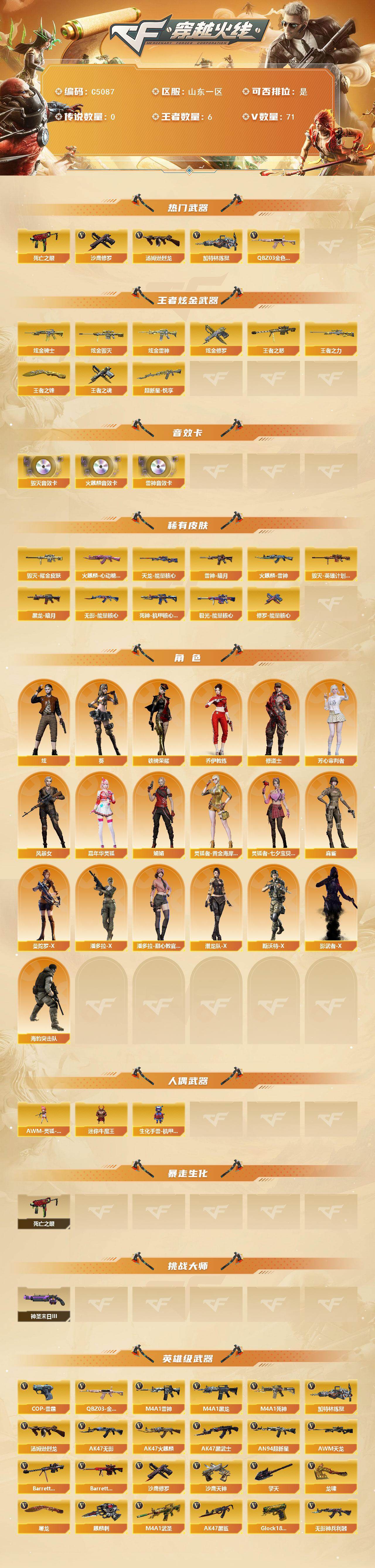 【C5087】山东一区-74V-6王者武器数-4炫金武器数
