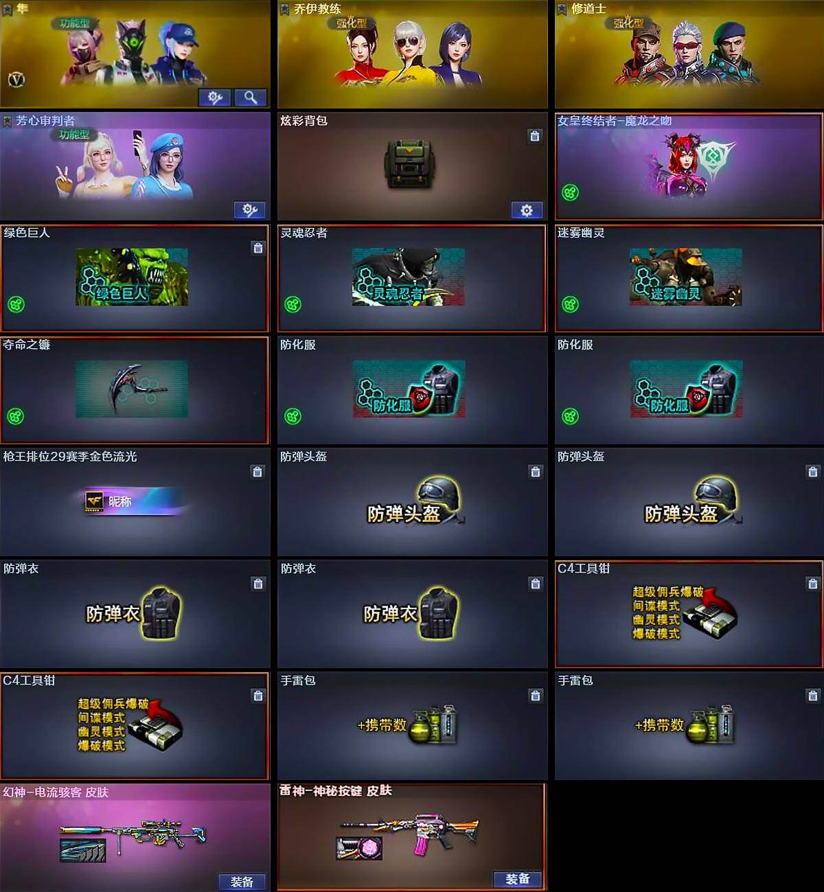 【道具】:炫彩背包,女皇终结者-魔龙之吻,绿色巨人,灵魂忍者,迷雾幽灵,夺命之镰,防化服*2,枪王排位29赛季金色流光,防弹头盔*2,防弹衣*2,C4工具钳*2,手雷包*2