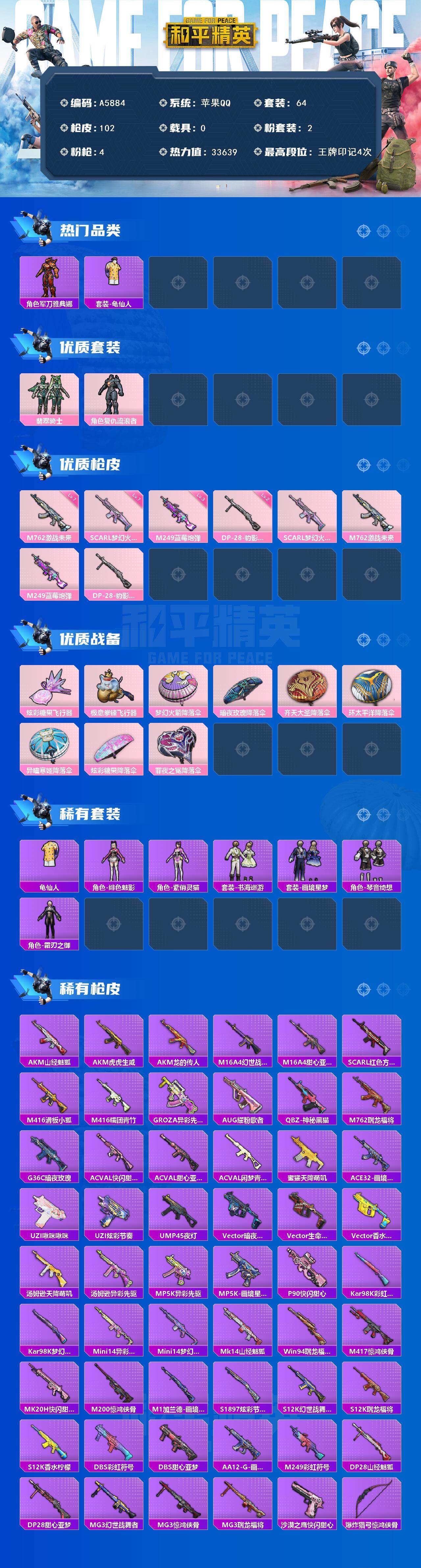 【A5884】苹果【品质号/4王牌印记/角色-军刀雅典娜/套装-龟仙人/SCAR-L-梦幻火箭(七级)/M762-激战未来(七级)/M249-蓝莓炮弹(三级)/DP-28-豹影疾电(二级)/2粉装-4特效枪-0载具-2粉色飞行器-33639热力值】 手Q-2粉装-4特效枪-0载具-2粉色飞行器-33639热力值-4王牌印记-64套装-102枪皮