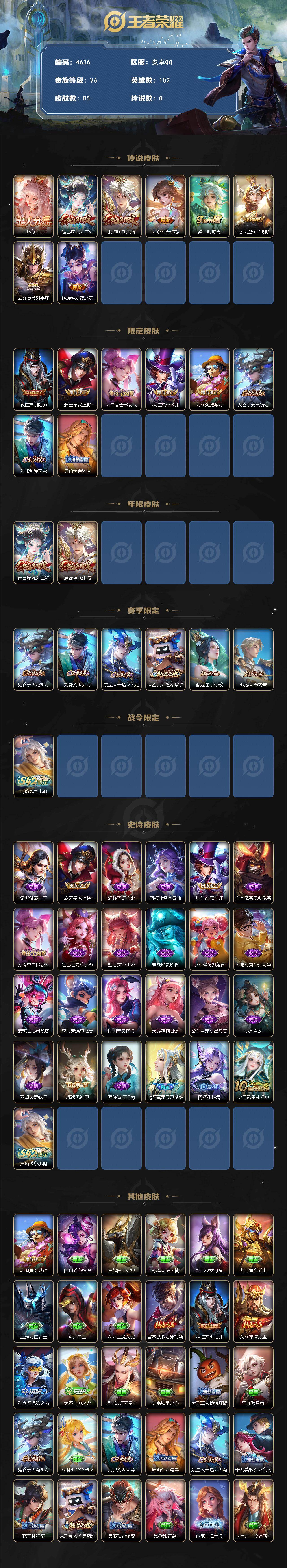 安卓Q-V6-至尊星耀IV段位-102英雄-85皮肤-8传说-24史诗【英雄