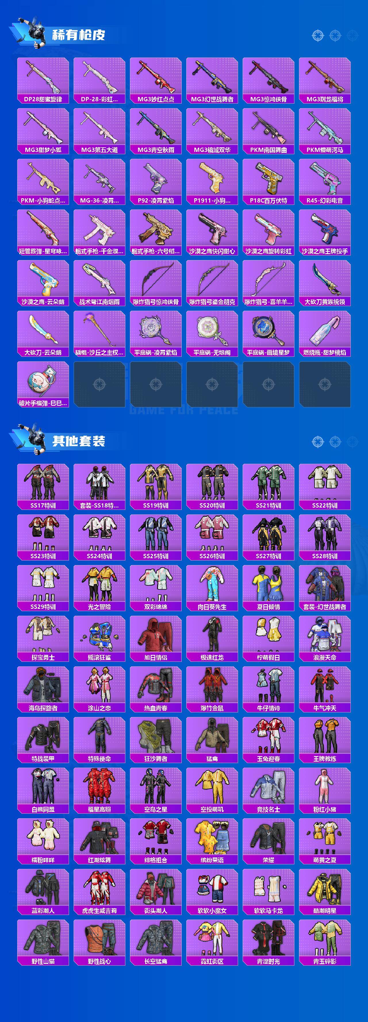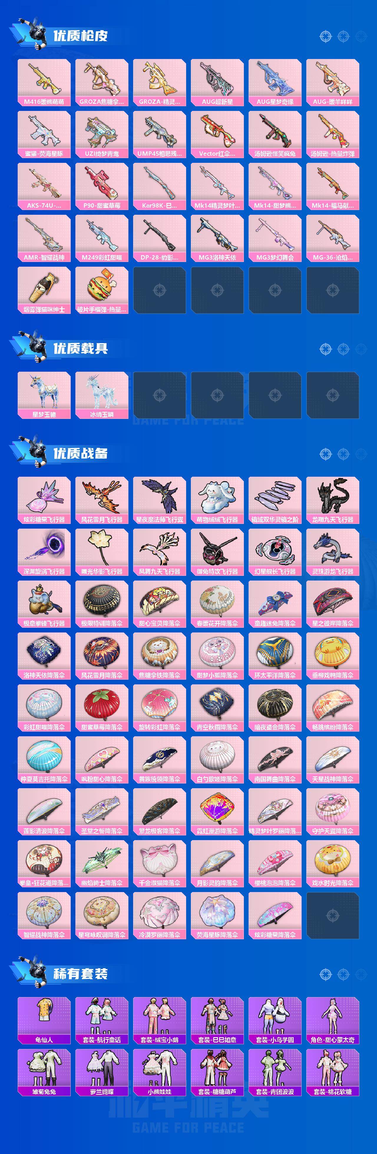 【HPZG129】271套装/枪械32/装备600/载具2/战备320/王牌印记21/热力值152859/一级AKM-星际浪客/五级AKM-白勺歌姬/六级SCAR-L-梦幻火箭/一级SCAR-L-童趣迷兔/一级SCAR-L-青春物语/一级M416-五爪金龙/五级M416-暖熊萌萌/五级GROZA-焦糖拿铁/三级GROZA-精灵之光/一级AUG-超新星/九级AUG-星梦奇缘/五级AUG-暖羊咩咩/五级蜜獾-荧海星豚/六级UZI-绮梦青鸾/七级UMP45-相思残雪/六级Vector-红伞翩翩/五级汤