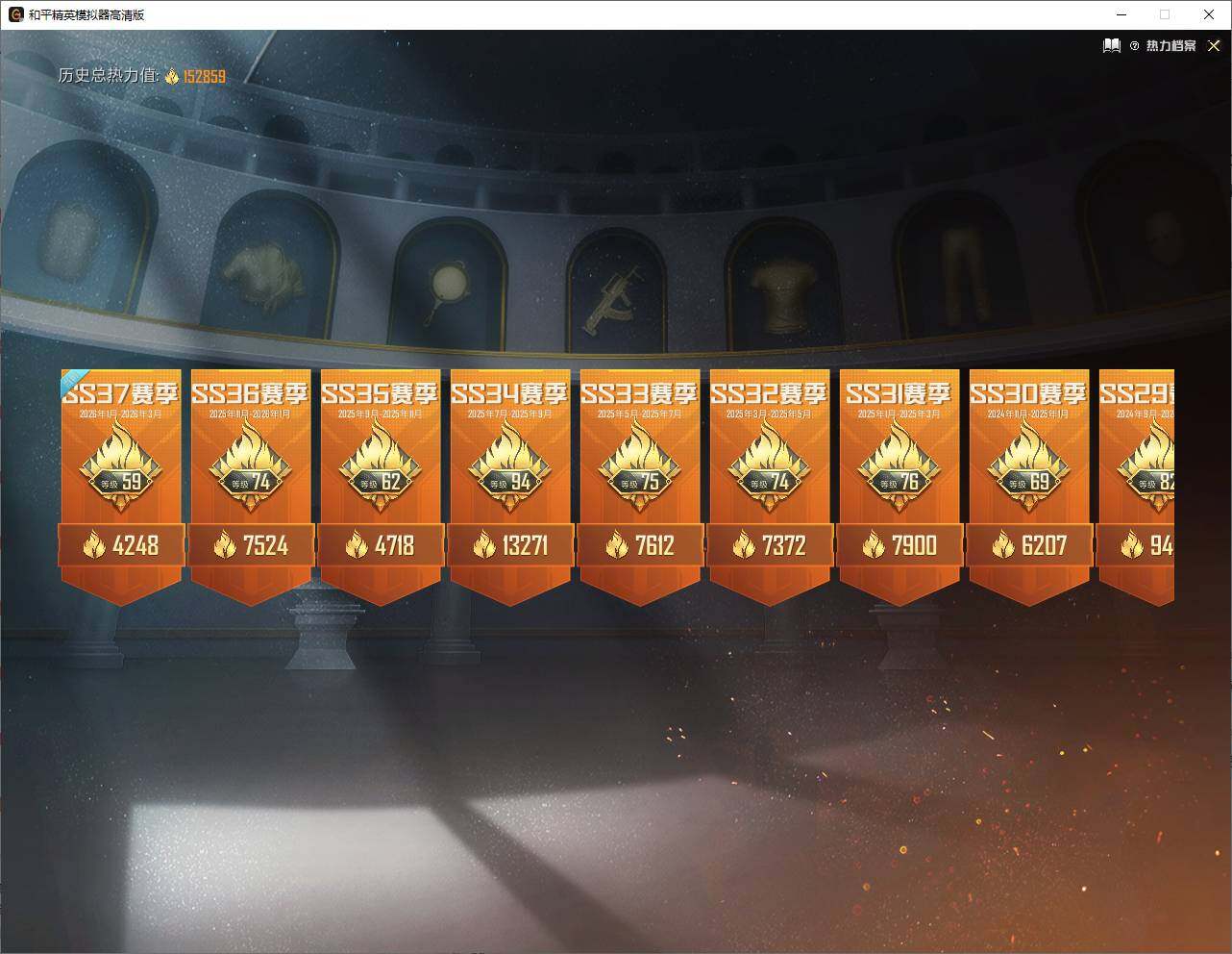 271套装/枪械32/装备600/载具2/战备320/王牌印记21/热力值152859/