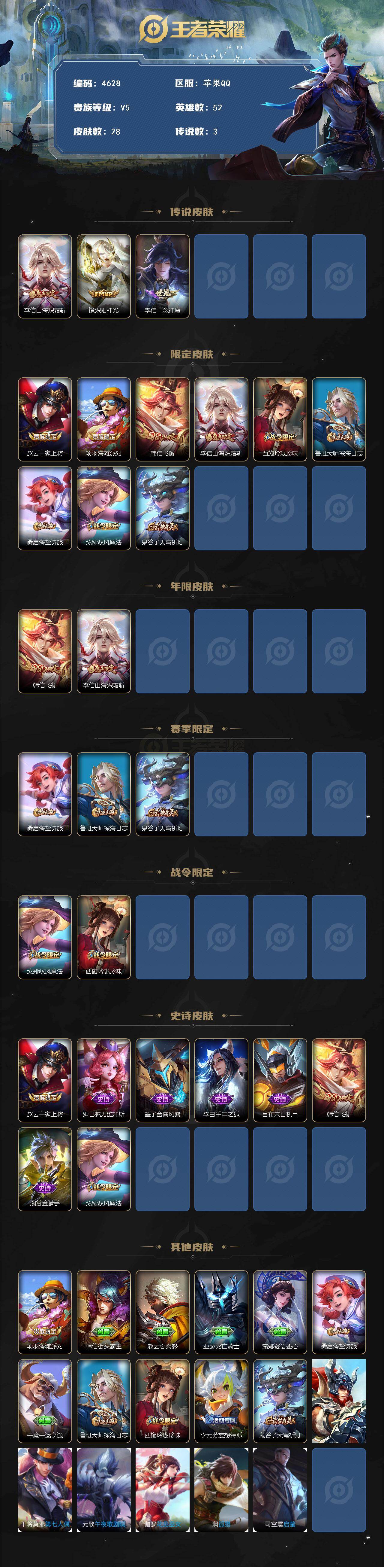 苹果Q-V5-荣耀黄金IV段位-52英雄-28皮肤-3传说-8史诗【传说皮肤