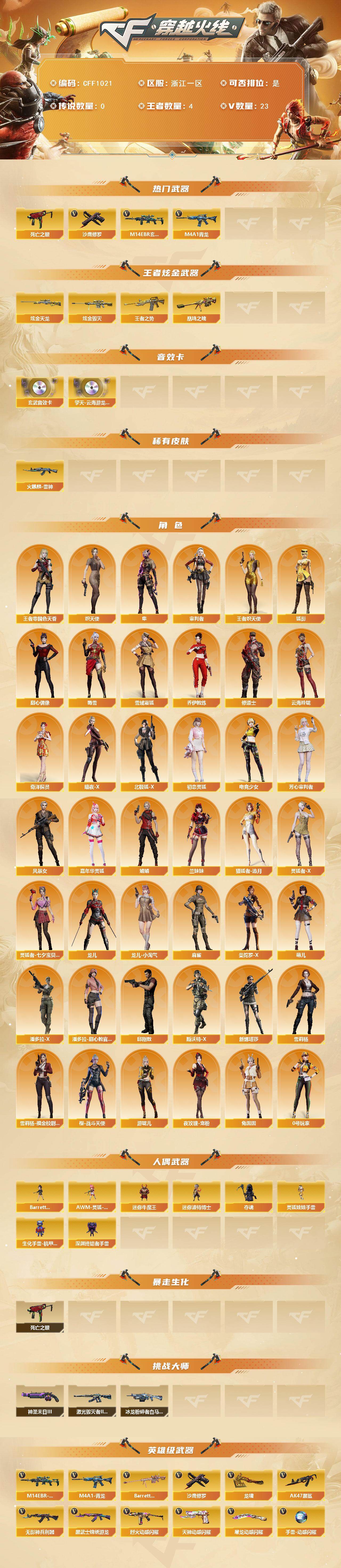 【CFF1021】20V/97级/将帅/4王者/2炫金/3英雄/M14EBR-玄武/M4A1_青龙/死亡之眼/沙鹰_修罗/王者之势/凰鸣之魄/炫金毁灭/炫金天龙/擎天-云海游龙音效卡/M14EBR-玄武音效卡/火麒麟-雷神/隼/审判者/王者-零-国色天香/王者炽天使/狐影/雪域霜狐/奇洋探员/乔伊教练/修道士/云海玲珑/炽天使/暗夜-X/北极狐-X/初恋灵狐/电竞少女/芳心审判者/风暴女/嘉年华灵狐/娟娟/兰妹妹/猎狐者-追月/0号玩家/灵狐者-X/灵狐者-七夕宝贝/龙儿/龙儿-小淘气/麻雀/曼