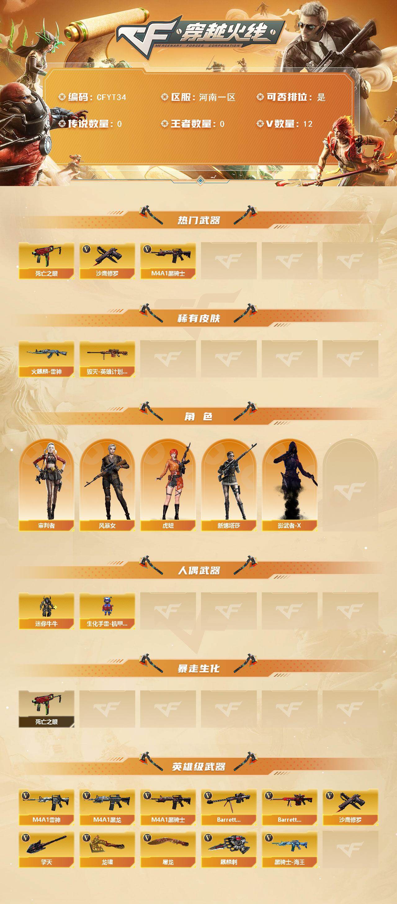 【CFYT34】11V/98级/将帅/1英雄/死亡之眼/M4A1_黑骑士/沙鹰_修罗/火麒麟-雷神/毁灭-英雄计划 皮肤/审判者/风暴女/虎妞/新娜塔莎/影武者-X/迷你牛牛/生化手雷-机甲核心/M4A1_黑龙/M4A1_雷神/黑骑士-海王/Barrett-毁灭/Barrett极光/屠龙/龙啸/擎天/麒麟刺/战舰背包/绿色巨人/灵魂忍者/迷雾幽灵/夺命之镰/防化服/枪王排位28赛季金色流光/防弹头盔/防弹衣/C4工具钳/手雷包