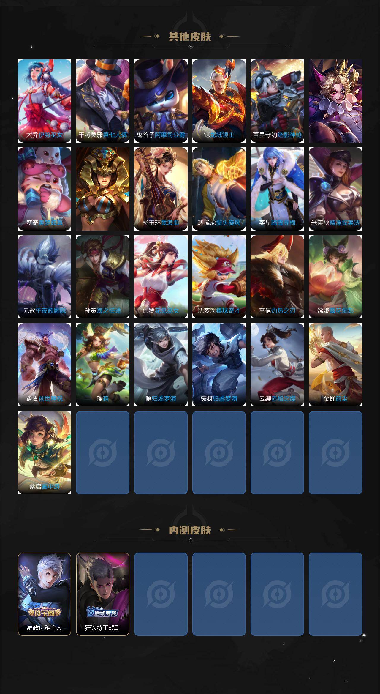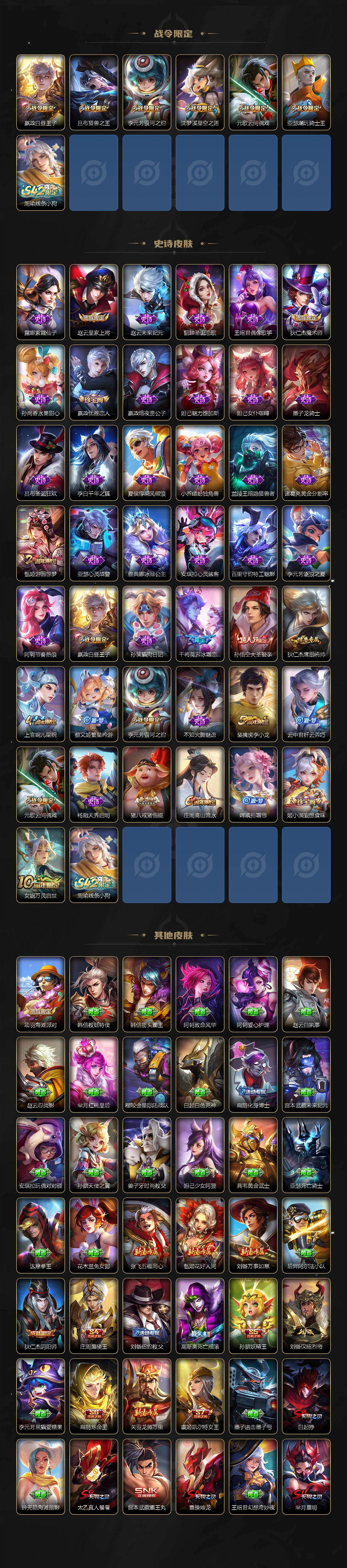 【限定皮肤】:白起狰,狄仁杰阴阳师,虞姬凯尔特女王,赵云皇家上将,嬴政优雅恋人,嬴政白昼王子,庄周蜃楼王,庄周高山流水,高渐离死亡摇滚,孙膑妖精王,扁鹊炼金王,
