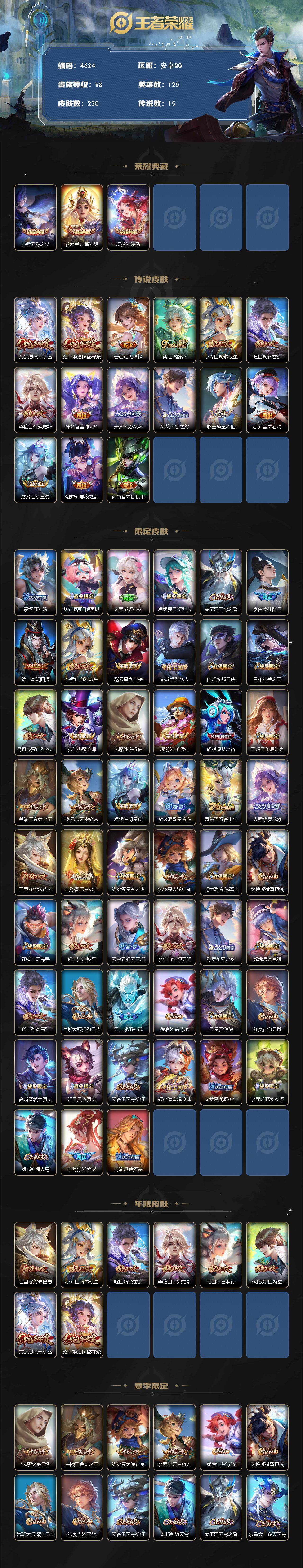 安卓Q-V8-至尊星耀IV段位-125英雄-230皮肤-3典藏皮肤-15传说-