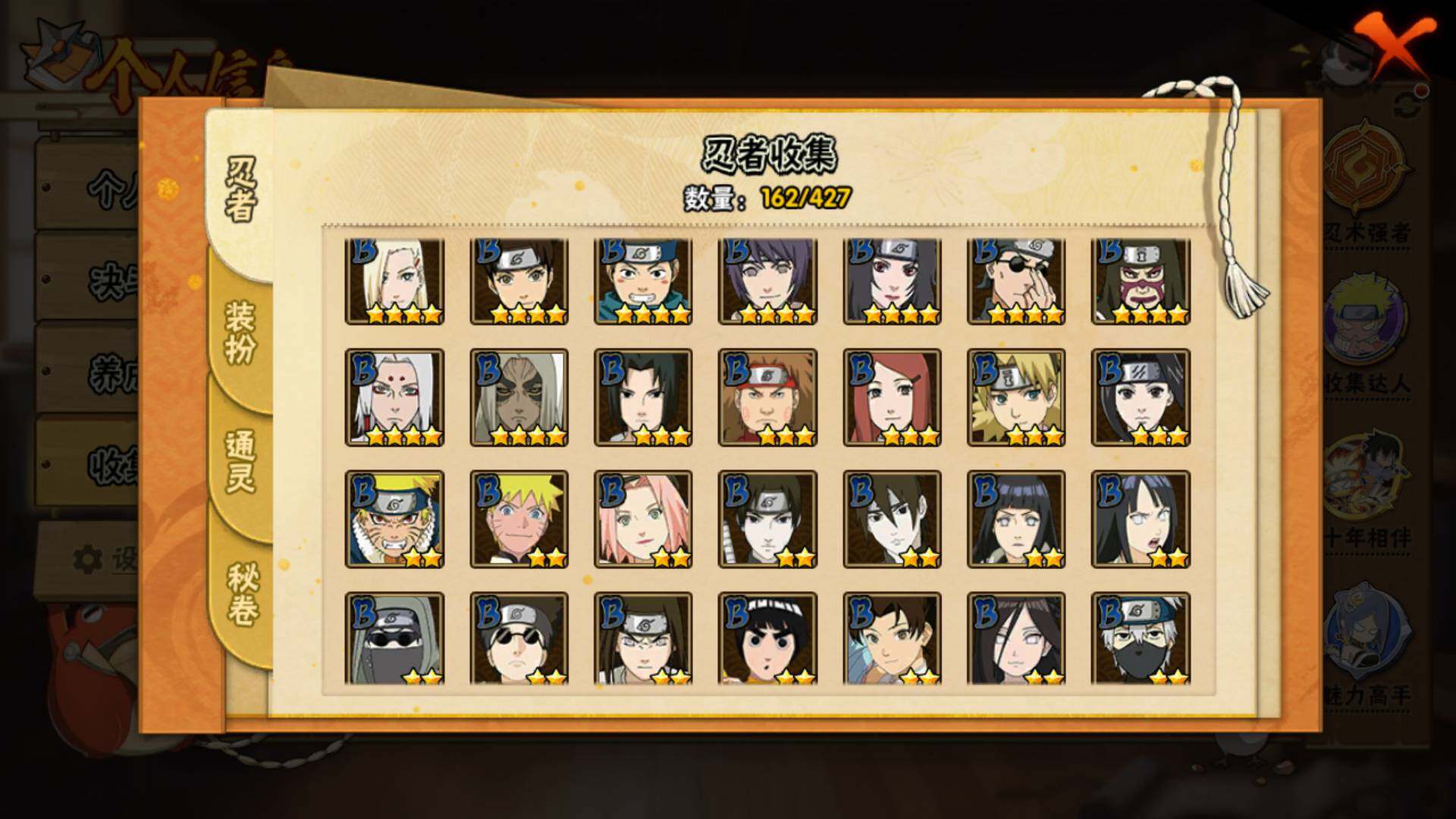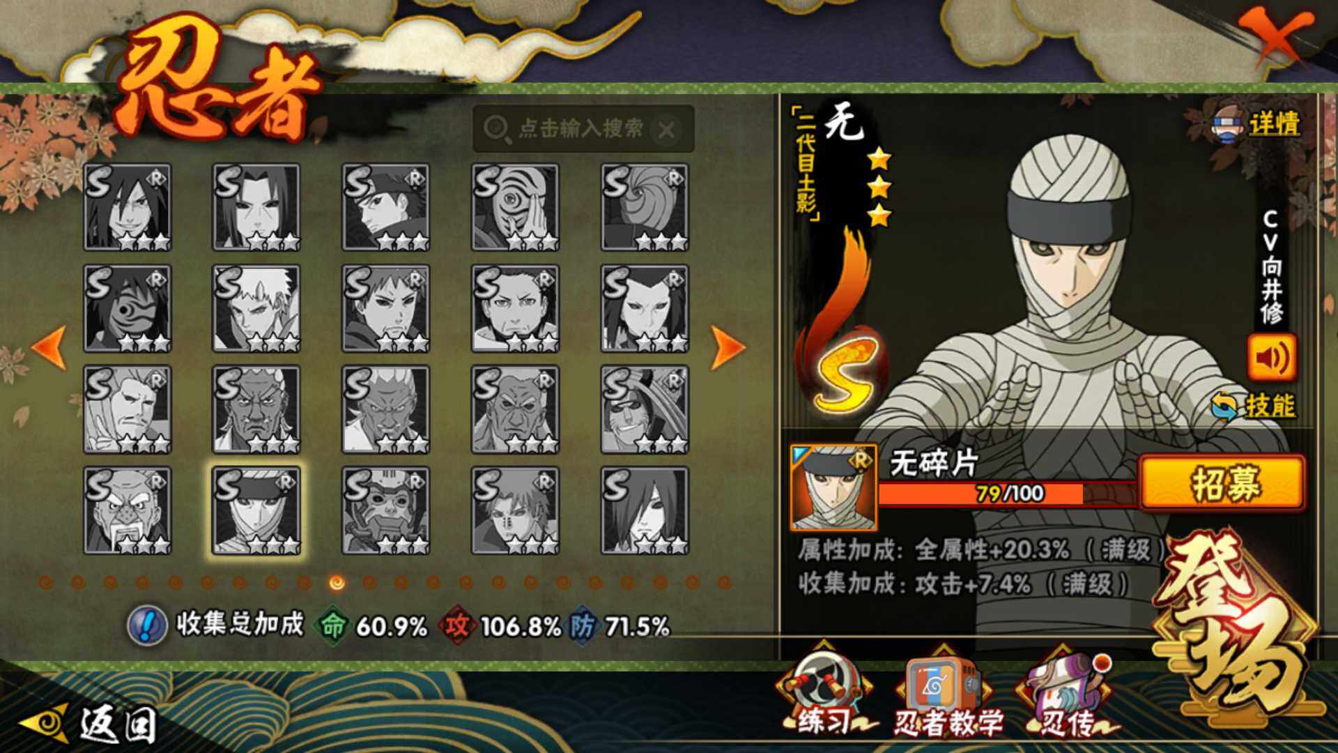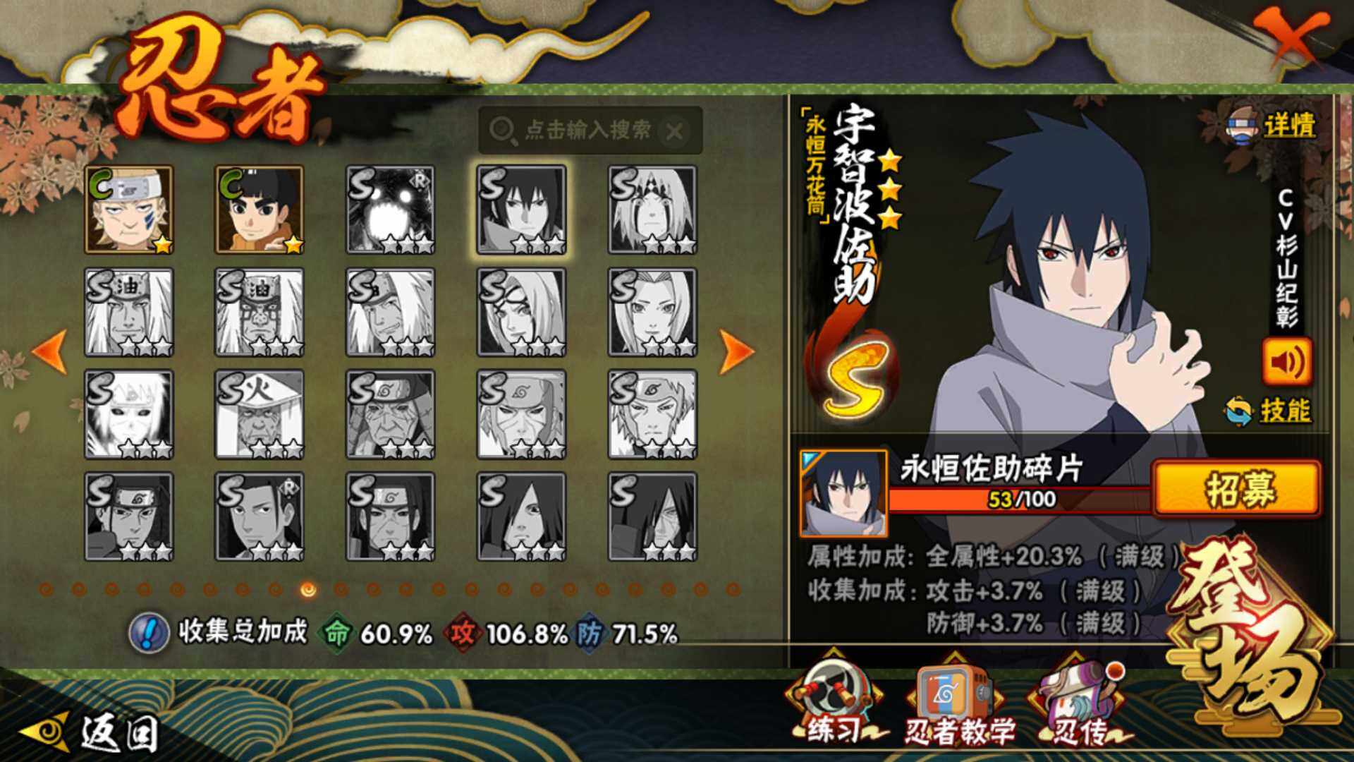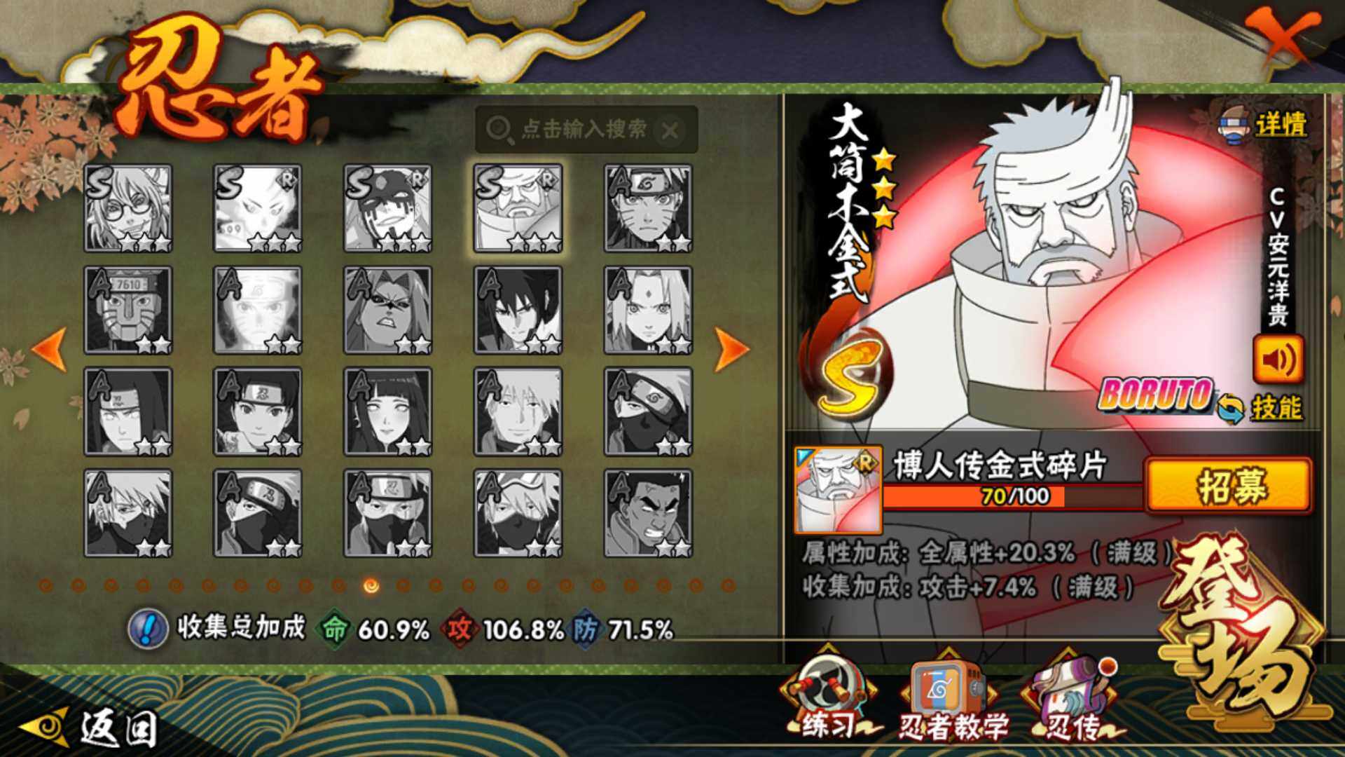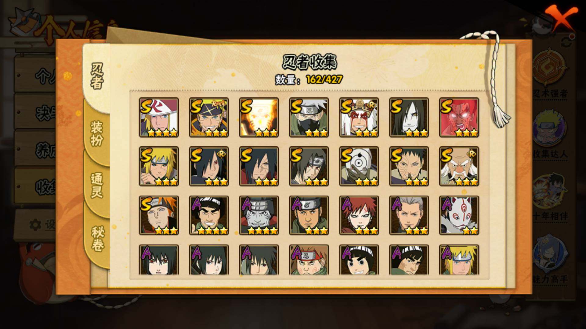 【S级忍者】:波风水门「秽土转生」(3星),宇智波斑「秽土转生·解」(3星),大野木「忍界大战」(3星),宇智波带土「忍界大战」(3星),宇智波鼬「须佐能乎」(3星),旗木卡卡西「须佐能乎」(3星),宇智波斑「木叶创立」(3星),自来也「舞之豪杰」(3星),大蛇丸(3星),波风水门(4星