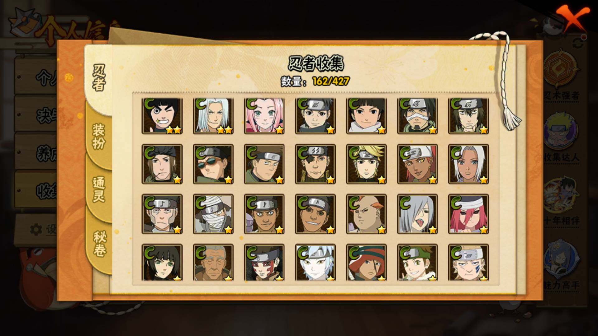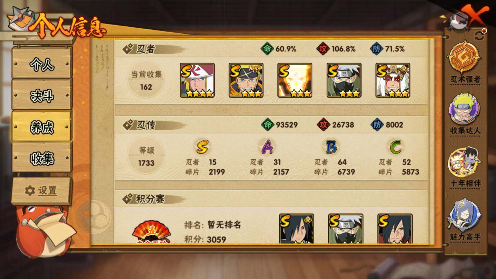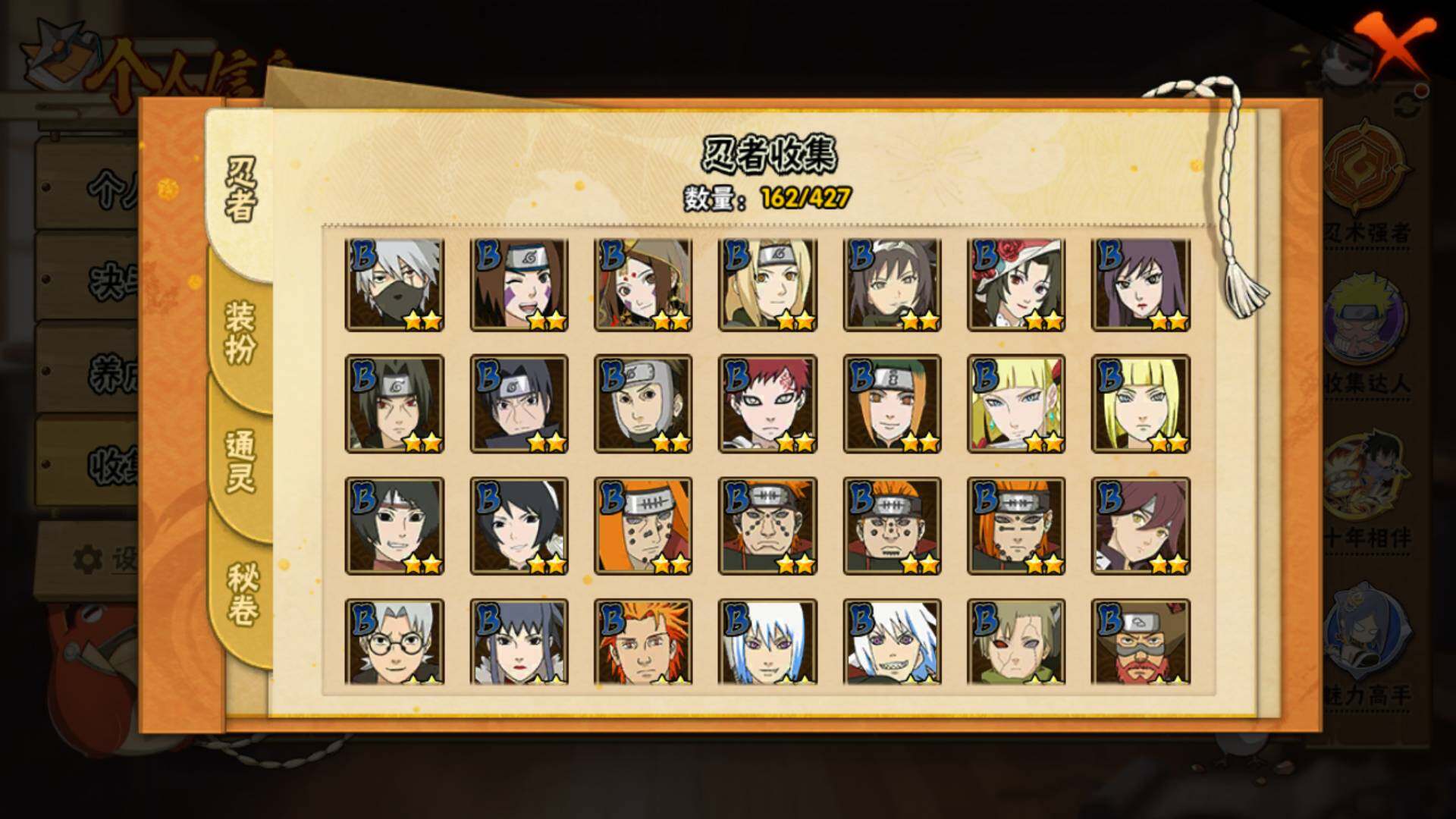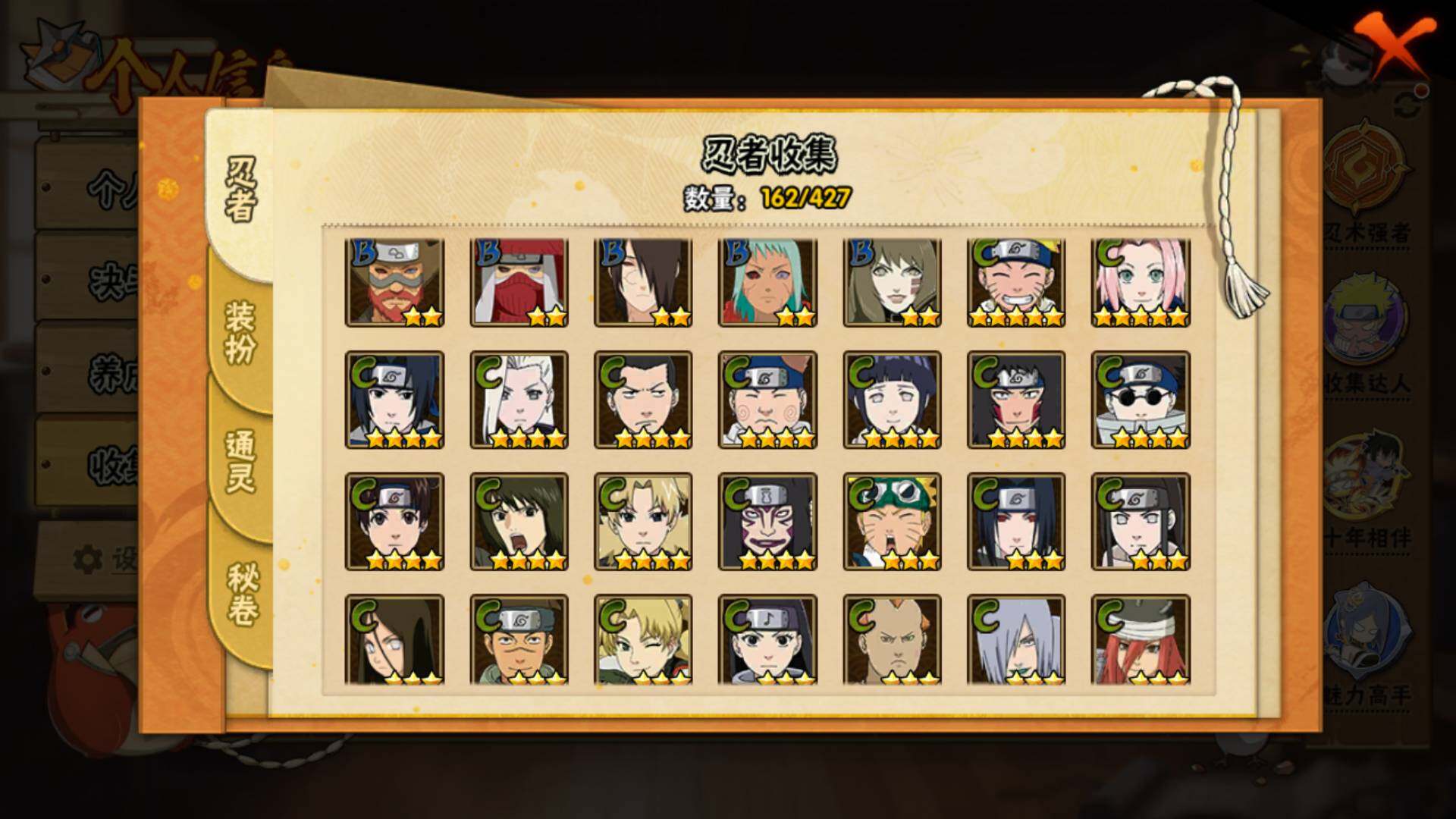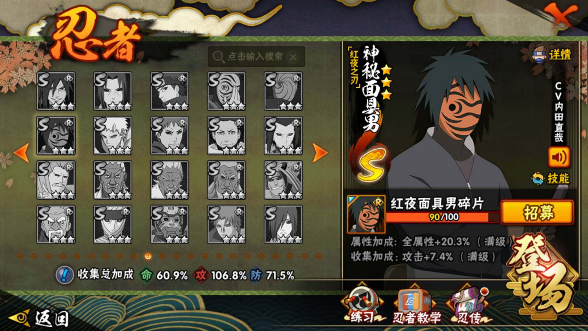 【S级忍者】:波风水门「秽土转生」(3星),宇智波斑「秽土转生·解」(3星),大野木「忍界大战」(3星),宇智波带土「忍界大战」(3星),宇智波鼬「须佐能乎」(3星),旗木卡卡西「须佐能乎」(3星),宇智波斑「木叶创立」(3星),自来也「舞之豪杰」(3星),大蛇丸(3星),波风水门(4星