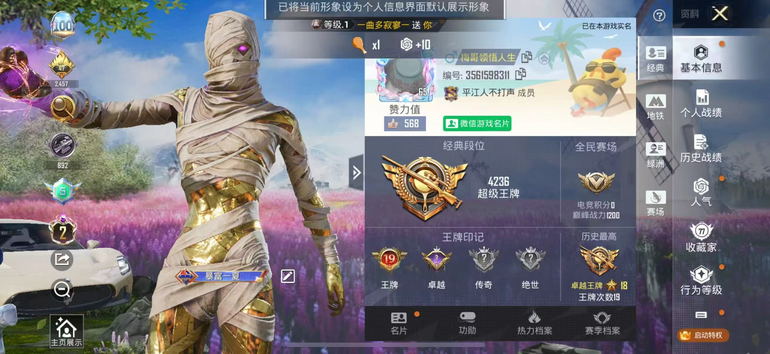 安卓 手Q-3神装-15粉装-10特效枪-4载具-14粉色飞行器-122169热力值-8王牌印记-252套装-334枪皮