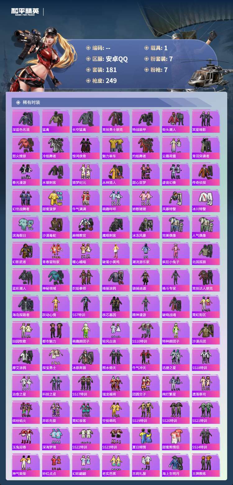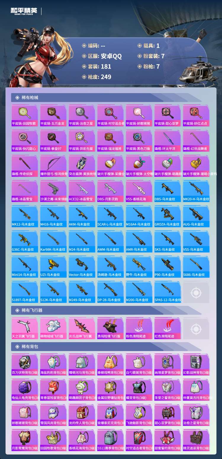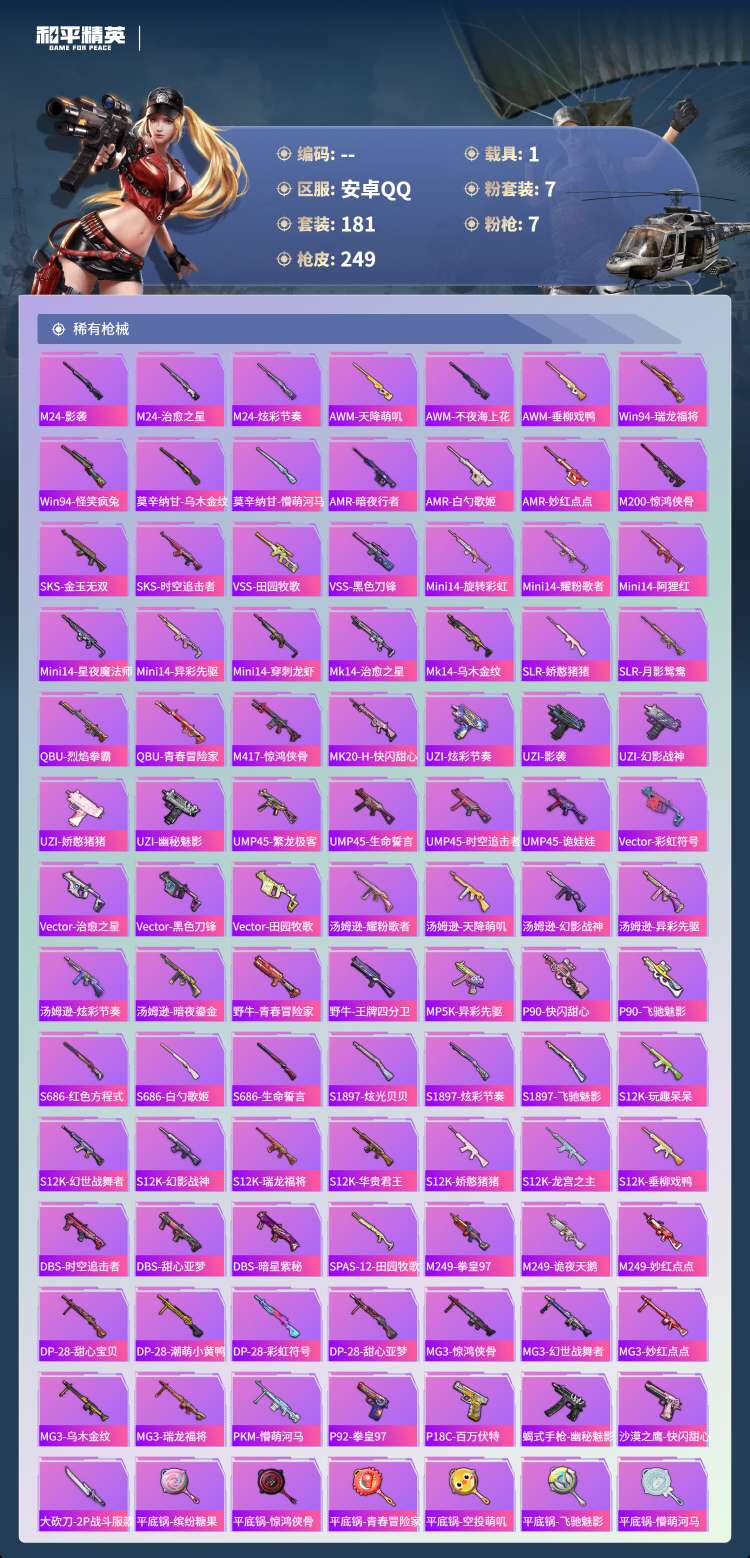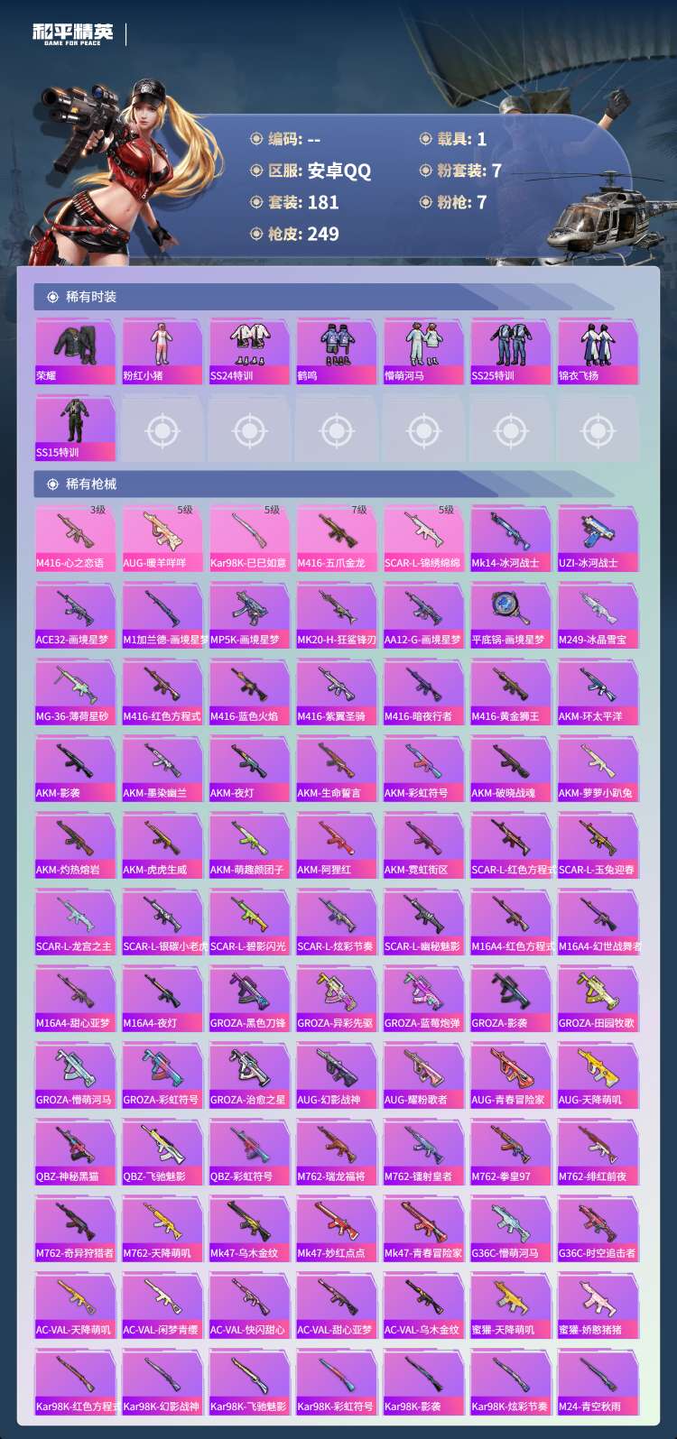 hs62044 安卓手Q-8王牌印记-7粉装-7特效枪-1载具-77672热力值-181套装-249