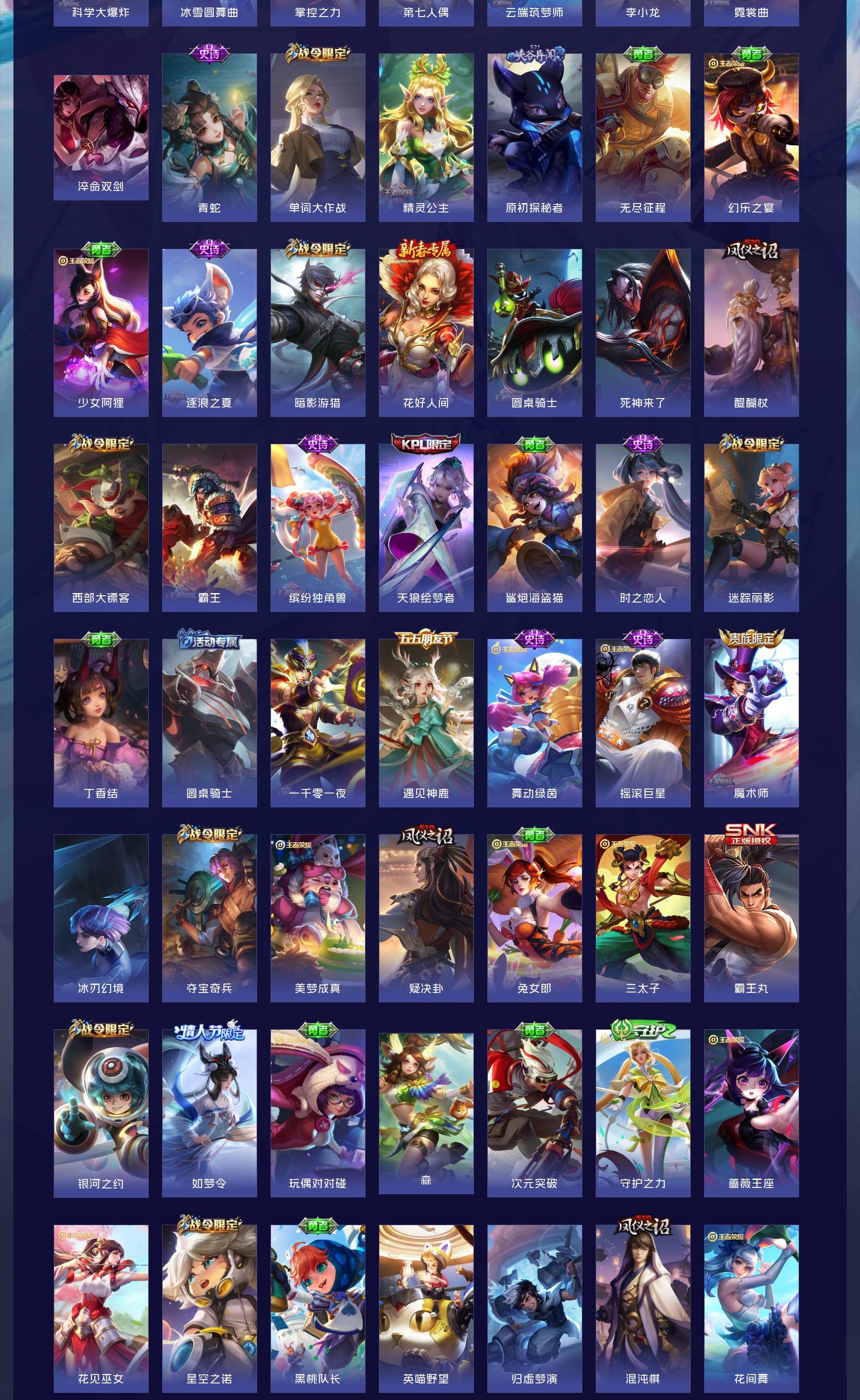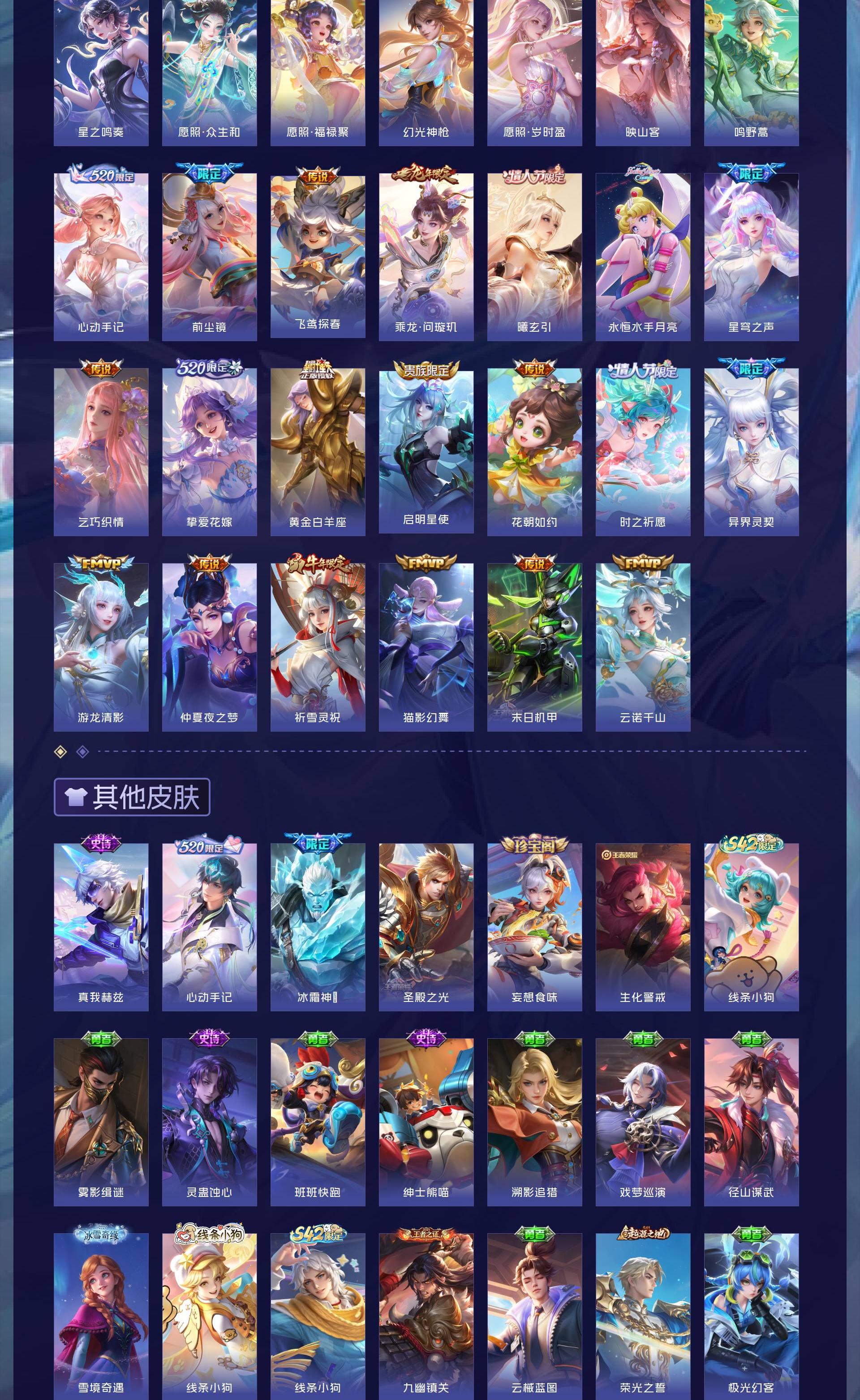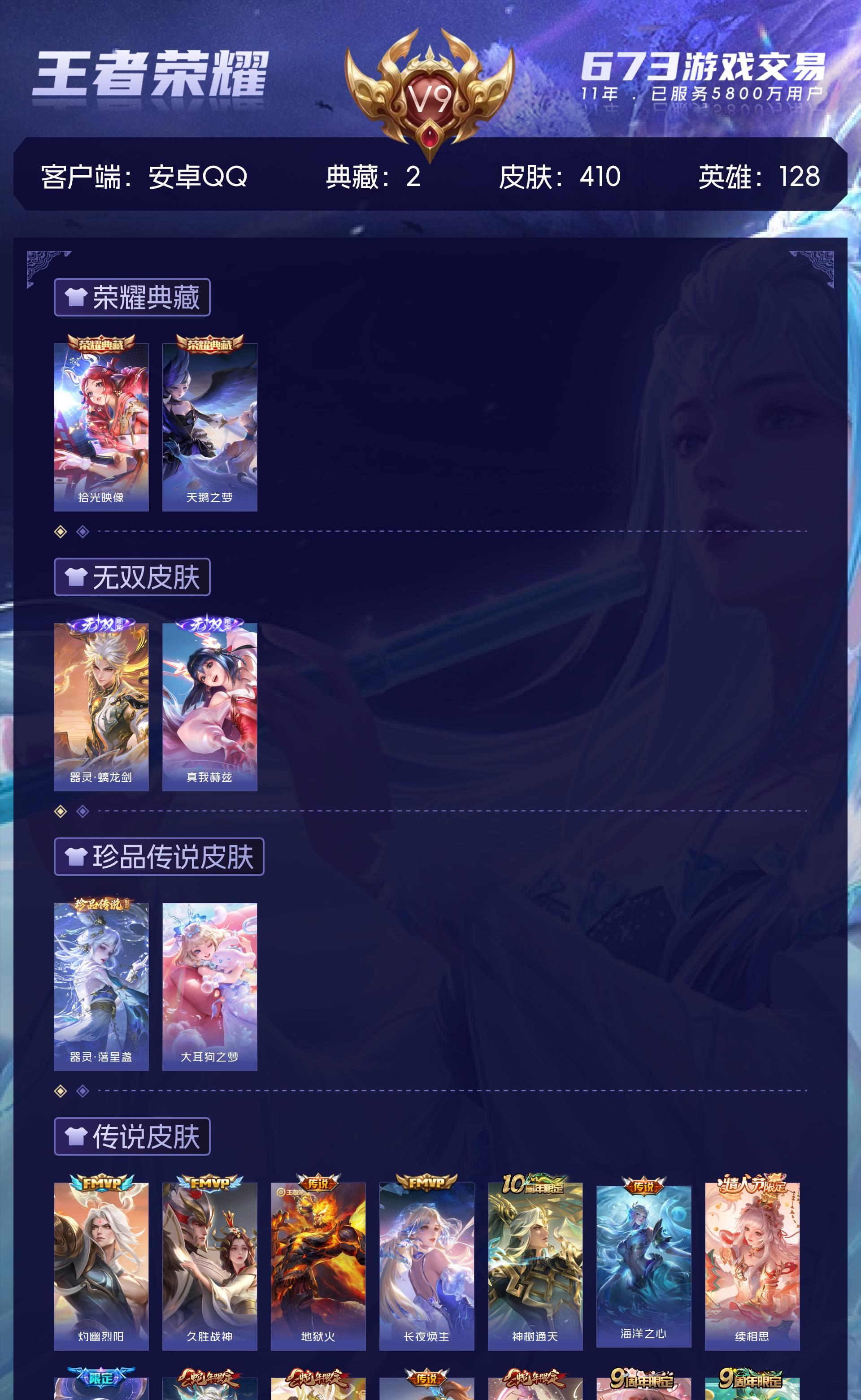 V9 皮肤410 英雄128 无双王者 荣耀典藏2 无双皮肤2 珍品传说2 星传说4 传说34 其他皮肤363