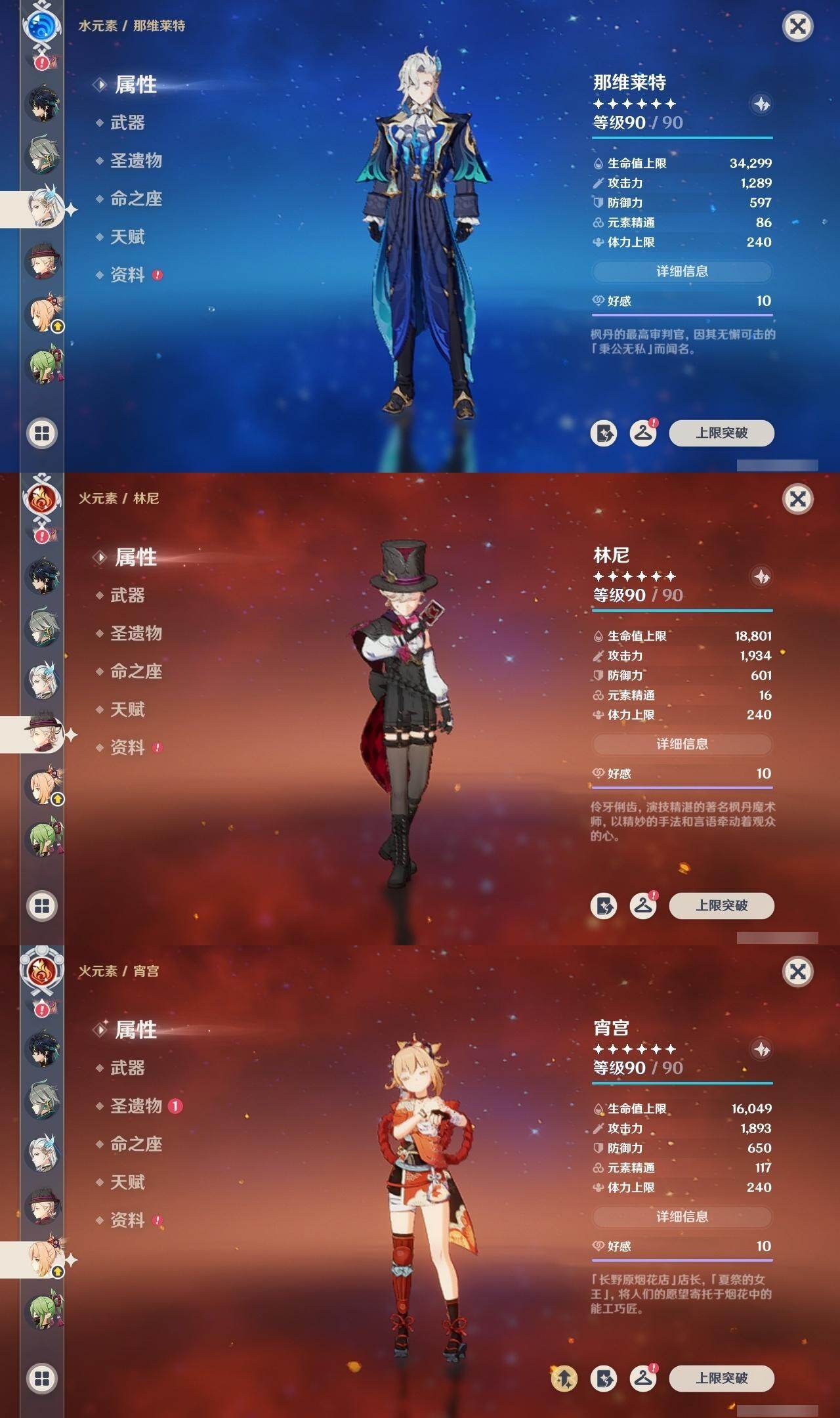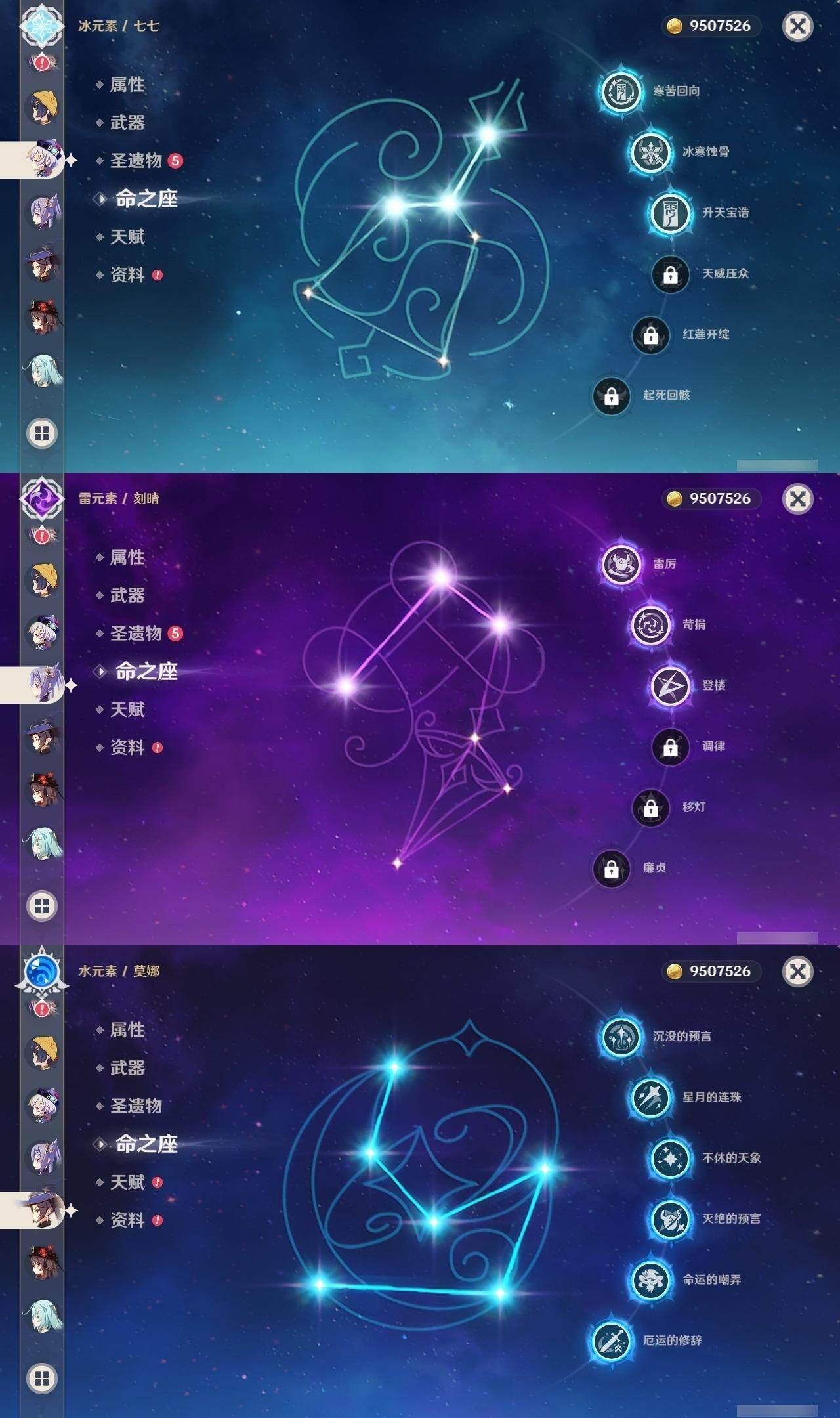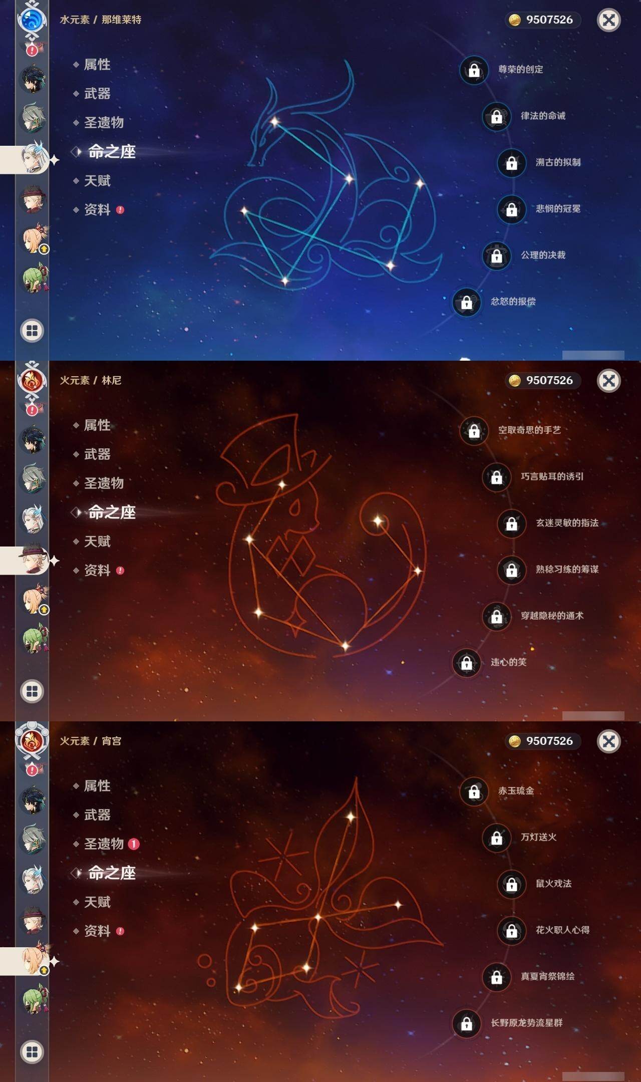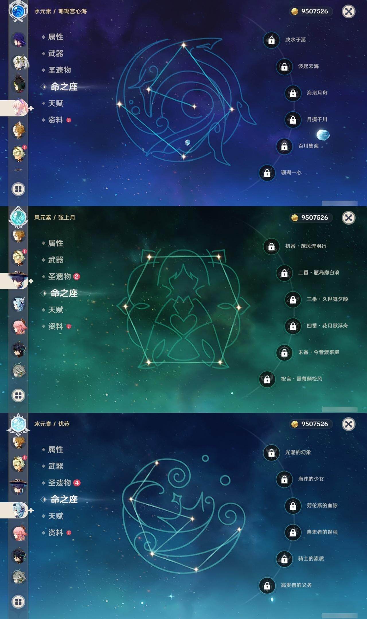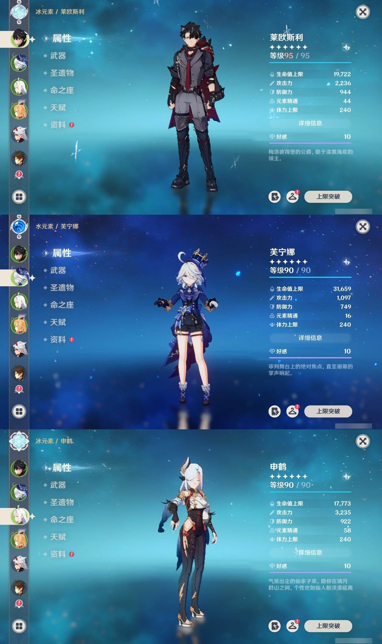 1命芙宁娜,1命莱欧斯利,0命那维莱特,0命林尼,0命艾尔海森,0命流浪者,0命纳西妲,0命赛诺,3命提纳里,0命八重神子,0命申鹤,0命荒泷一斗,0命优菈,0命雷电将军,1命枫原万叶,3命神里绫华,0命钟离,0命胡桃,0命宵宫,0命珊瑚宫心海,3命刻晴,3命七七,2命琴,满命莫娜,0命基尼奇,0命爱可菲,精1赦罪,精1有乐御簾切,精1静水流