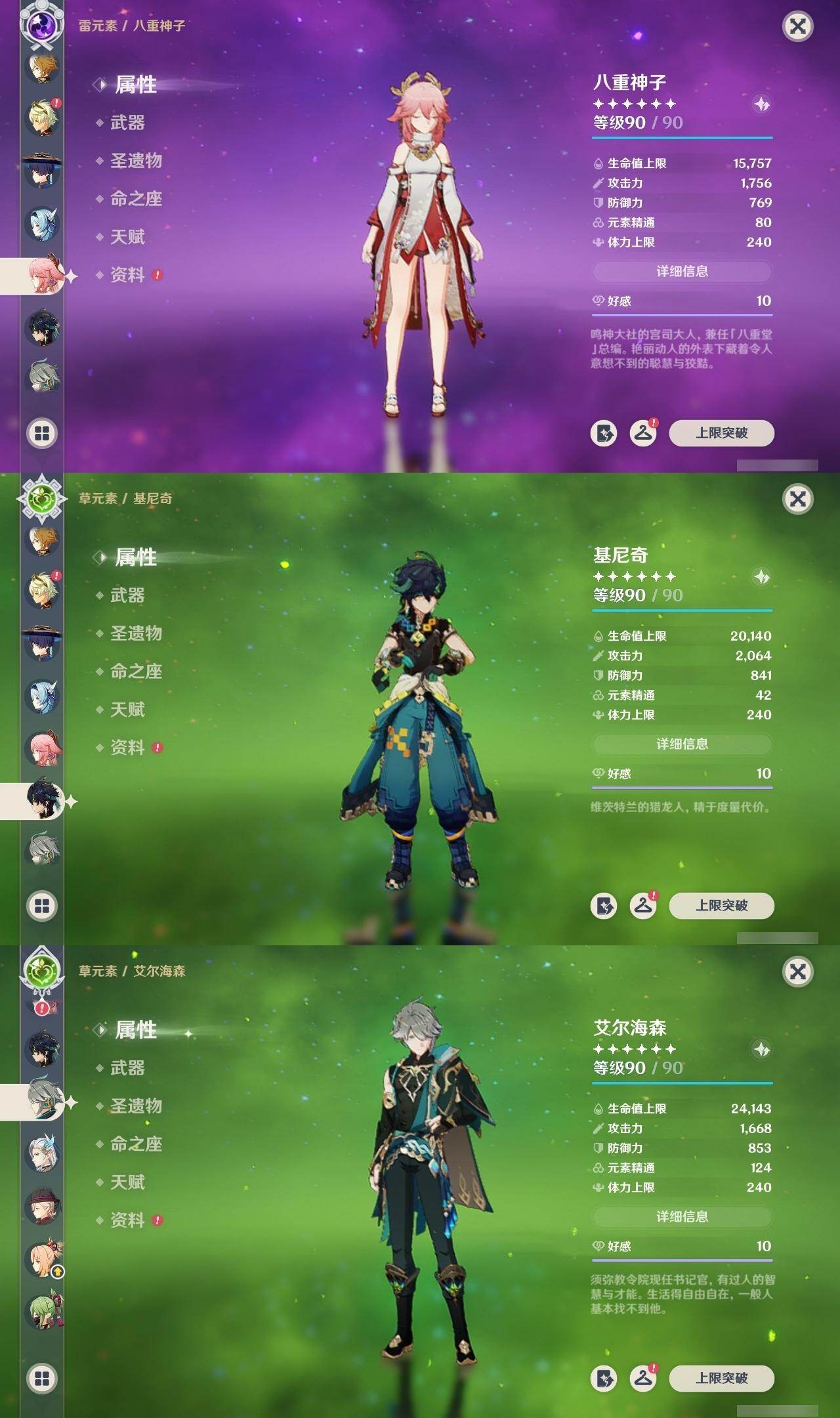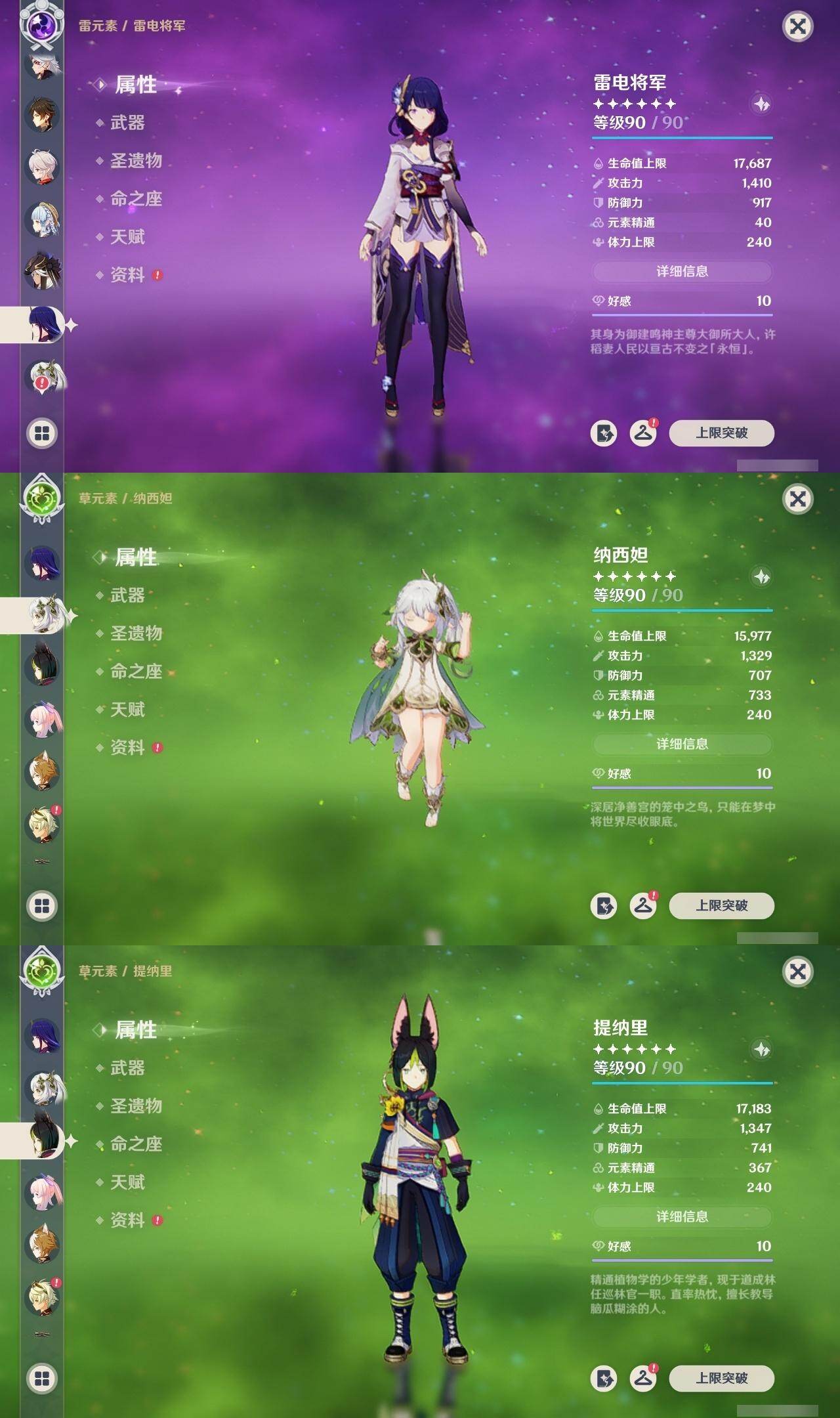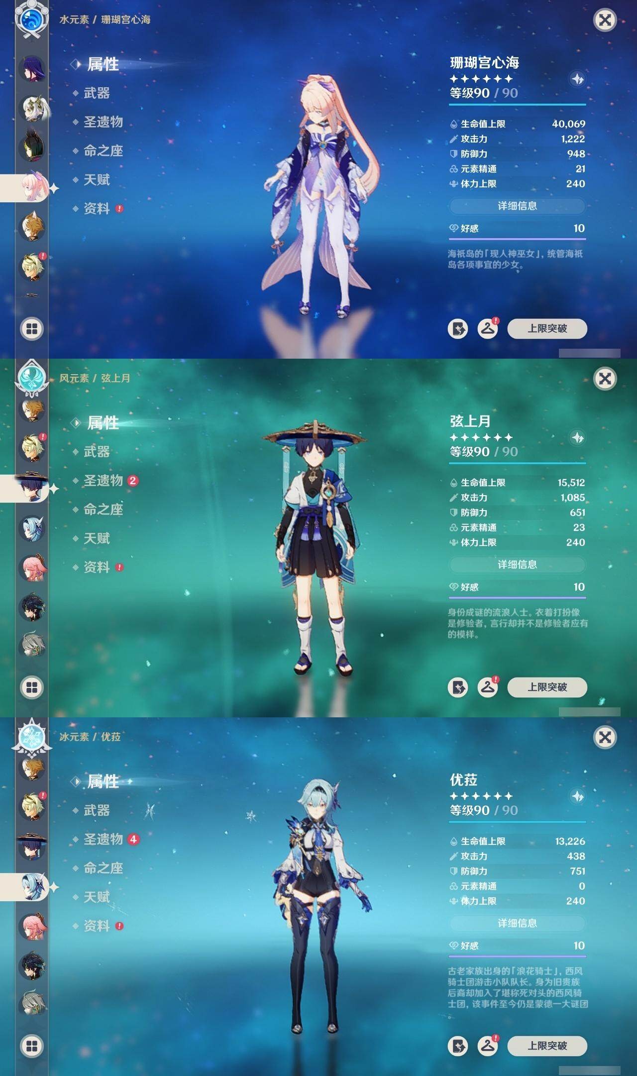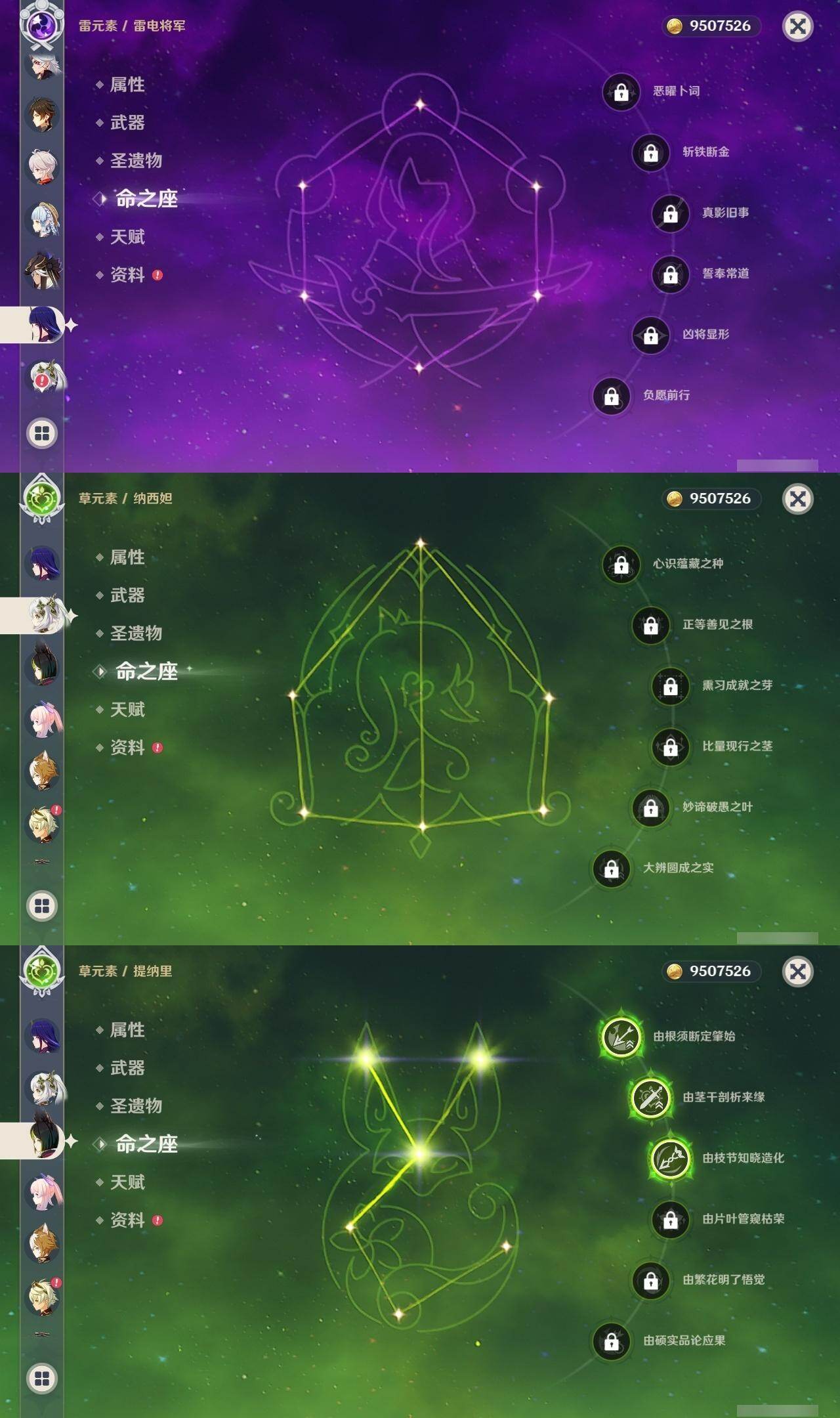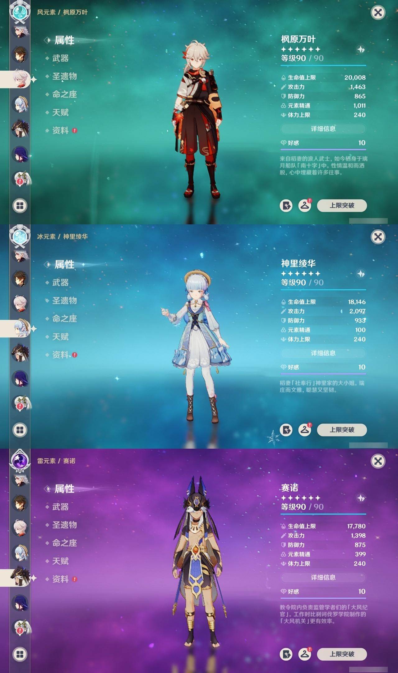 1命芙宁娜,1命莱欧斯利,0命那维莱特,0命林尼,0命艾尔海森,0命流浪者,0命纳西妲,0命赛诺,3命提纳里,0命八重神子,0命申鹤,0命荒泷一斗,0命优菈,0命雷电将军,1命枫原万叶,3命神里绫华,0命钟离,0命胡桃,0命宵宫,0命珊瑚宫心海,3命刻晴,3命七七,2命琴,满命莫娜,0命基尼奇,0命爱可菲,精1赦罪,精1有乐御簾切,精1静水流