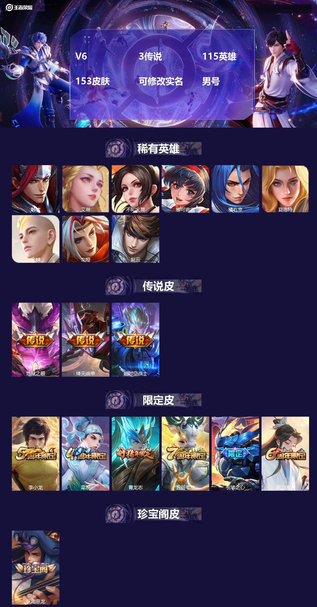 V6 3传说 115英雄 153皮肤 可修改实名 男号