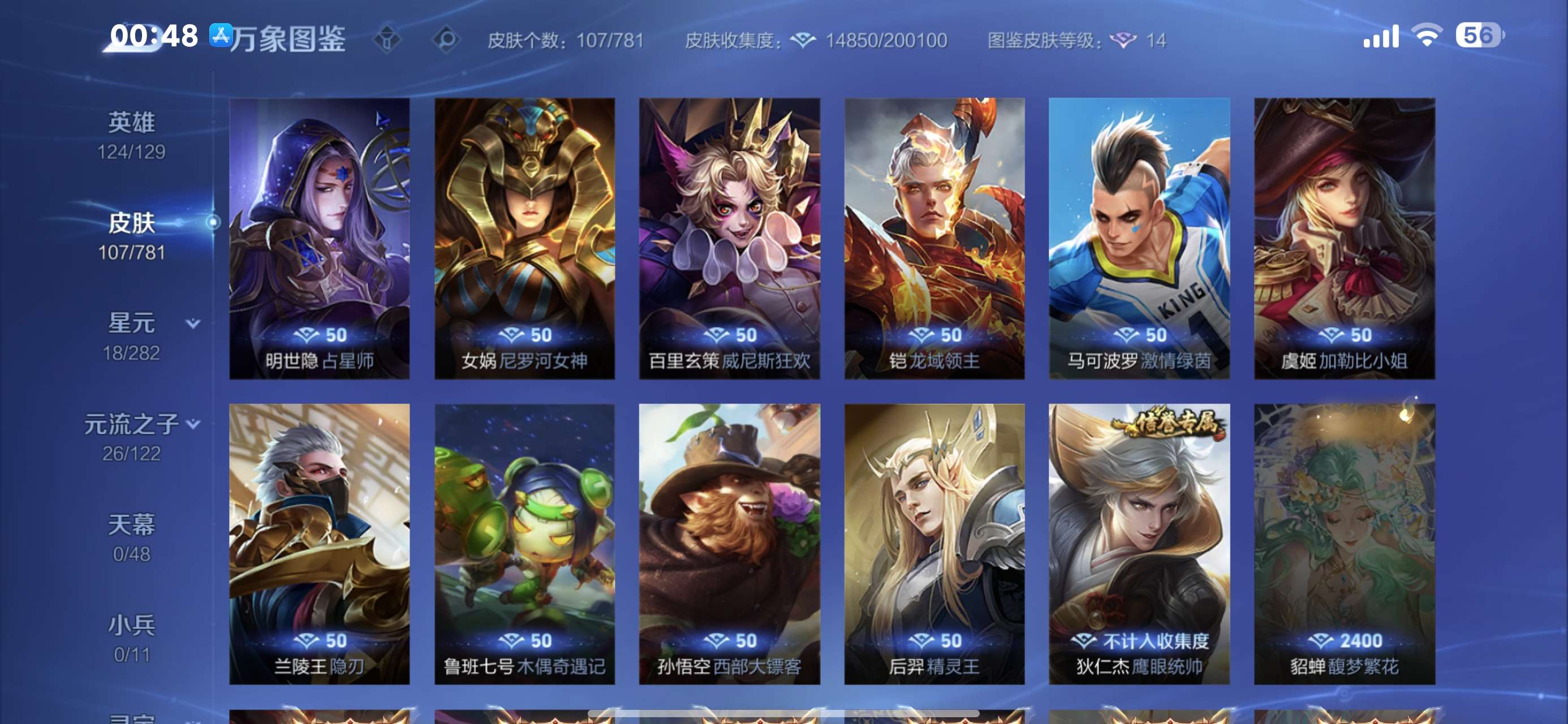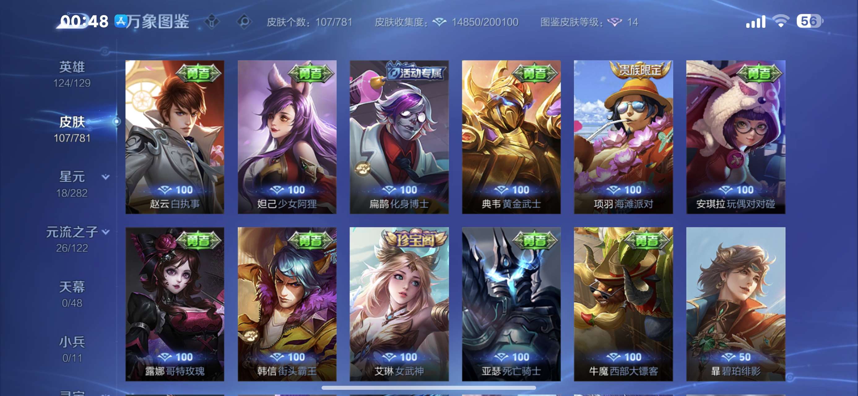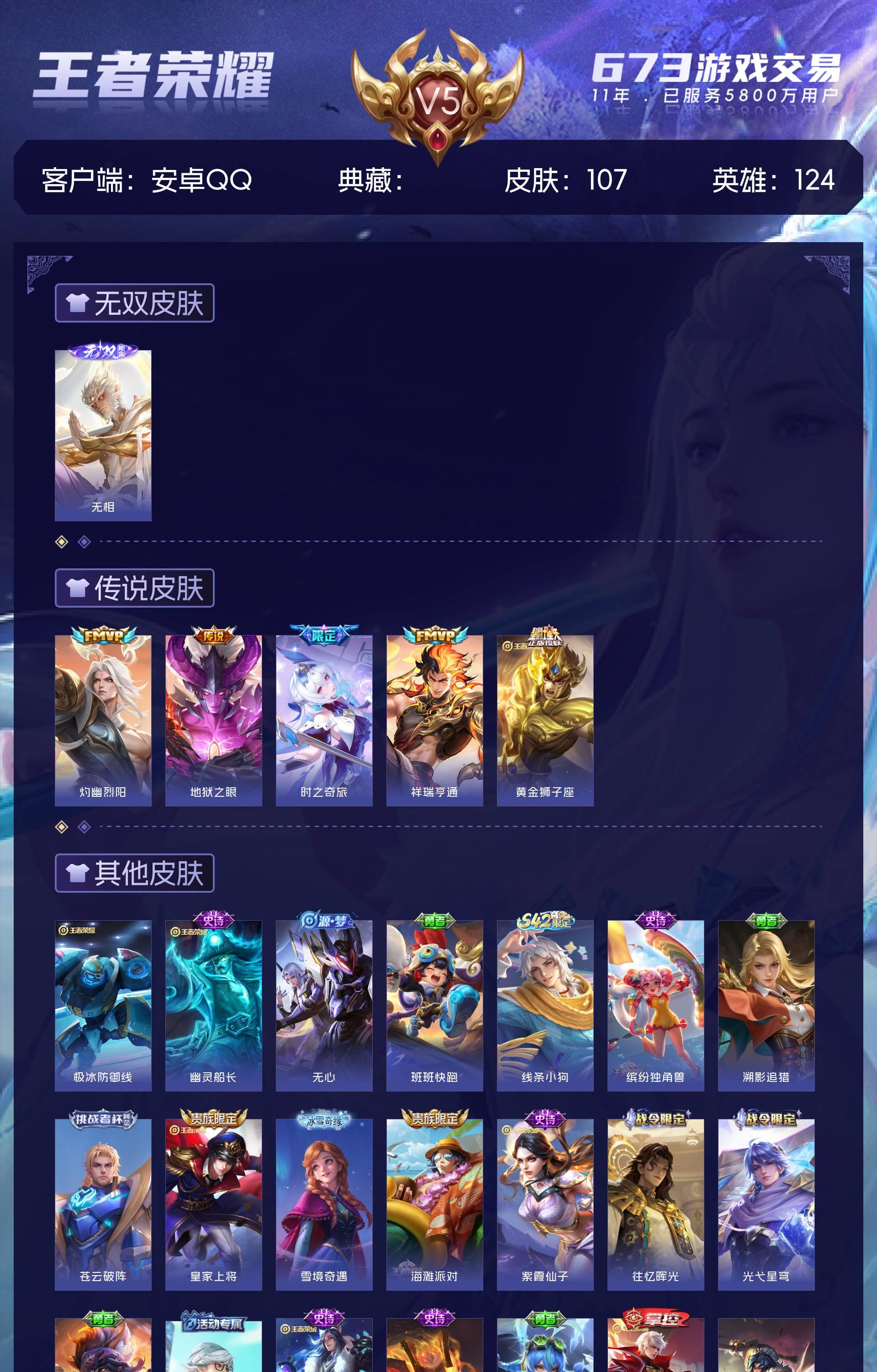 V5 皮肤107 英雄124 永恒钻石 无双皮肤1 星传说1 传说5 其他皮肤104
