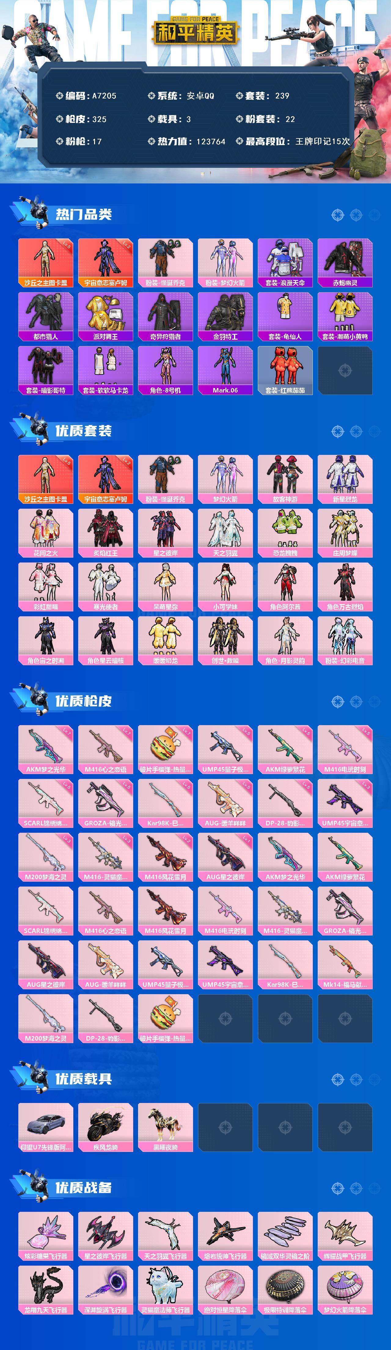 安卓 【红装素材号 宇宙意志-塞卢姆(二级)/沙丘之主-图卡盟(五级)/粉装-怪诞乔克/粉装-梦幻火箭/套装-浪漫天命/套装-赤蝎幽灵/套装-都市猎人/套装-派对舞王】手Q-2神装-22粉装-17特效枪-3载具-9粉色飞行器-123764热力值-15王牌印记-239套装-325枪皮