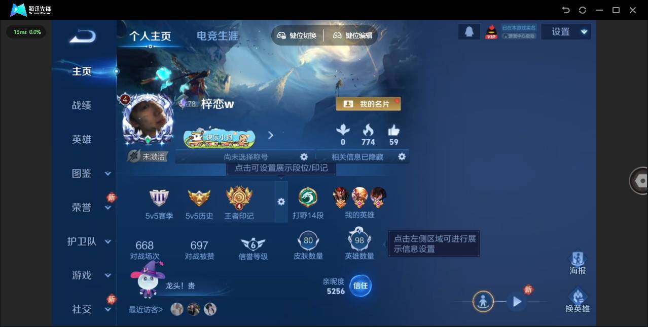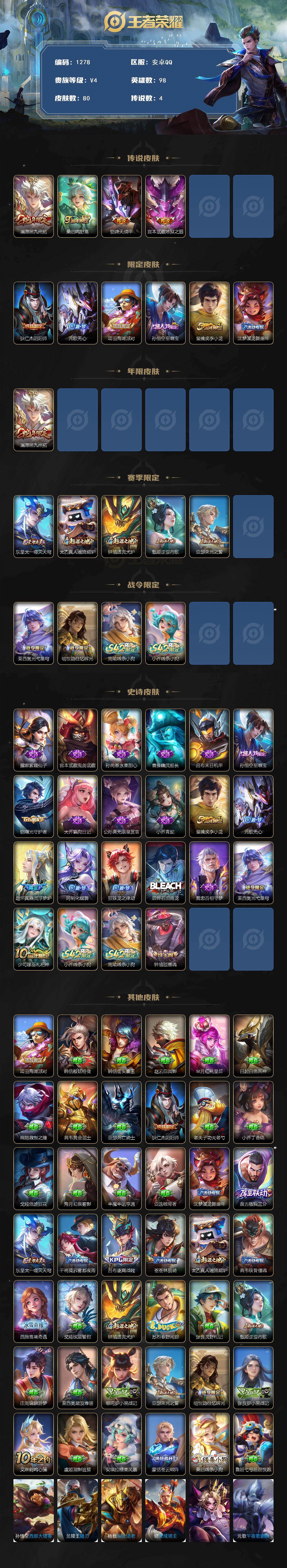2339966 王者荣耀账号 安卓Q-V4-永恒钻石III段位-98英雄-80皮肤-4传说-21史诗