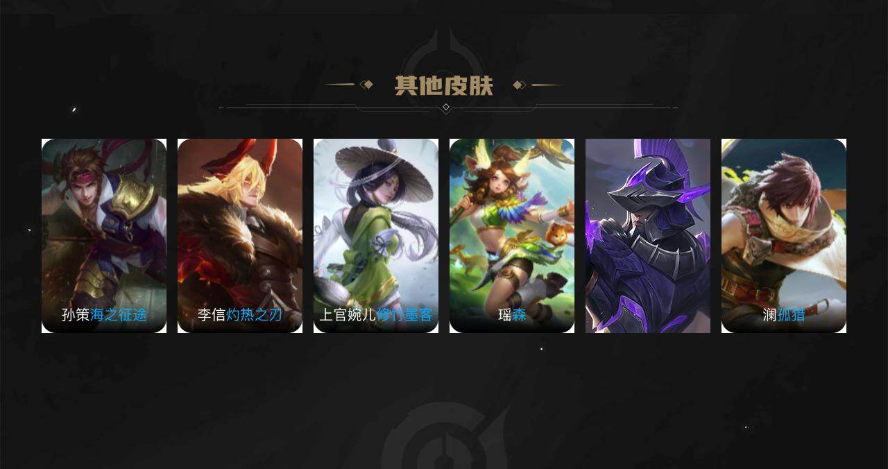 【限定皮肤】:狄仁杰阴阳师,元歌无心,项羽海滩派对,孙悟空至尊宝,裴擒虎李小龙,沈梦溪龙舞盛年