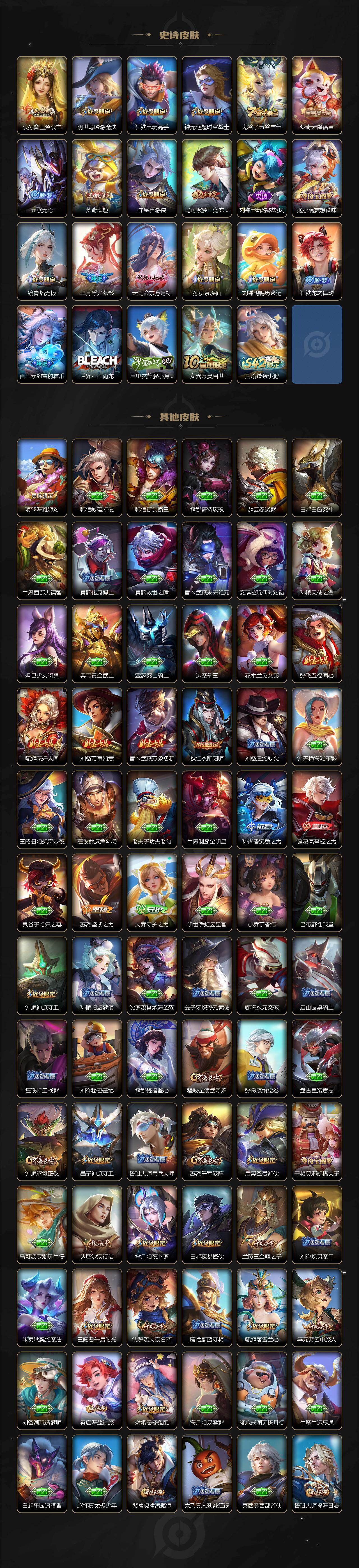 【传说皮肤】:后羿神树通天,虞姬愿照岁时盈,嬴政玄雷天君,貂蝉曦玄引,孙尚香乘龙问璇玑,不知火舞绯月行,女娲补天,孙尚香异界灵契,诸葛亮时雨天司,镜炽阳神光,虞姬启明星使,李信一念神魔,干将莫邪久胜战神,梦奇胖达荣荣,貂蝉
