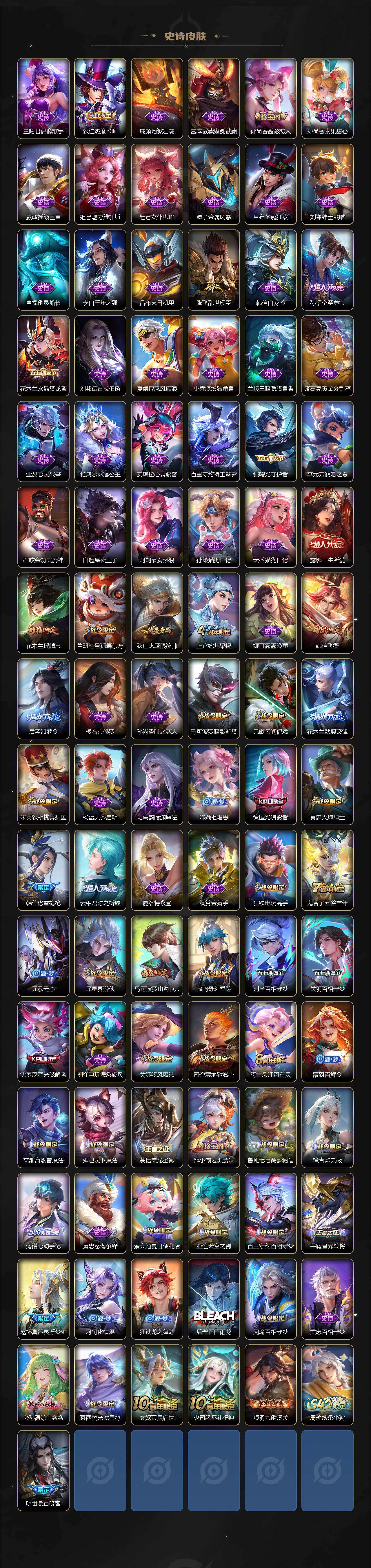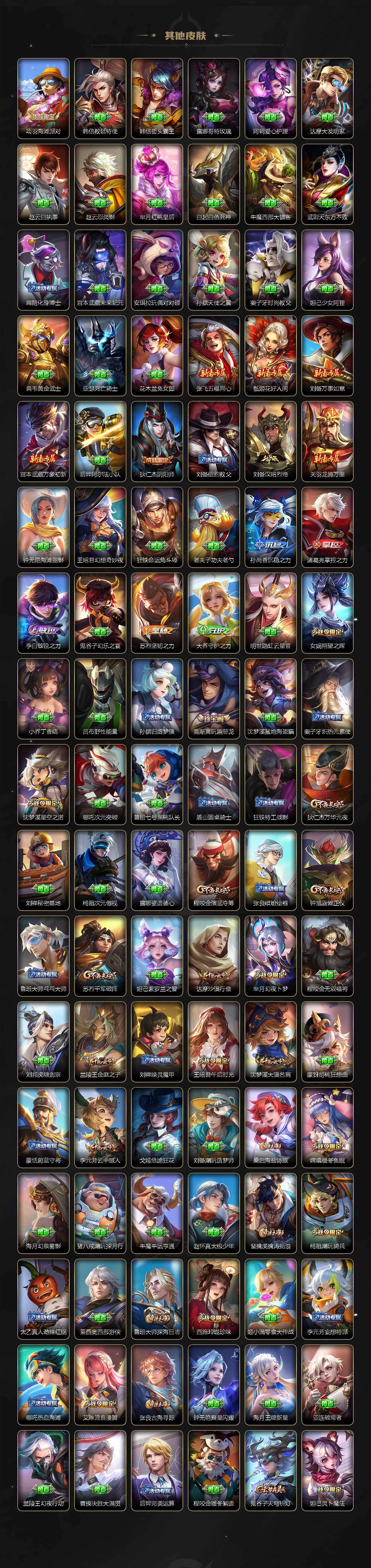 【限定皮肤】:蔡文姬夏日便利店,大乔绒语心约,虞姬夏日便利店,姜子牙天穹之誓,狄仁杰阴阳师,小乔山海琳琅生,赵云皇家上将,孙尚香蔷薇恋人,鲁班七号狮舞东方,高渐离玩趣恶龙,扁鹊奇幻香踪,芈月幻夜卜梦,元歌云间偶戏,元歌无心,马可波罗暗影游猎,马可波罗山海玄木吟,狄仁杰魔术师,狄仁杰万华元夜,达摩