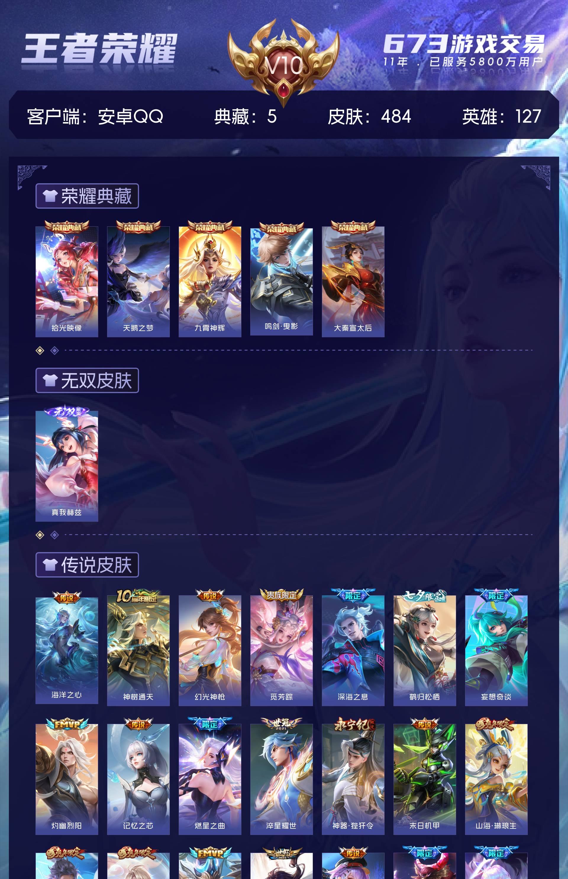 安卓QQ/最强王者/484皮肤/127英雄/5典藏/0珍品无双/1无双/0珍品传说/58传说/166