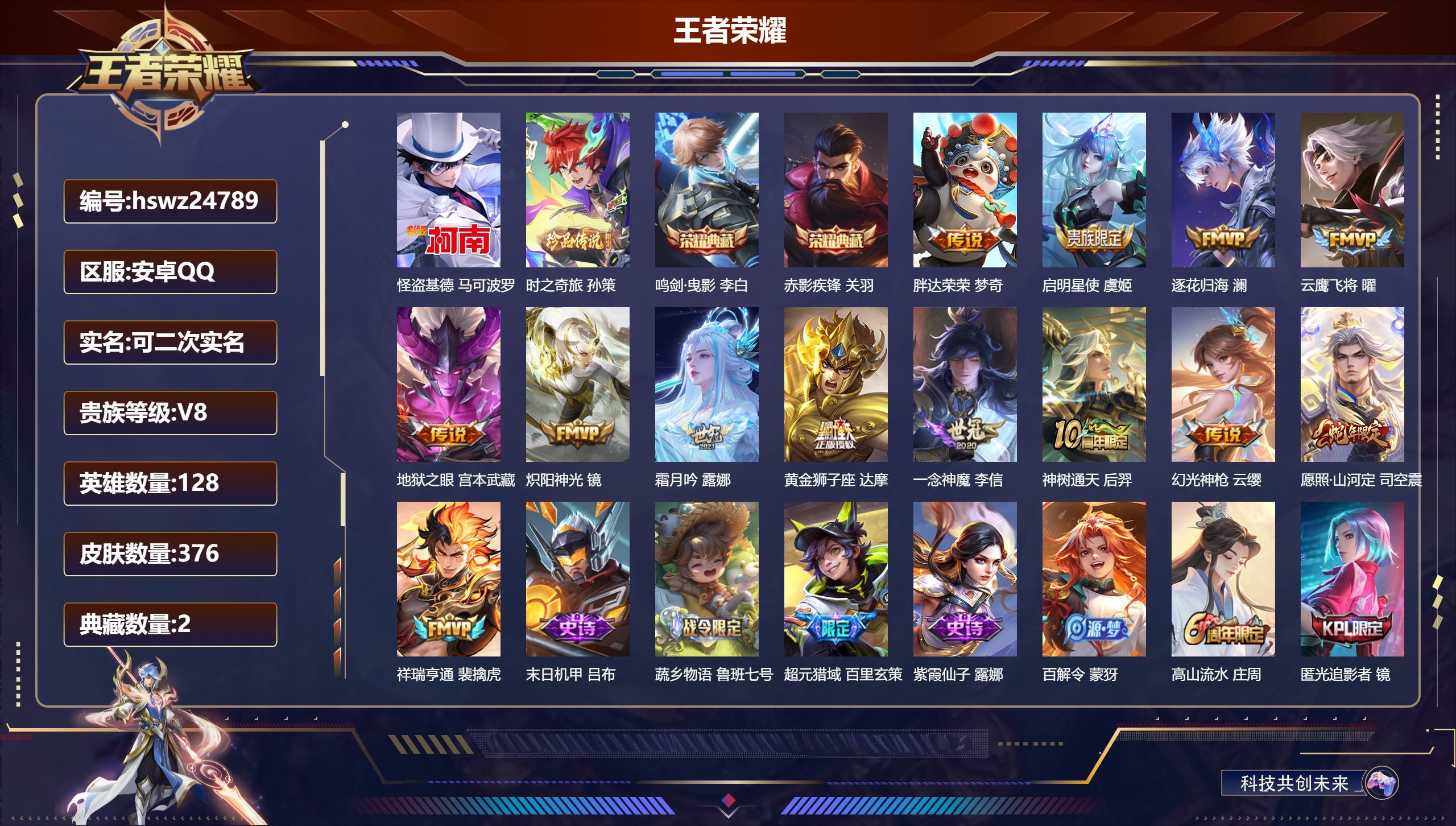 安卓QQ/永恒钻石/376皮肤/128英雄/2典藏/0珍品无双/0无双/2珍品传说/13传说/107