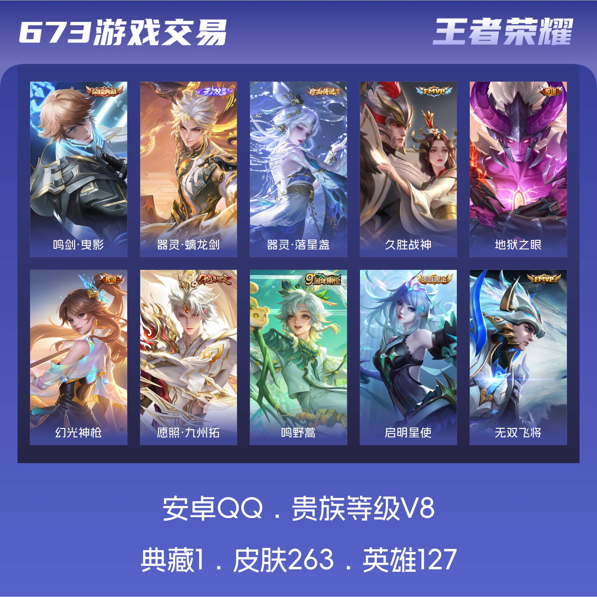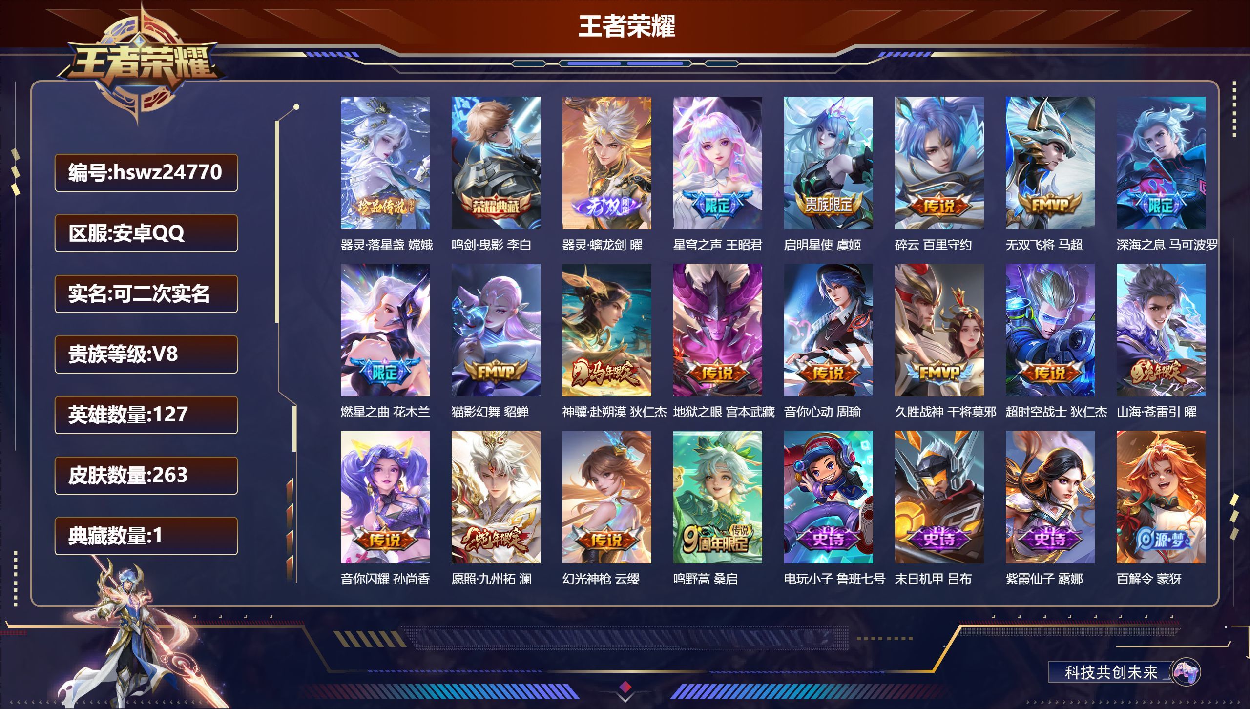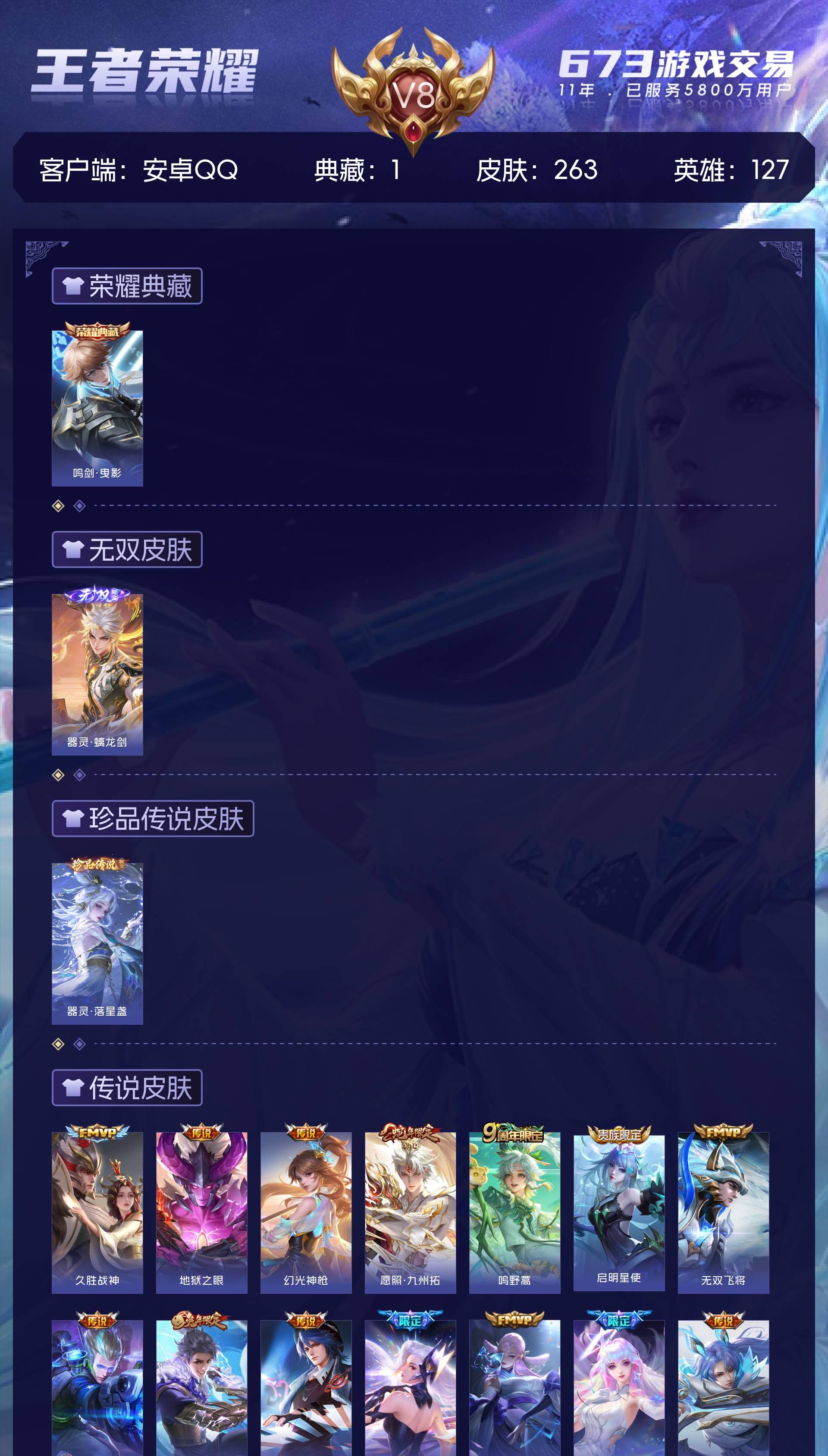 安卓QQ/至尊星耀/263皮肤/127英雄/1典藏/0珍品无双/1无双/1珍品传说/17传说/84史