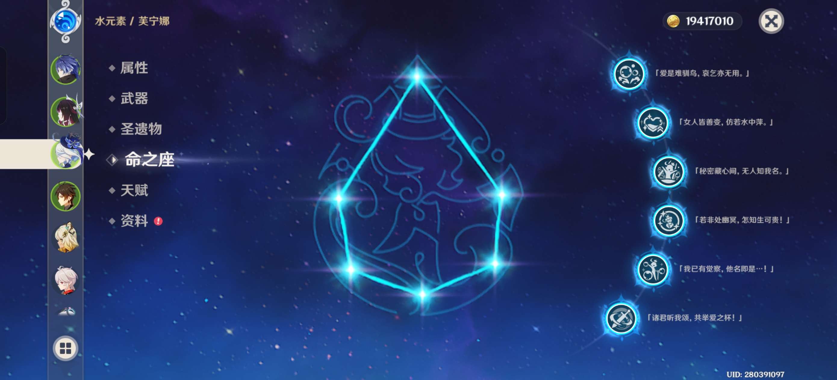 满命6+1水神 二命钟离 二命雷神 胡桃有装扮月体系 纳塔旗舰队等等都有先到先得吧不玩了
