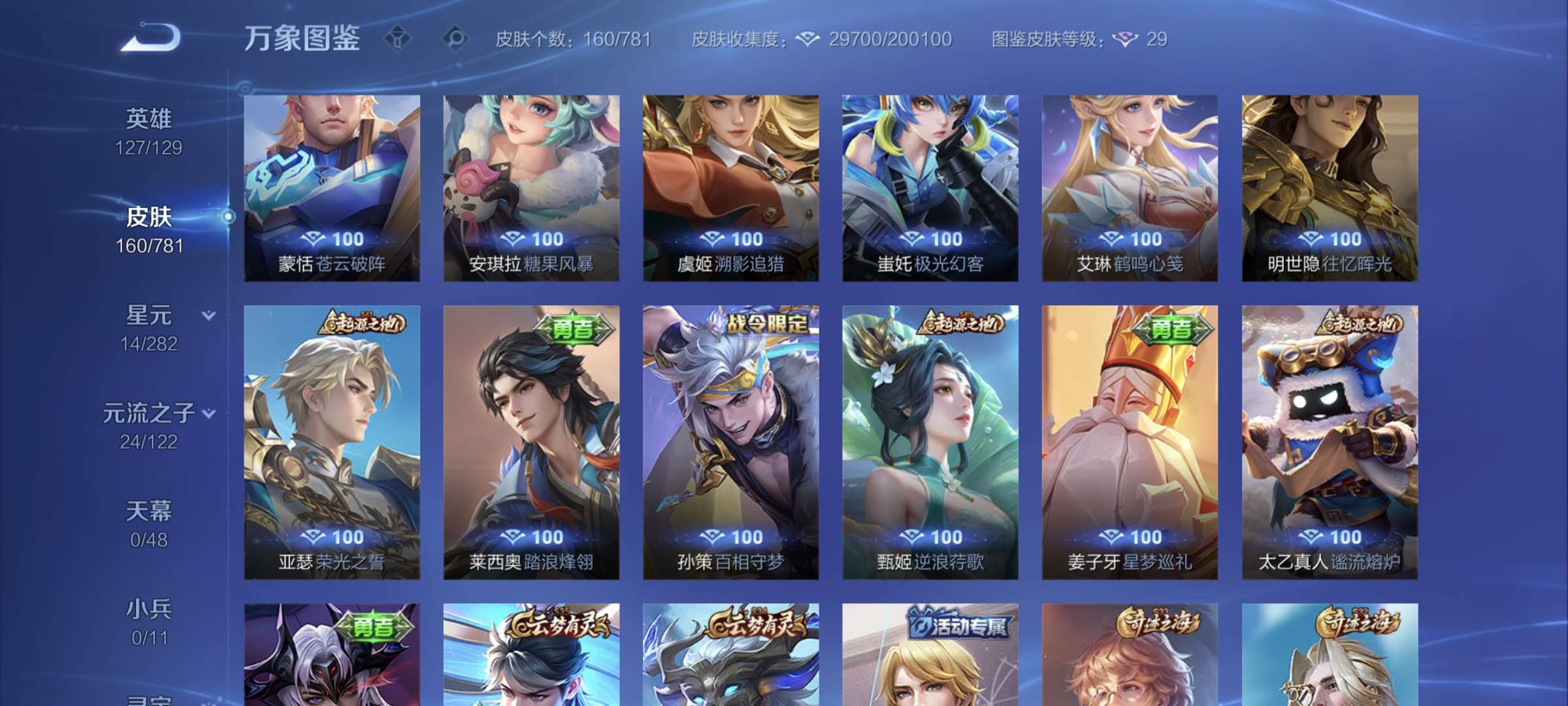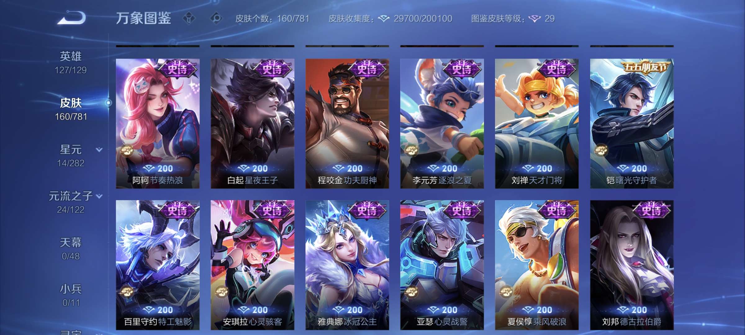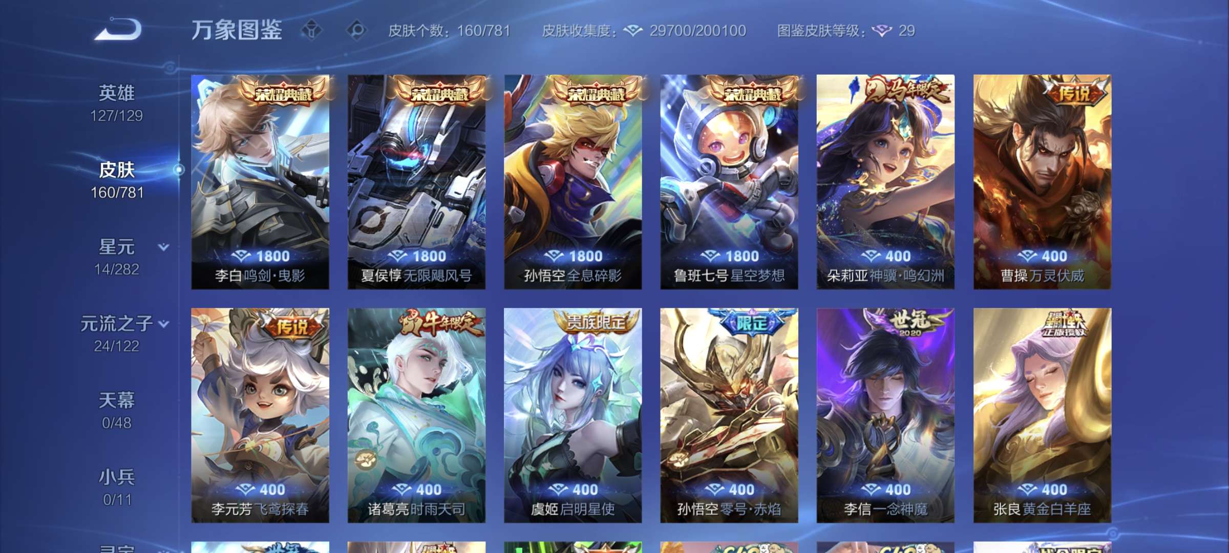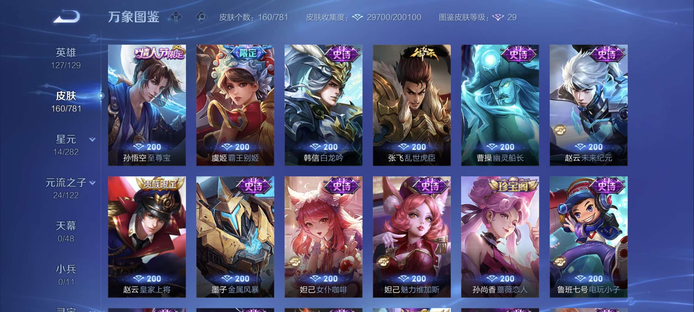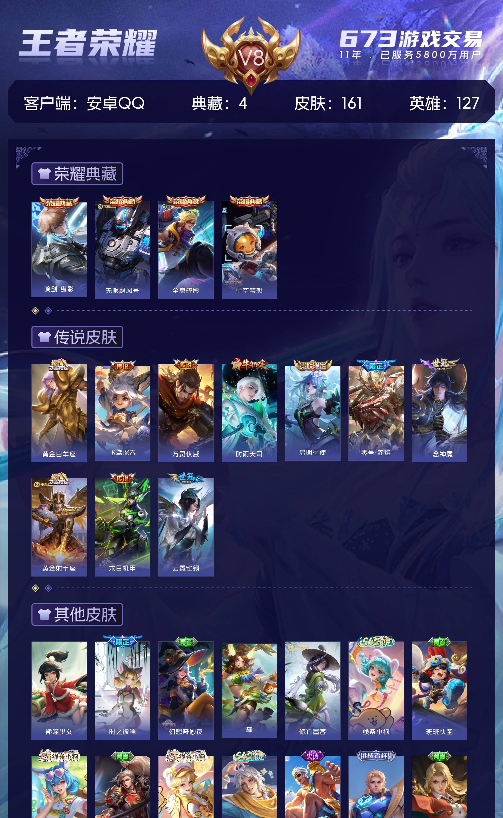 V8 皮肤161 英雄127 尊贵铂金 荣耀典藏4 传说10 其他皮肤150