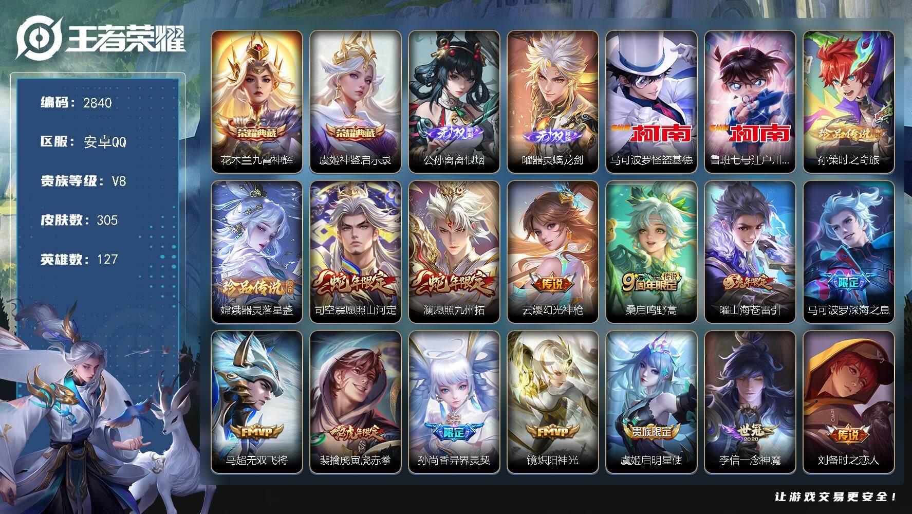 767-[17104930]贵族8-贵族积分81054-305皮2典藏17传说2无双4珍品传说-2个英雄全皮 万战曜 8339马可波罗 8705公孙离 安卓手Q275区305皮2典藏17传说2无双4珍品传说V8 营地ID419683769至尊星耀IV【珍品传说皮肤】:时之奇旅,器灵·落星盏,怪盗基德,江户川柯南【无双皮肤】:器灵·螭龙剑,离恨烟【荣耀典藏】:神鉴启示录,九霄神辉【优质限定皮肤】:无双飞将,山海·苍雷引【传说皮肤】:幻光神枪,愿照·山河定,愿照·九州拓,鸣野蒿,启明星