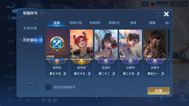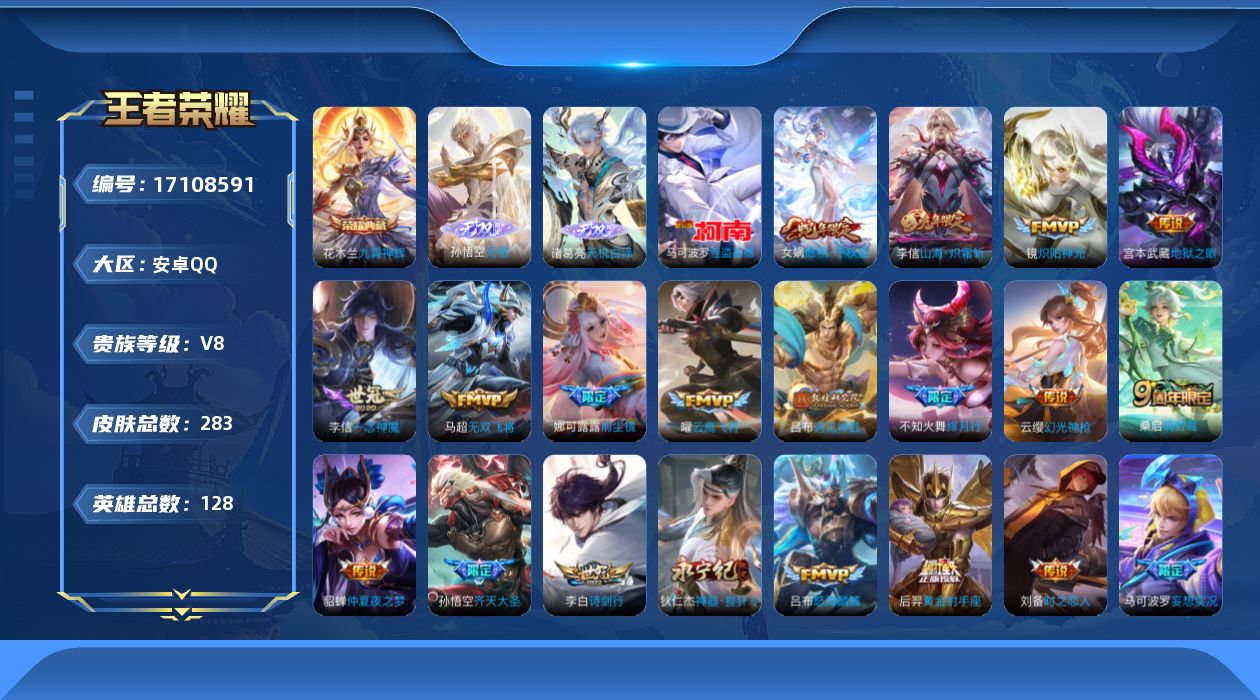 115-[17108591]贵族8-贵族积分86032-283皮1典藏27传说2无双1珍品传说-5个英雄全皮 金标狂铁 安卓手Q355区283皮1典藏27传说2无双1珍品传说V8 营地ID1896395131无双王者【珍品传说皮肤】:怪盗基德【无双皮肤】:无相,天机白泽【荣耀典藏】:九霄神辉【优质限定皮肤】:至尊宝,山海·炽霜斩,无双飞将【传说皮肤】:幻光神枪,愿照·千秋盛,鸣野蒿,遇见神鼓,炽阳神光,时之恋人,妄想奇谈,妄想实况,地狱之眼,乞巧织情,启明星使,仲夏夜之梦,山海·炽霜斩,齐天