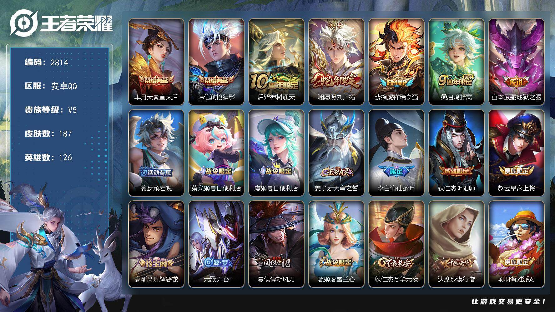 725-[17107927]可二次 贵族5-金标芈月、影-187皮-2典藏-0无双-0珍品传说-5传说-1全皮英雄-星传说幽冥之眼 安卓手Q317区 营地ID1670322536永恒钻石I【荣耀典藏】:弑枪猎影,大秦宣太后【传说皮肤】:神树通天,祥瑞亨通,愿照·九州拓,鸣野蒿,地狱之眼【史诗皮肤】:九幽镇关,龙之律动,猫狗日记,时之恋人,黄金分割率,万灵启世,暗隐猎兽者,缤纷独角兽,百相守梦,星界战将,乐园奇幻夜,器灵·浮梦炉,皇家上将,暗渊魔法,原初追逐者,冰雪圆舞曲,茶境仙,水晶猎龙者,天秀
