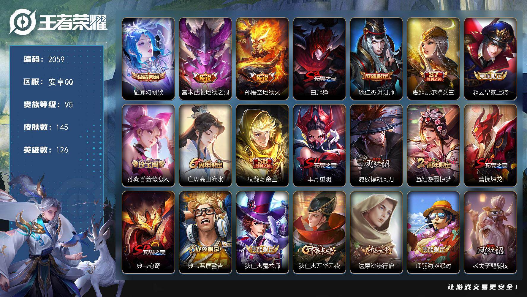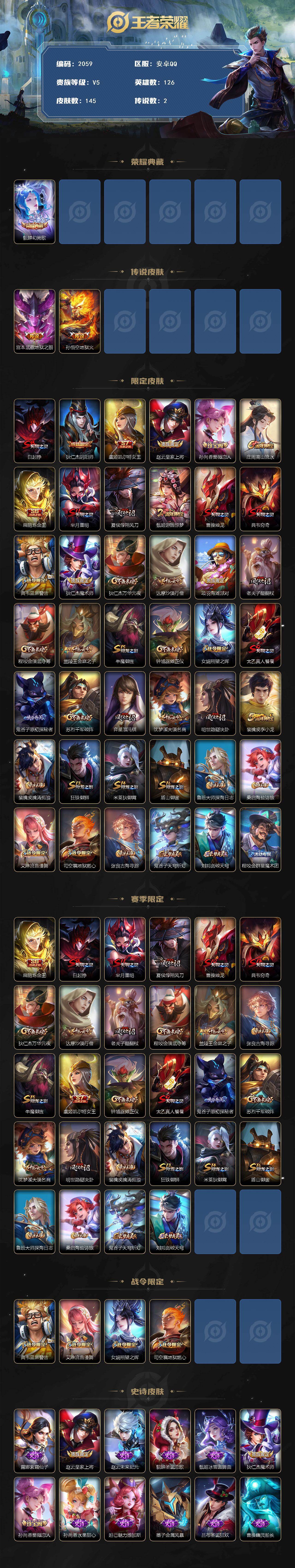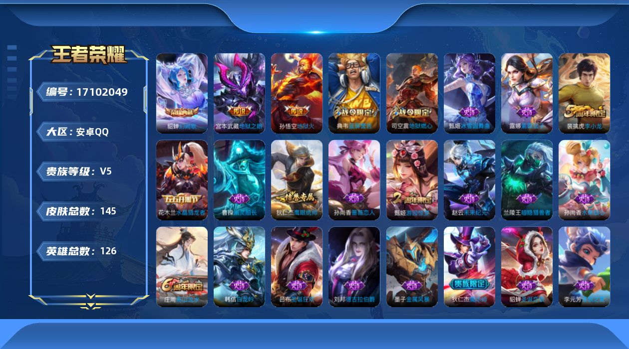 745-[17102049]可二次 皇冠号 贵族6-145皮1典藏2传说 安卓手Q165区145皮1典藏2传说0无双V5 营地ID475326976永恒钻石II【荣耀典藏】:幻阙歌【传说皮肤】:地狱之眼,地狱火【史诗皮肤】:未来纪元,逐浪之夏,圣诞恋歌,白龙吟,暗隐猎兽者,德古拉伯爵,蔷薇恋人,冰雪圆舞曲,地狱燃心,圣诞狂欢,功夫厨神,高山流水,李小龙,金属风暴,鹰眼统帅,蓝屏警告,水果甜心,魔术师,紫霞仙子,皇家上将,水晶猎龙者,冰冠公主,游园惊梦,魅力维加斯,幽灵船长