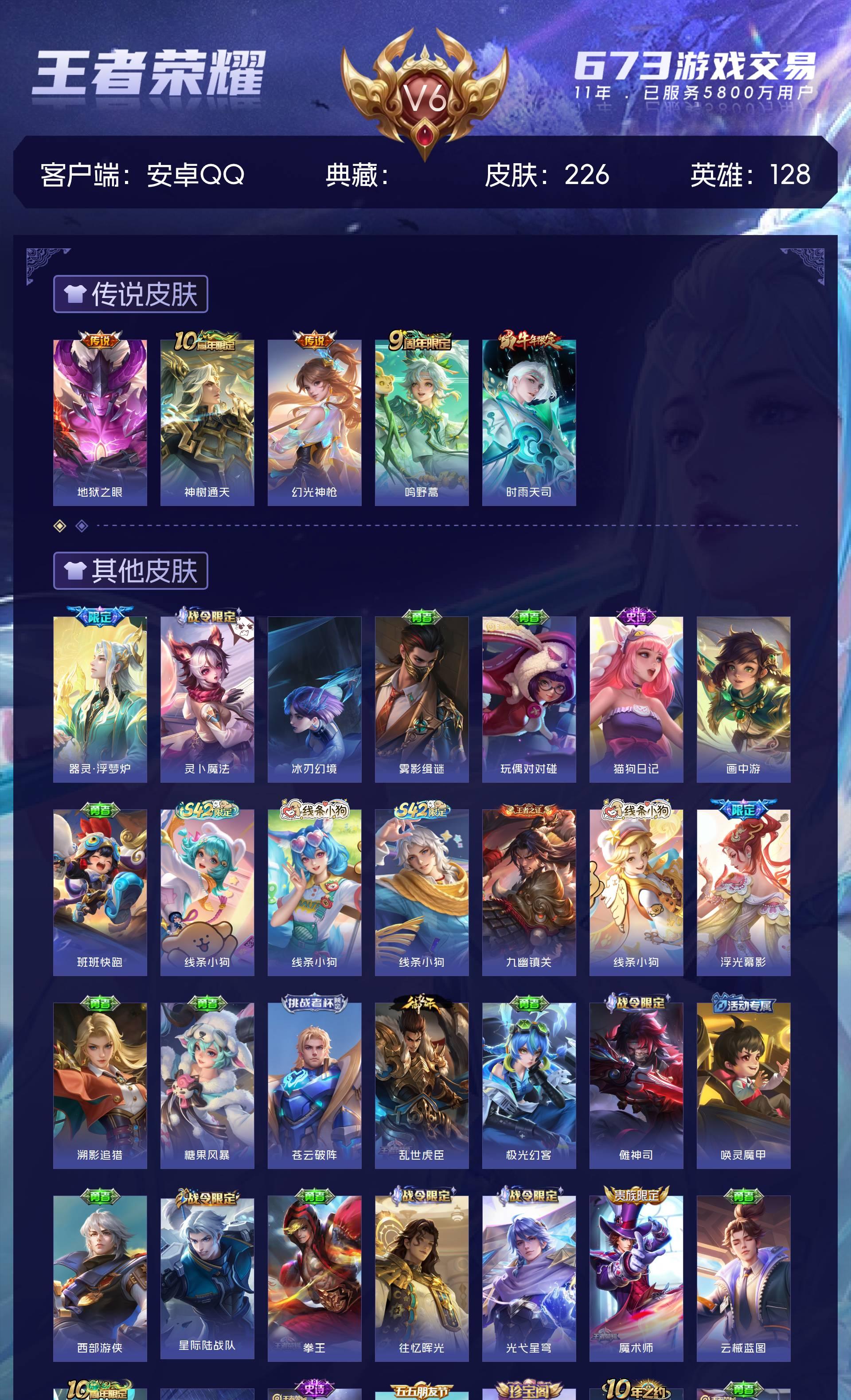 V6 皮肤226 英雄128 永恒钻石 传说5 其他皮肤224