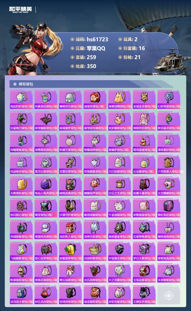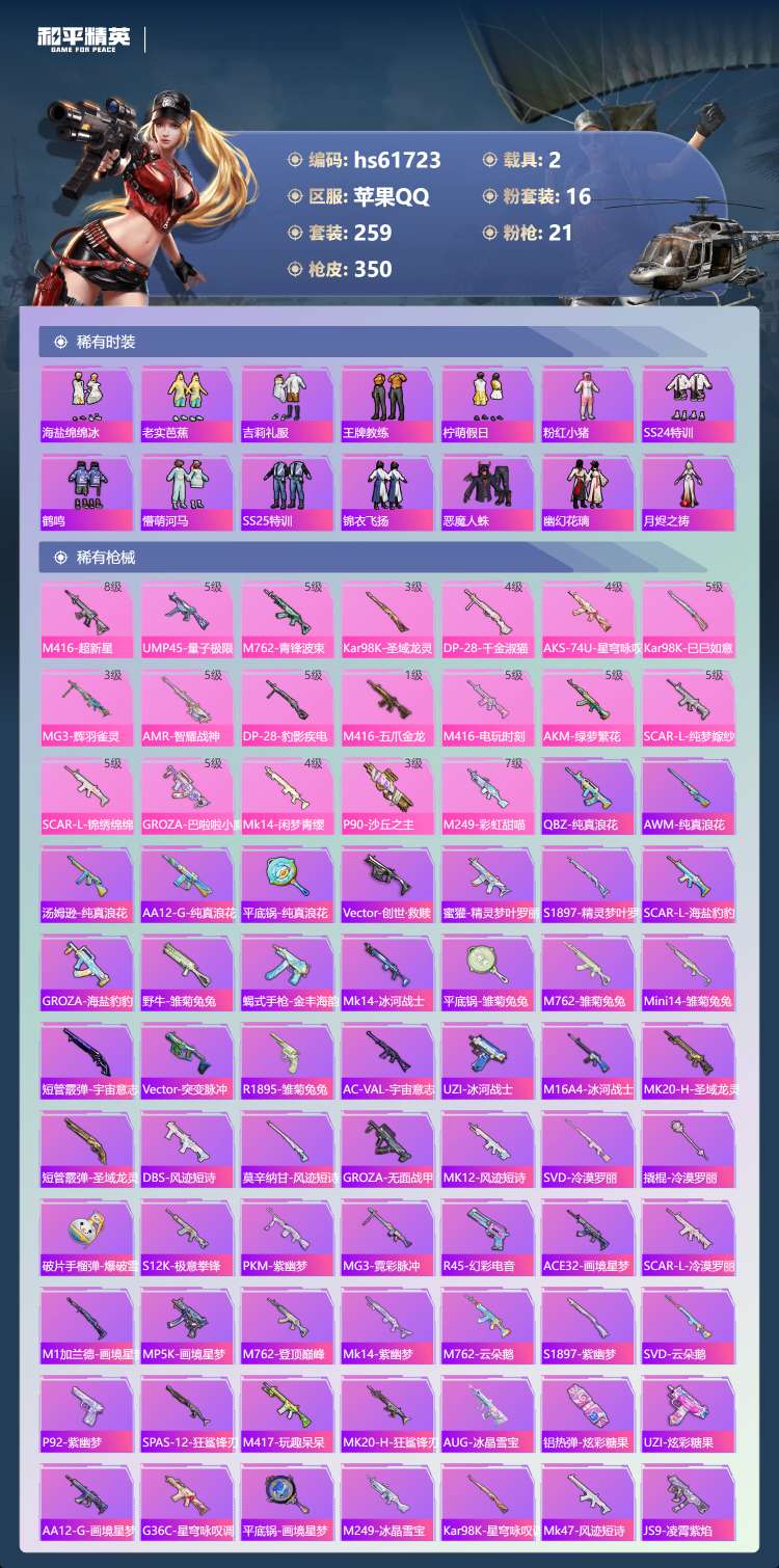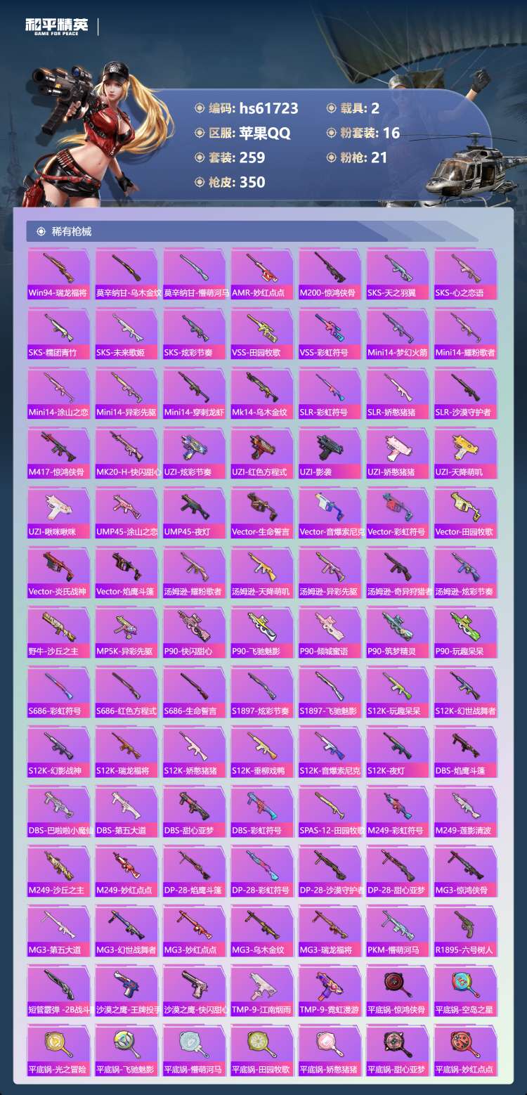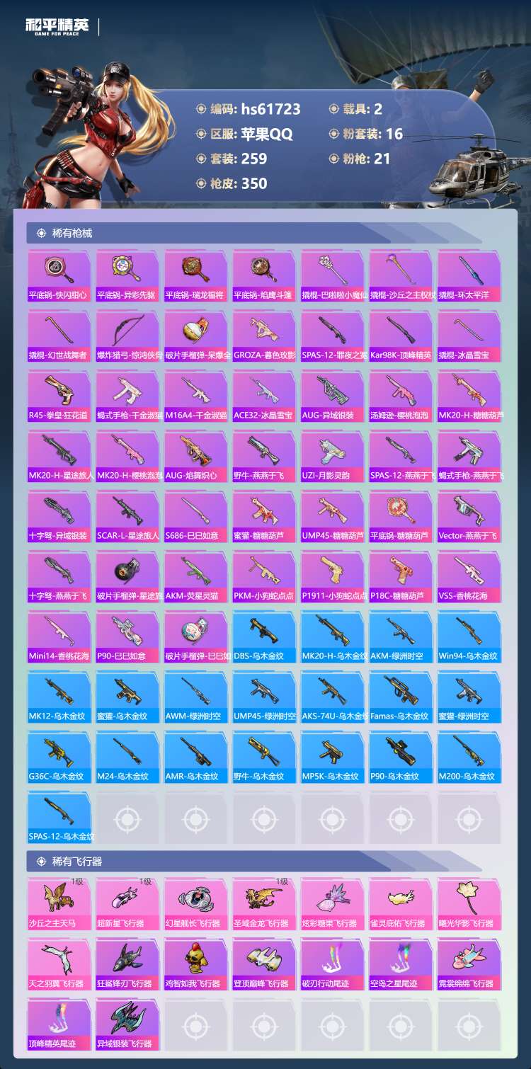 hs61723 苹果手Q-21王牌印记-有战神框-3红装-16粉装-21特效枪-2载具-124921