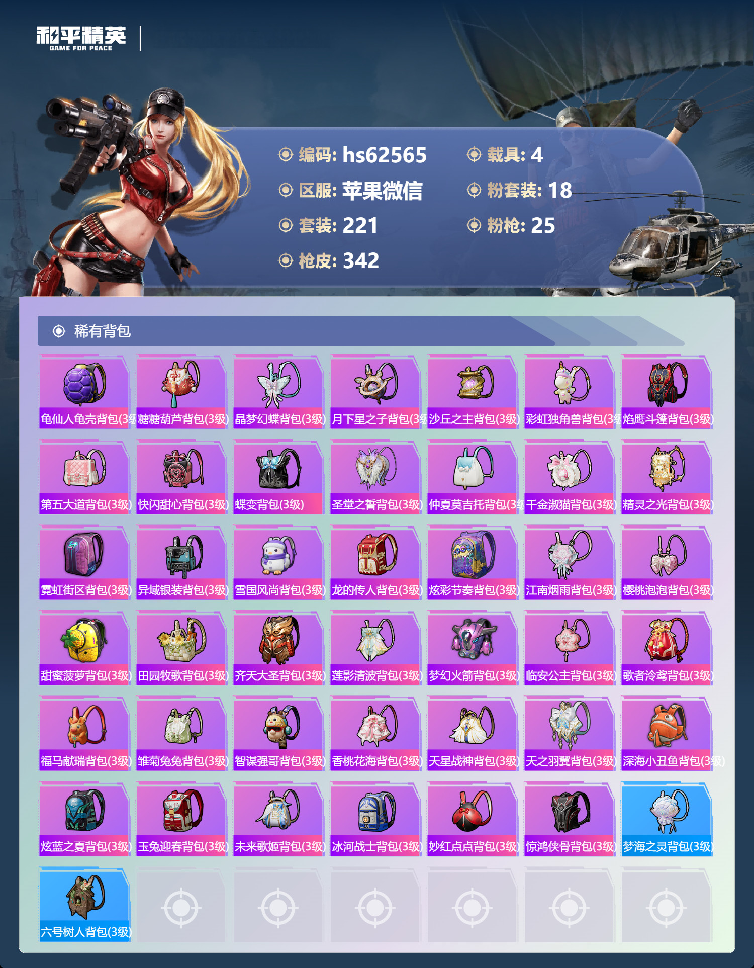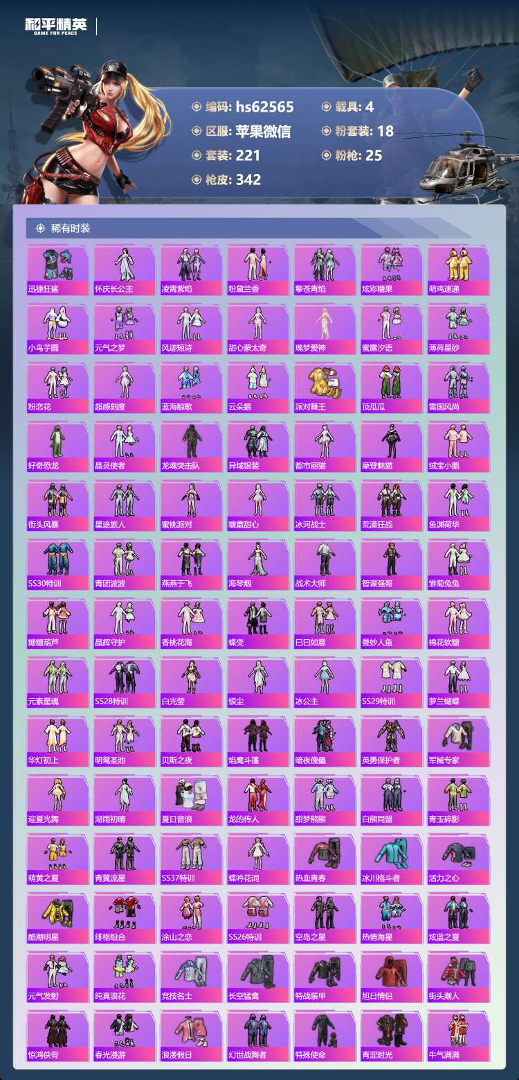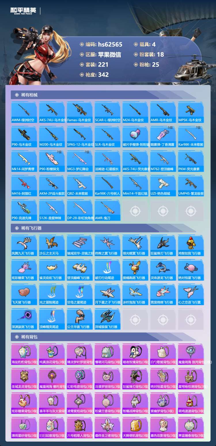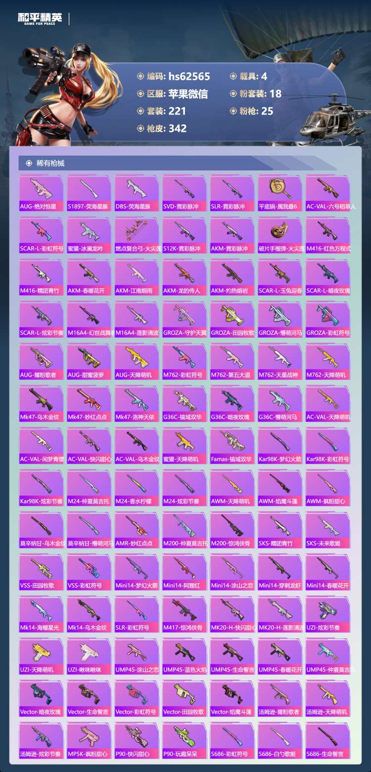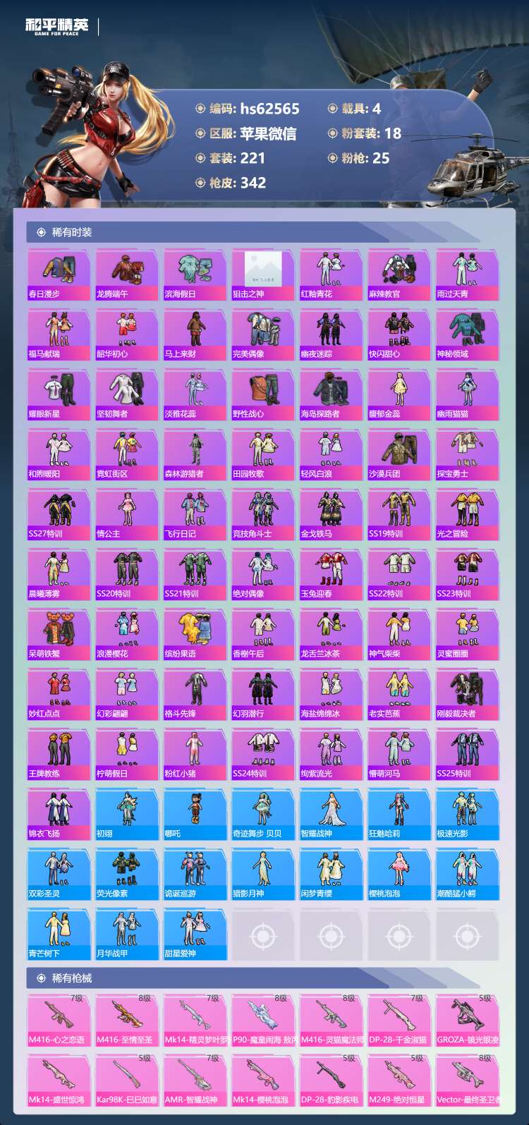 hs62565 苹果微-18王牌印记-2红装-18粉装-25特效枪-4载具-131815热力值-2