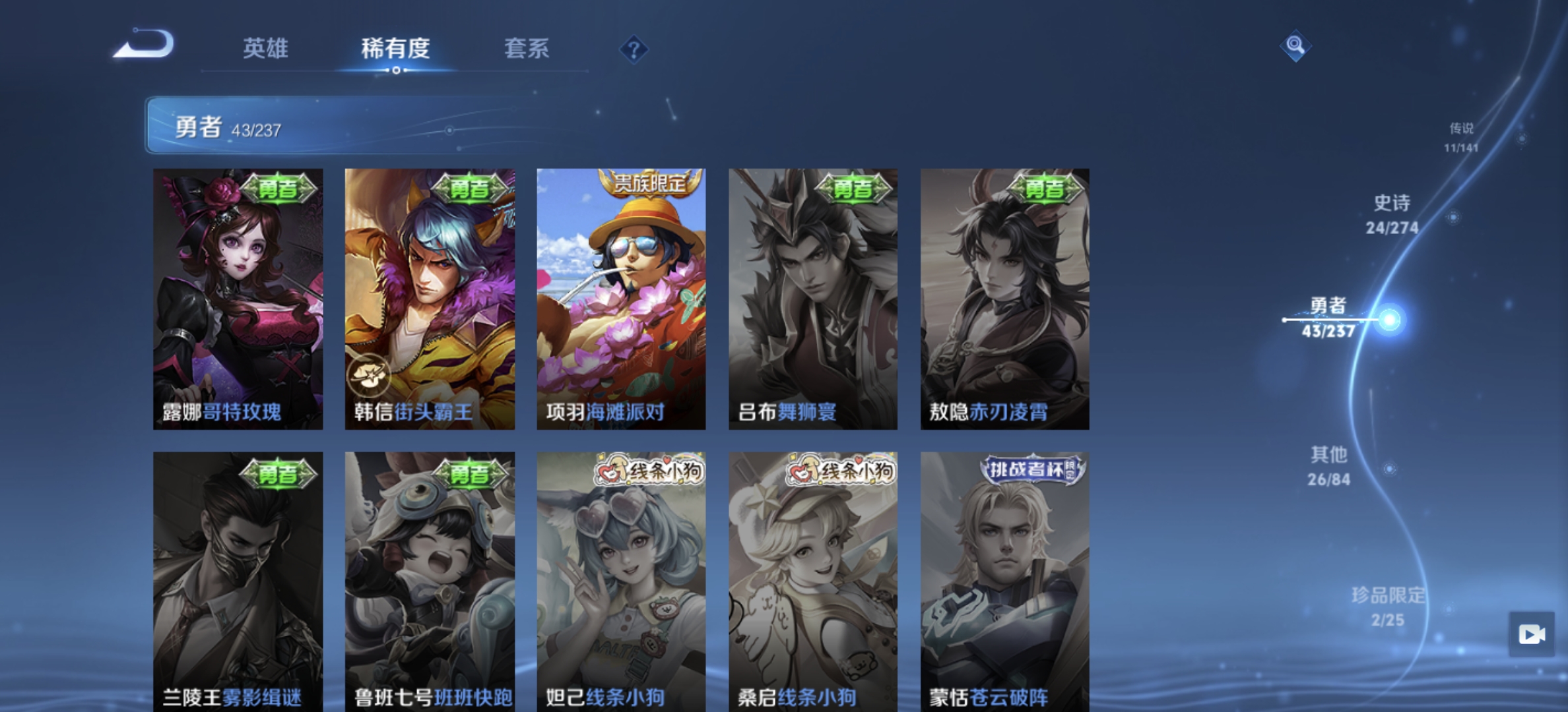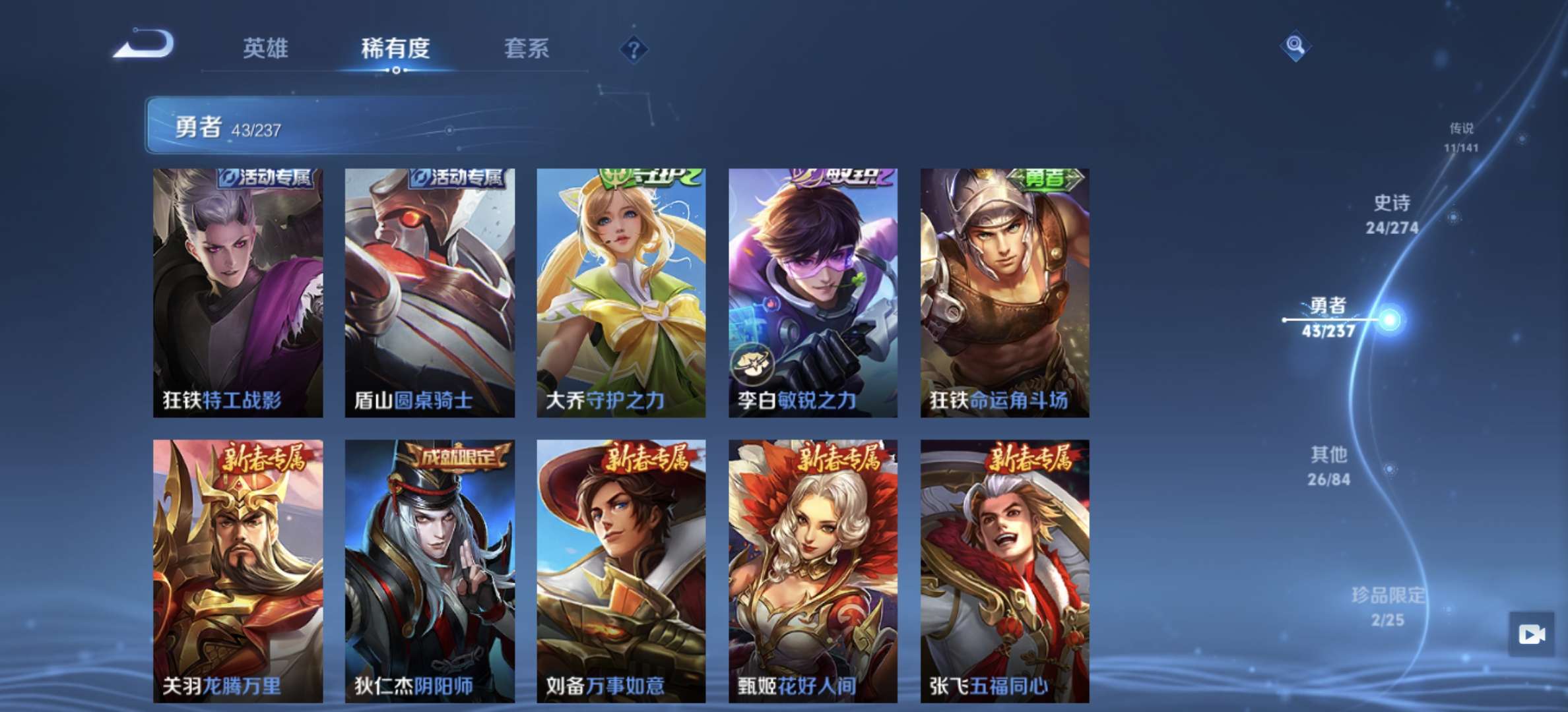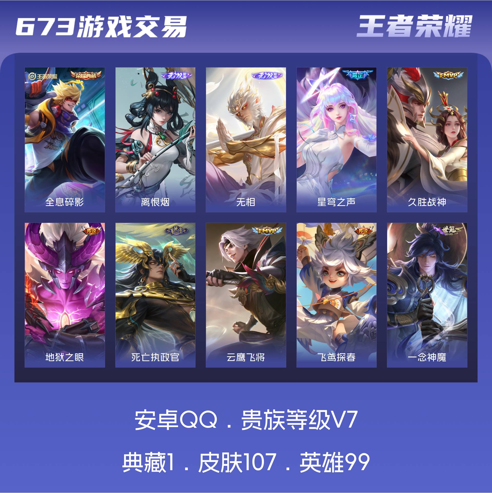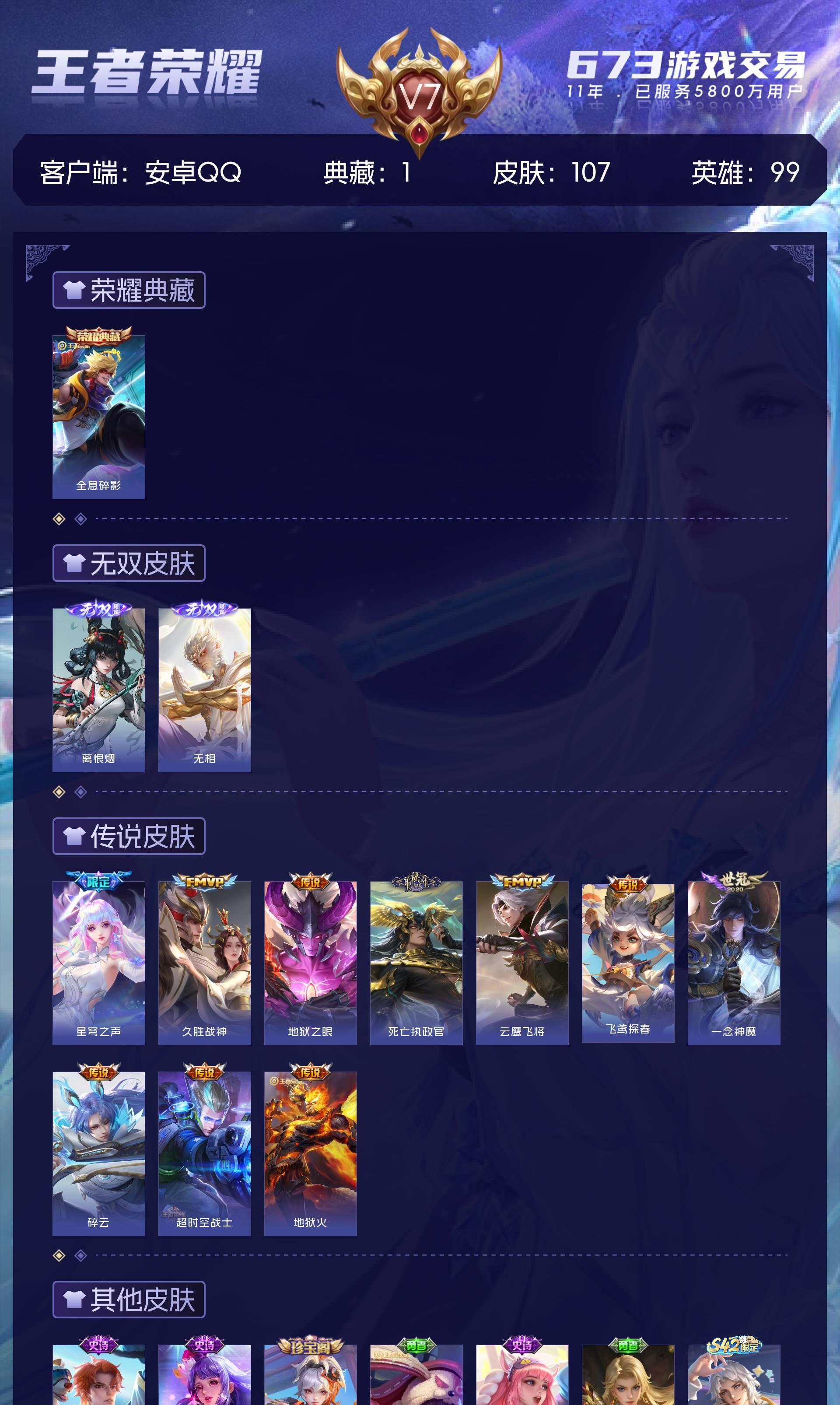 V7 皮肤107 英雄99 无双王者 荣耀典藏1 无双皮肤2 星传说1 传说10 其他皮肤98
