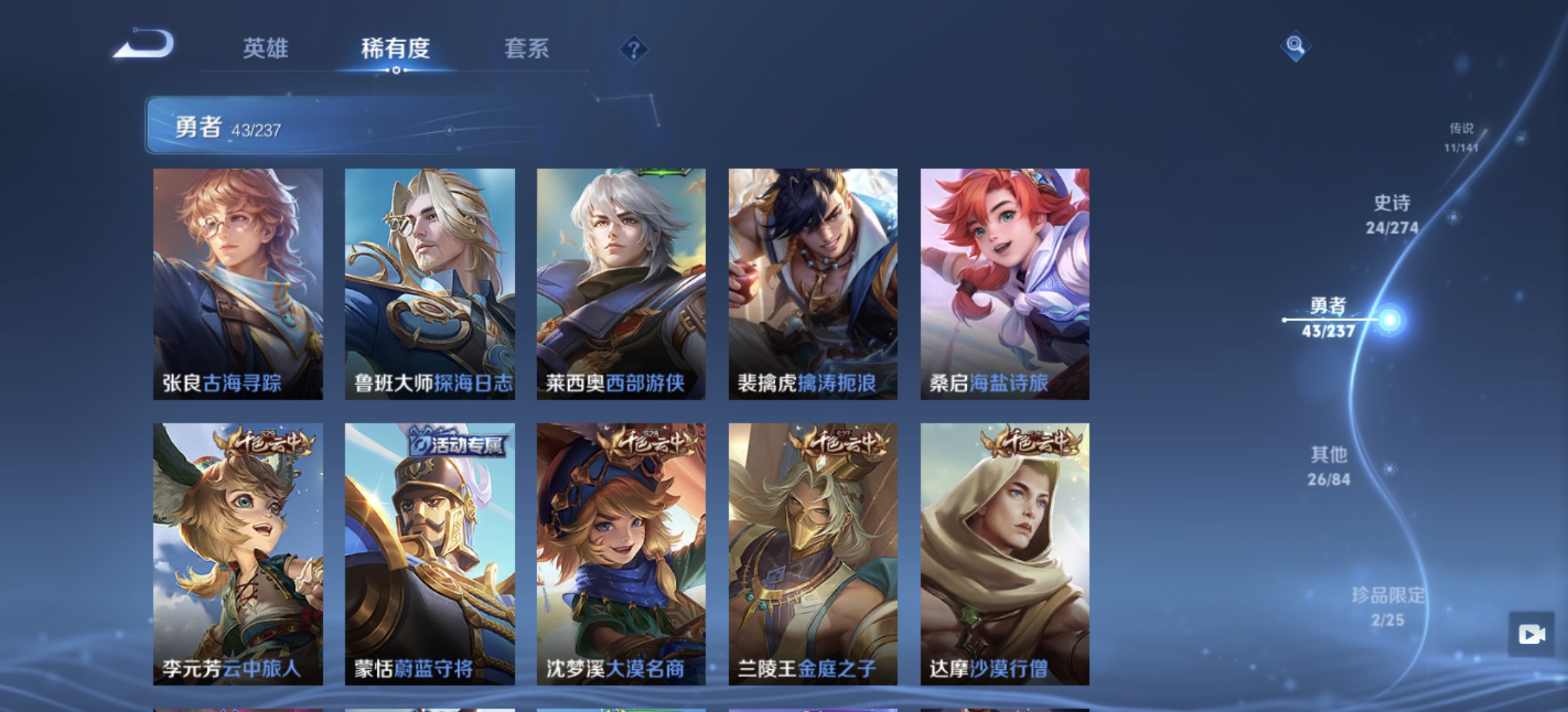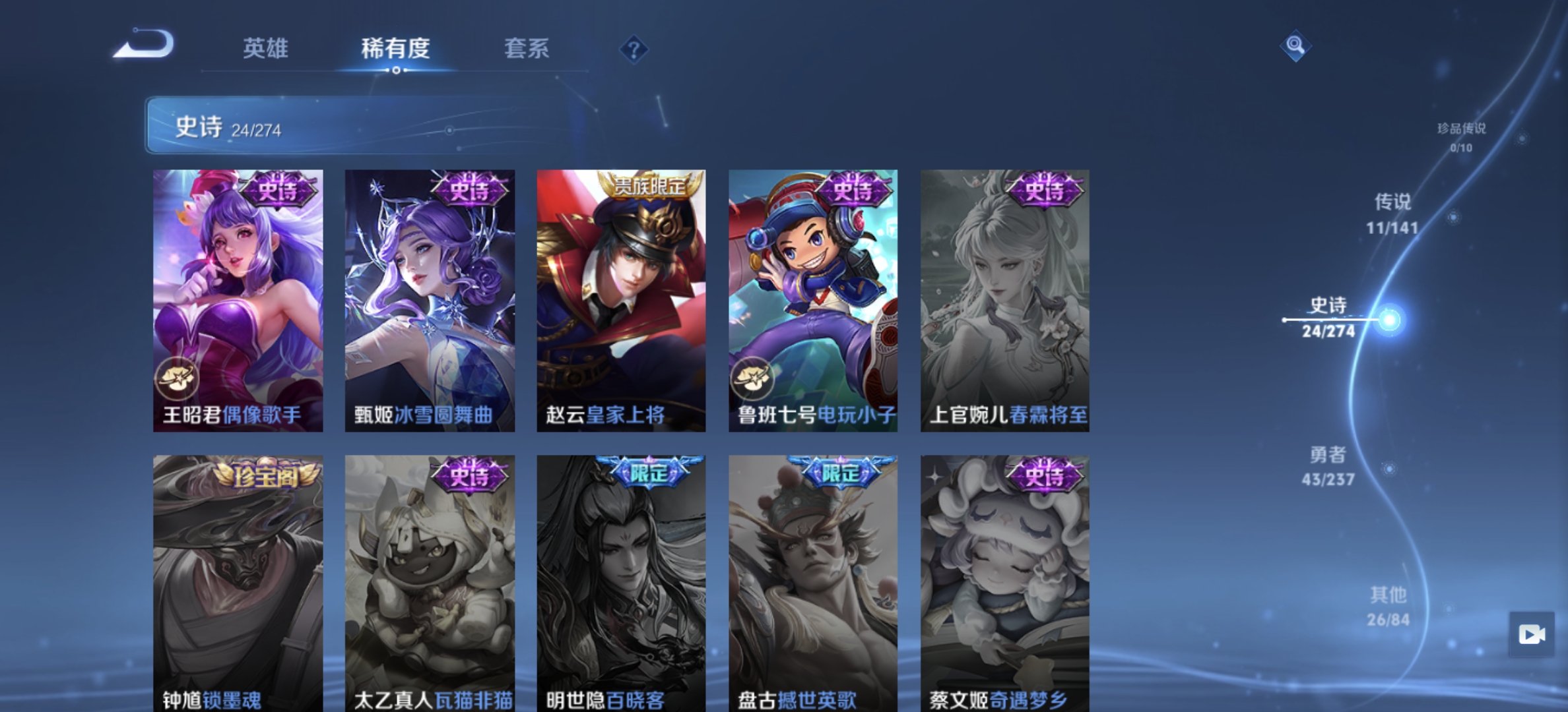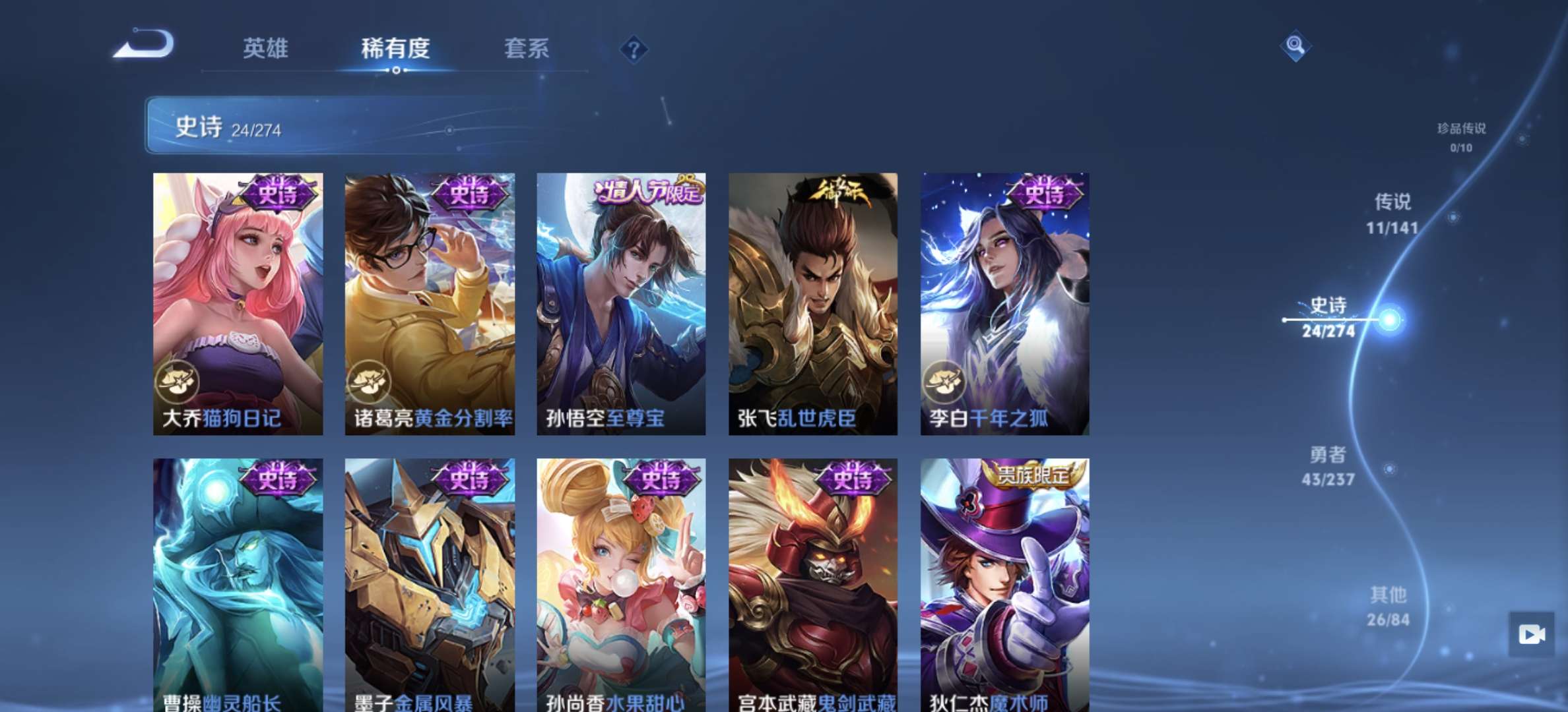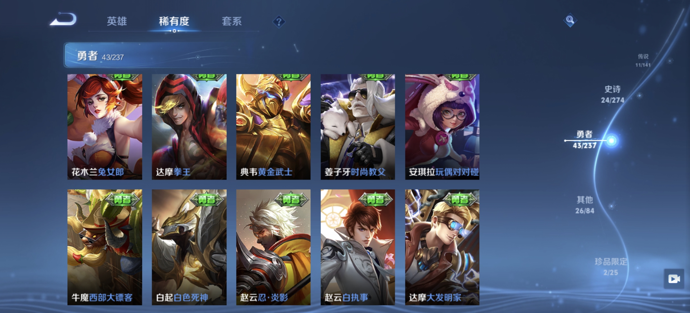 V7 皮肤107 英雄99 无双王者 荣耀典藏1 无双皮肤2 星传说1 传说10 其他皮肤98