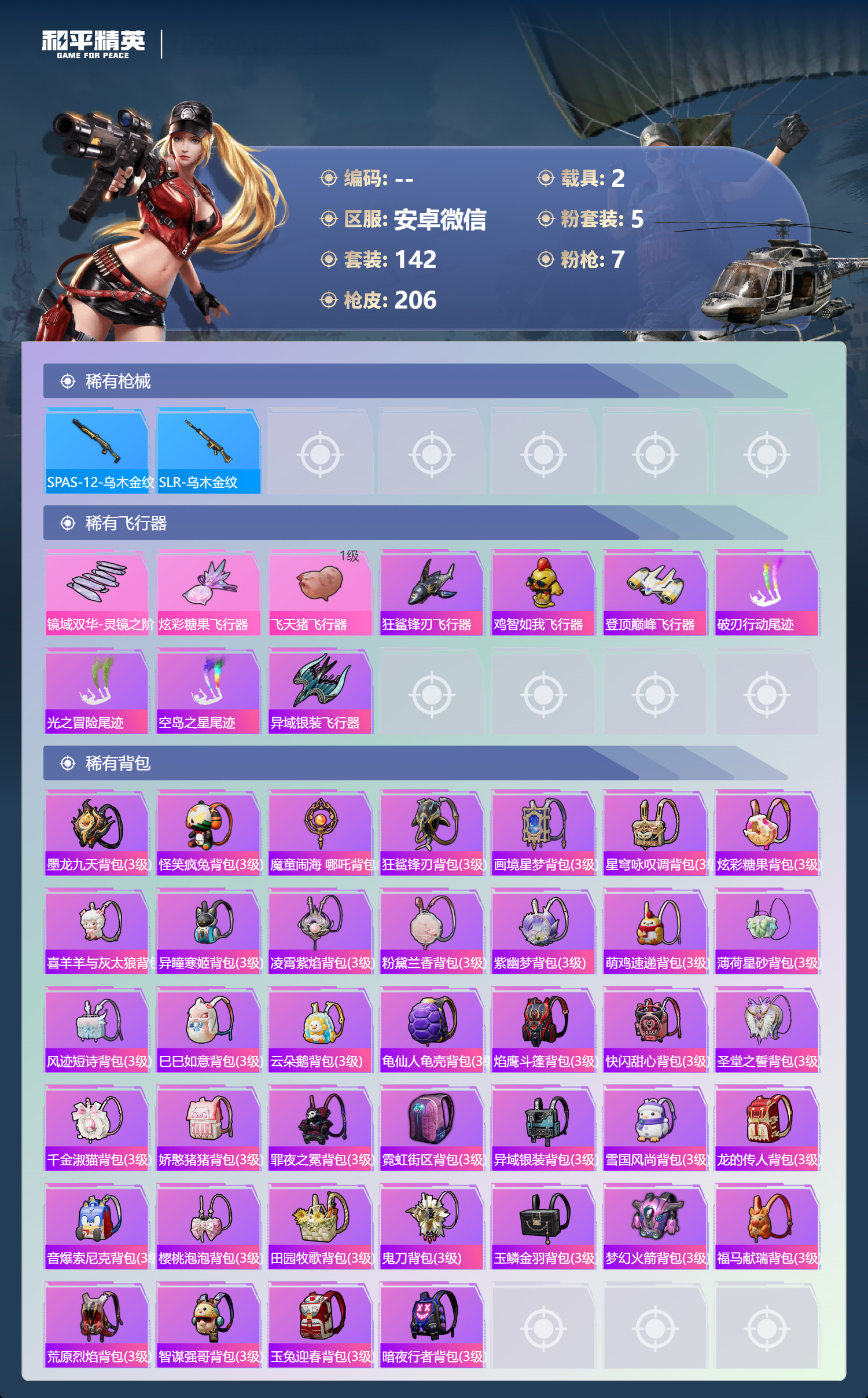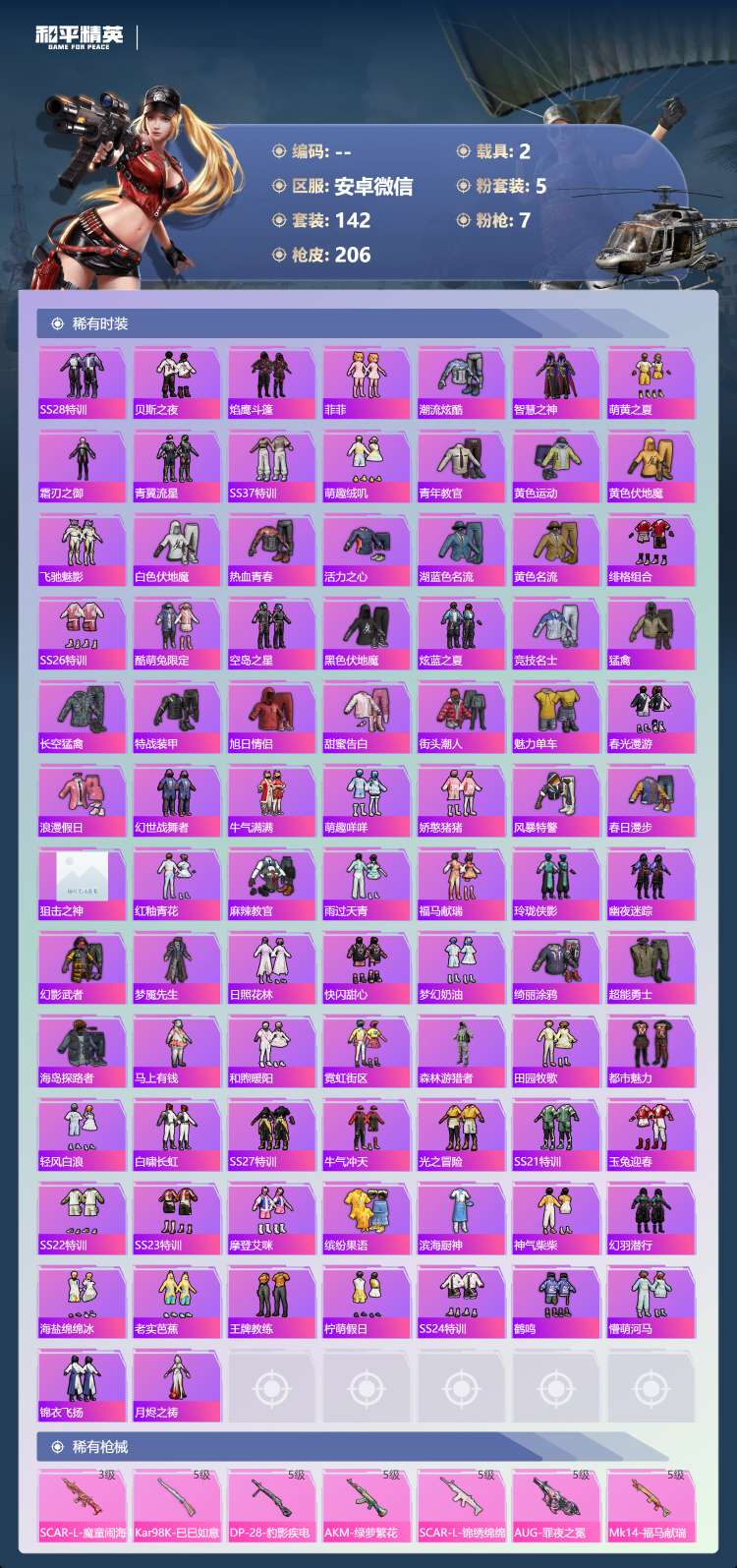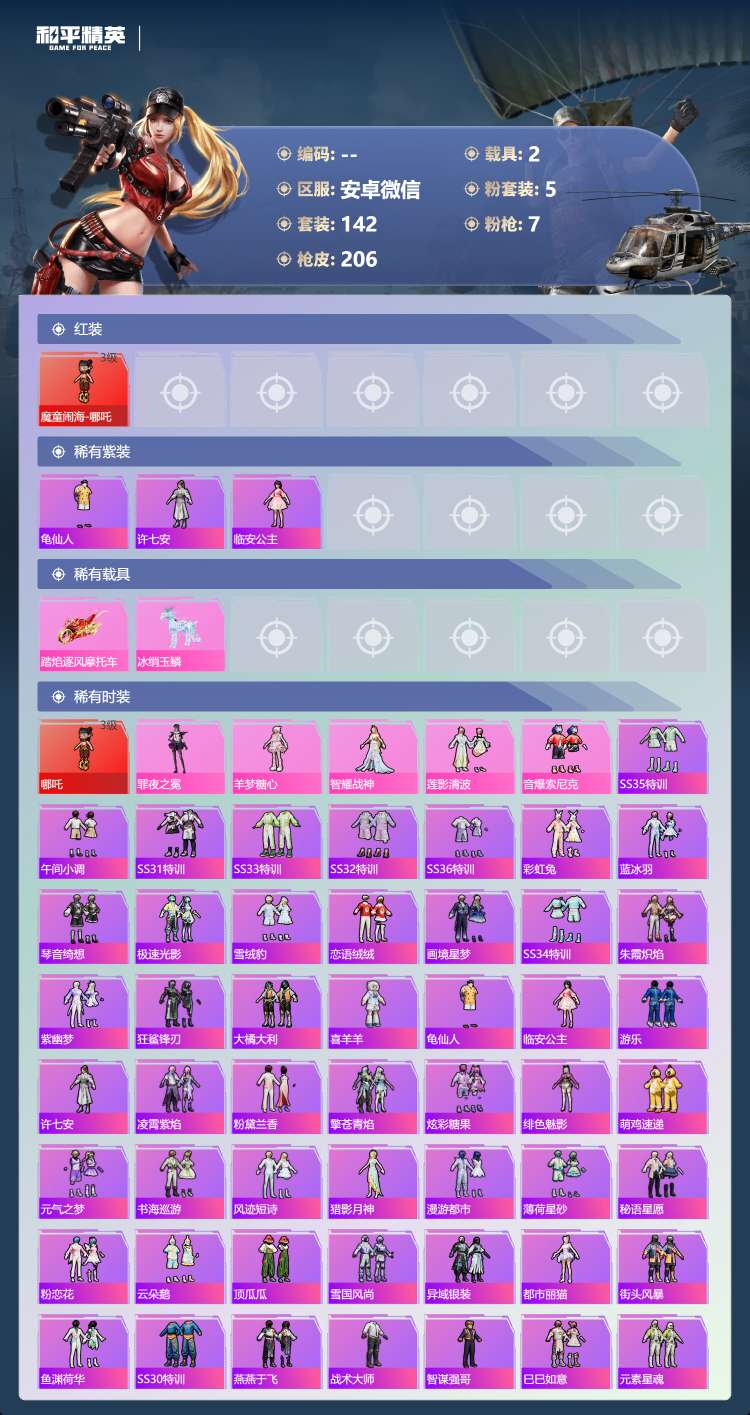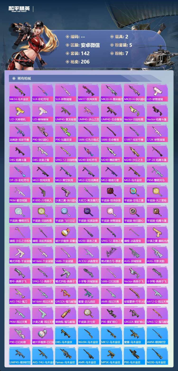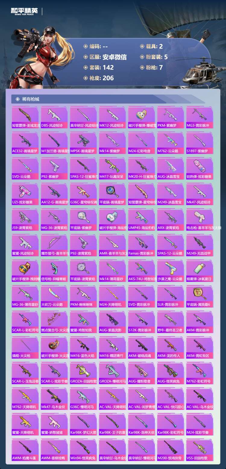 hs62570 安卓微-10王牌印记-1红装-5粉装-7特效枪-2载具-66608热力值-142套