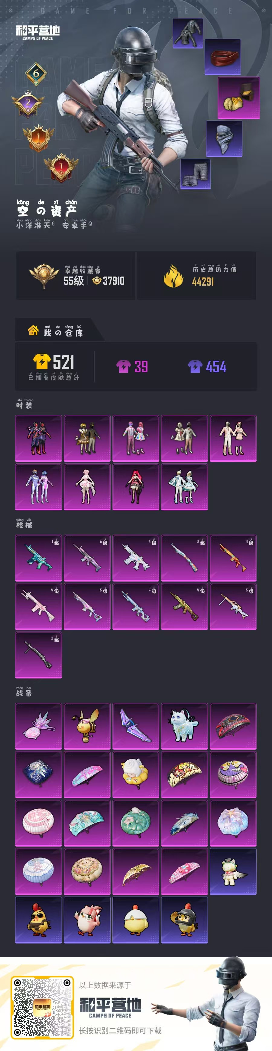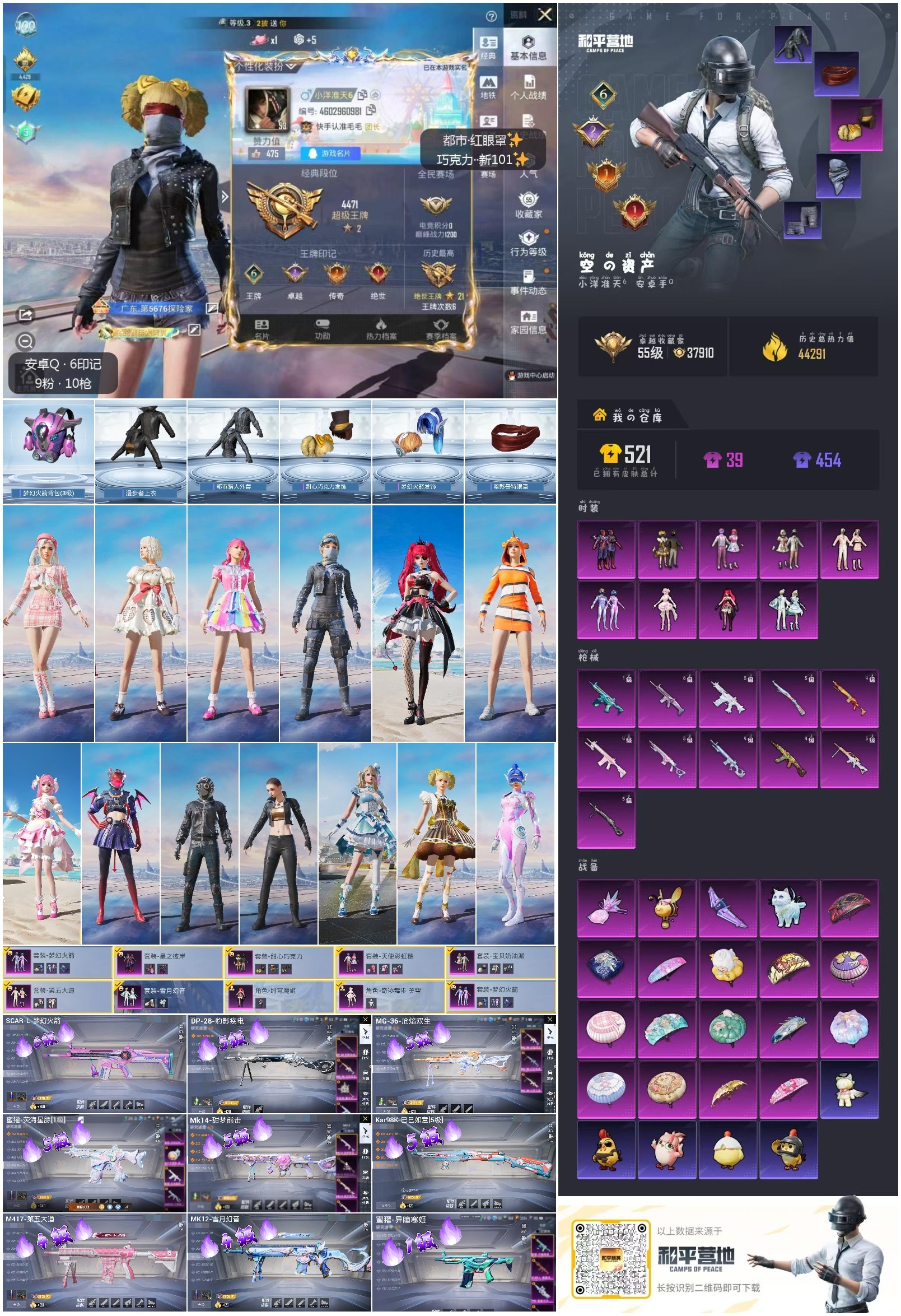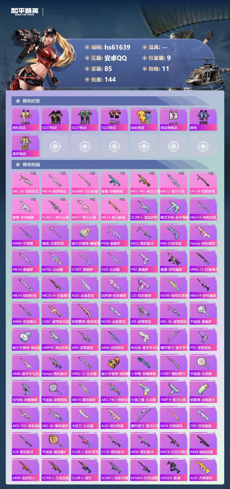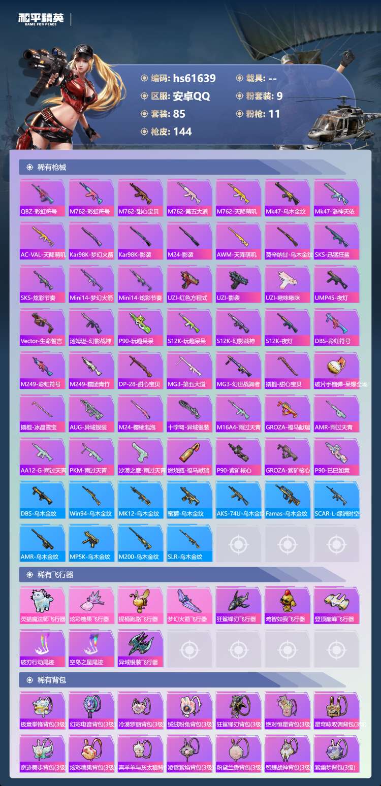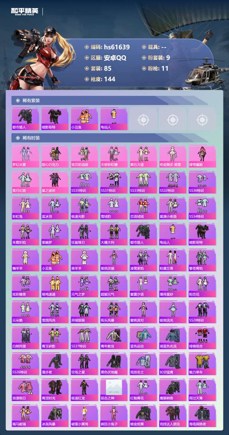hs61639 安卓手Q-6王牌印记-9粉装-11特效枪-44351热力值-85套装-144枪皮-2
