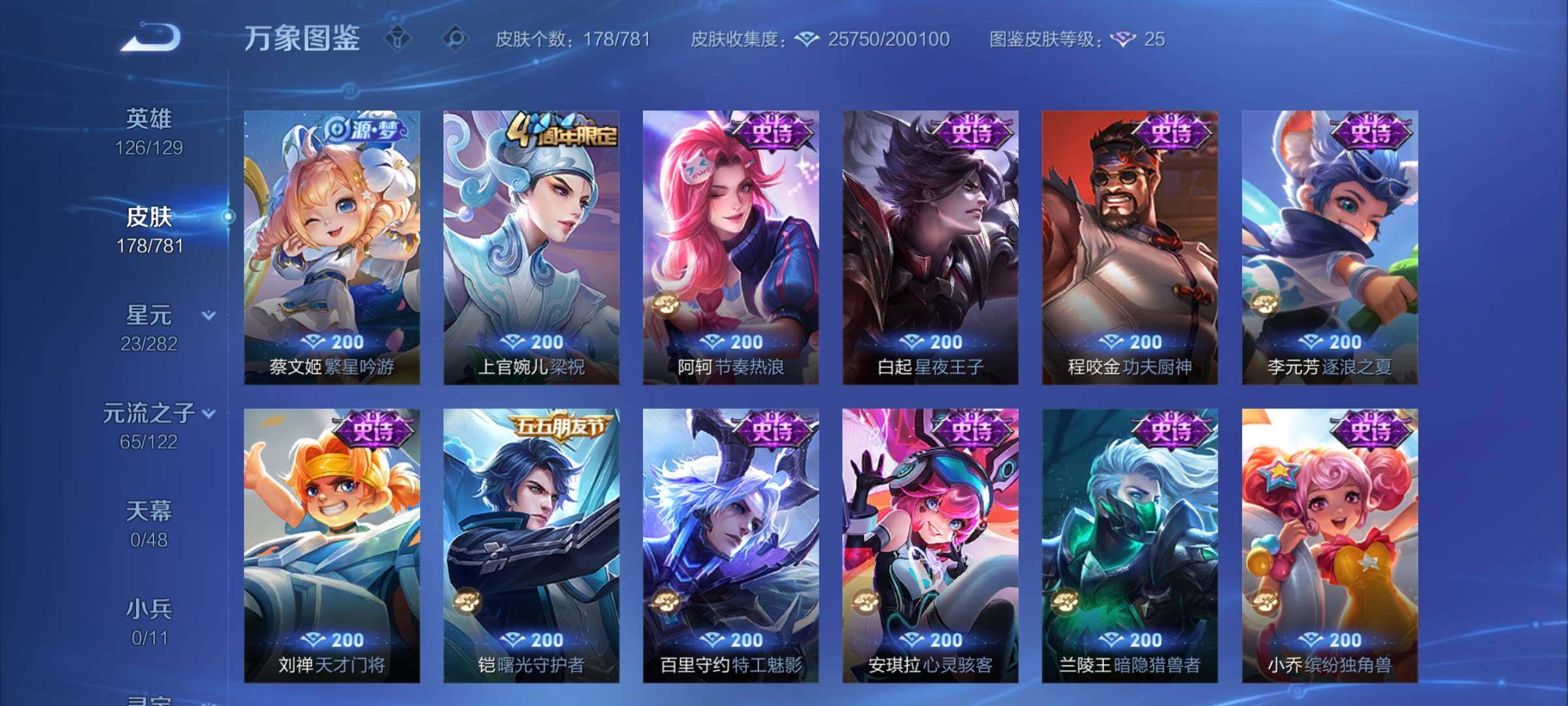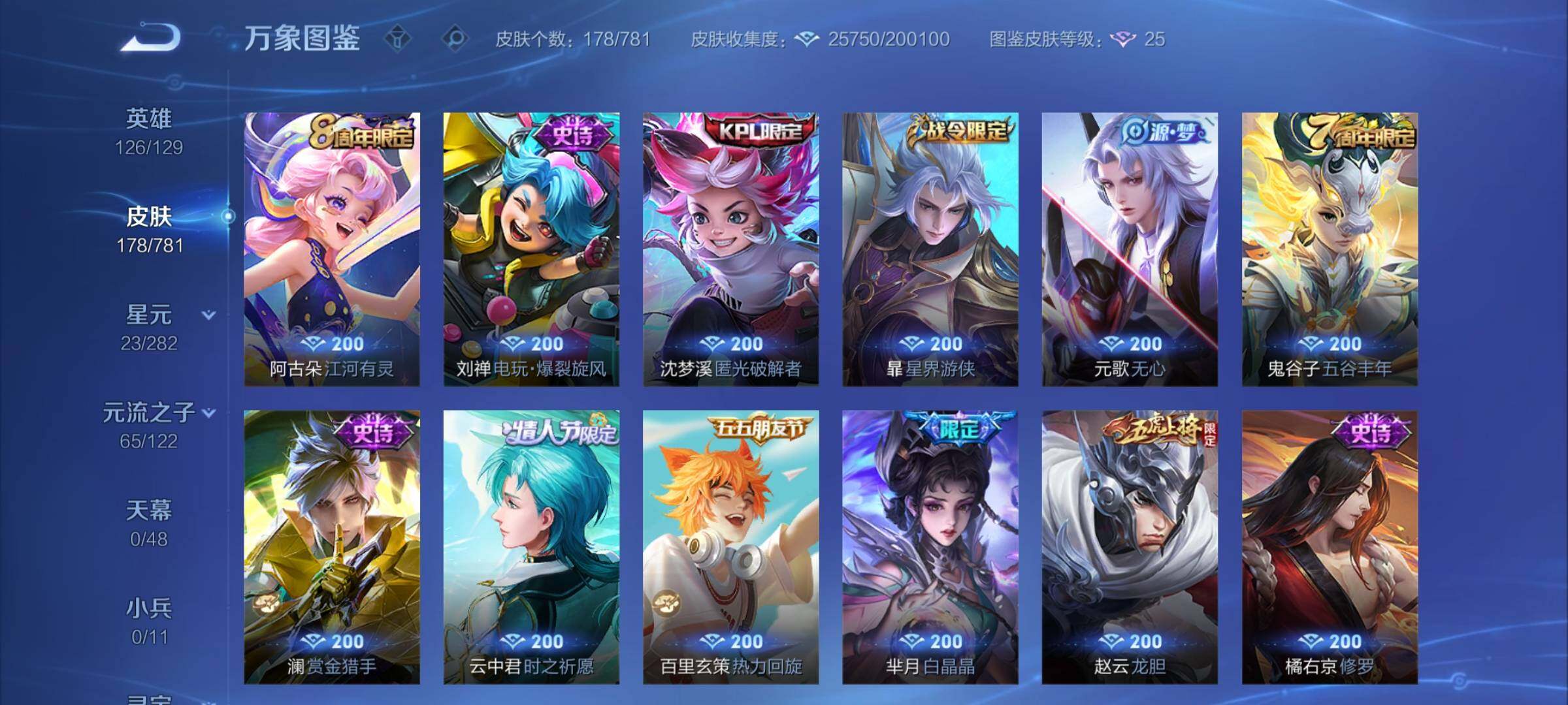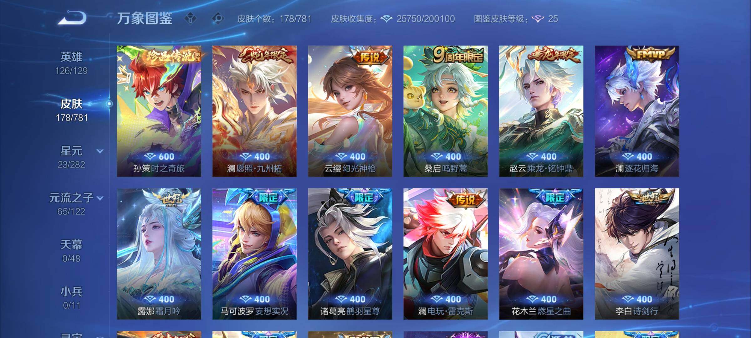 【英雄全皮】:澜全皮【珍品传说】:孙策时之奇旅【传说皮肤】:澜愿照九州拓,云缨幻光神枪,桑启鸣野蒿,赵云乘龙铭钟鼎,澜逐花归海,露娜霜月吟,马可