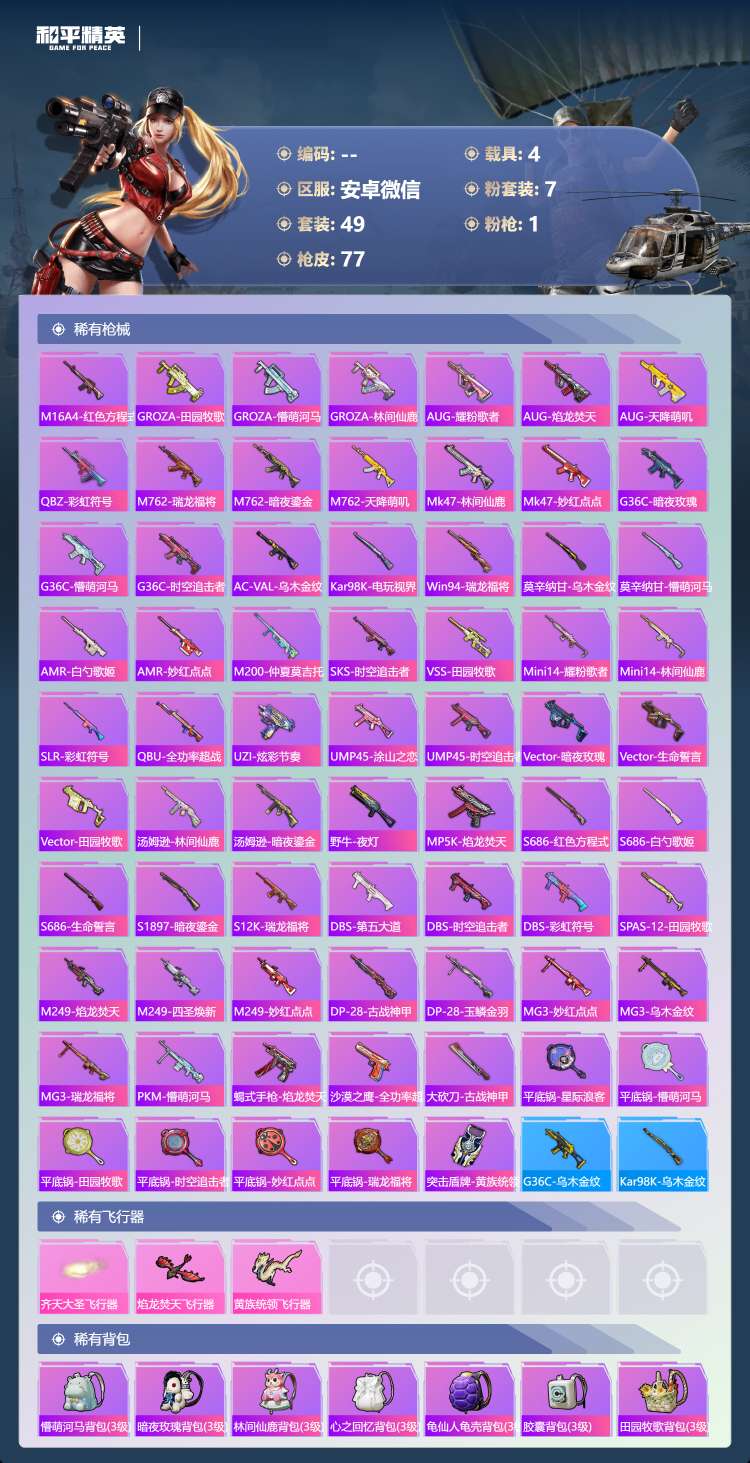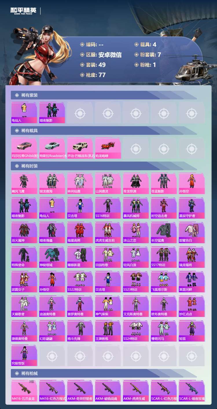 hs62569 安卓微-0王牌印记-7粉装-1特效枪-4载具-28197热力值-49套装-77枪皮