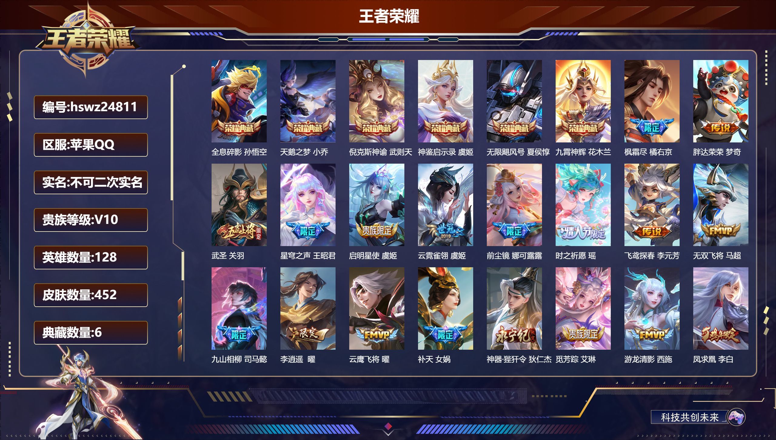 苹果QQ/至圣王者/452皮肤/128英雄/6典藏/0珍品无双/0无双/0珍品传说/52传说/157